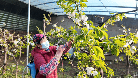 走进温室,一簇簇桃花挂满枝头。工人们正穿梭其间,手持授粉器轻点花蕊。“这是在人工授粉。”合作社理事长朱双民解释道,“不同品种需要不同的花粉量,得‘因花施粉’。”