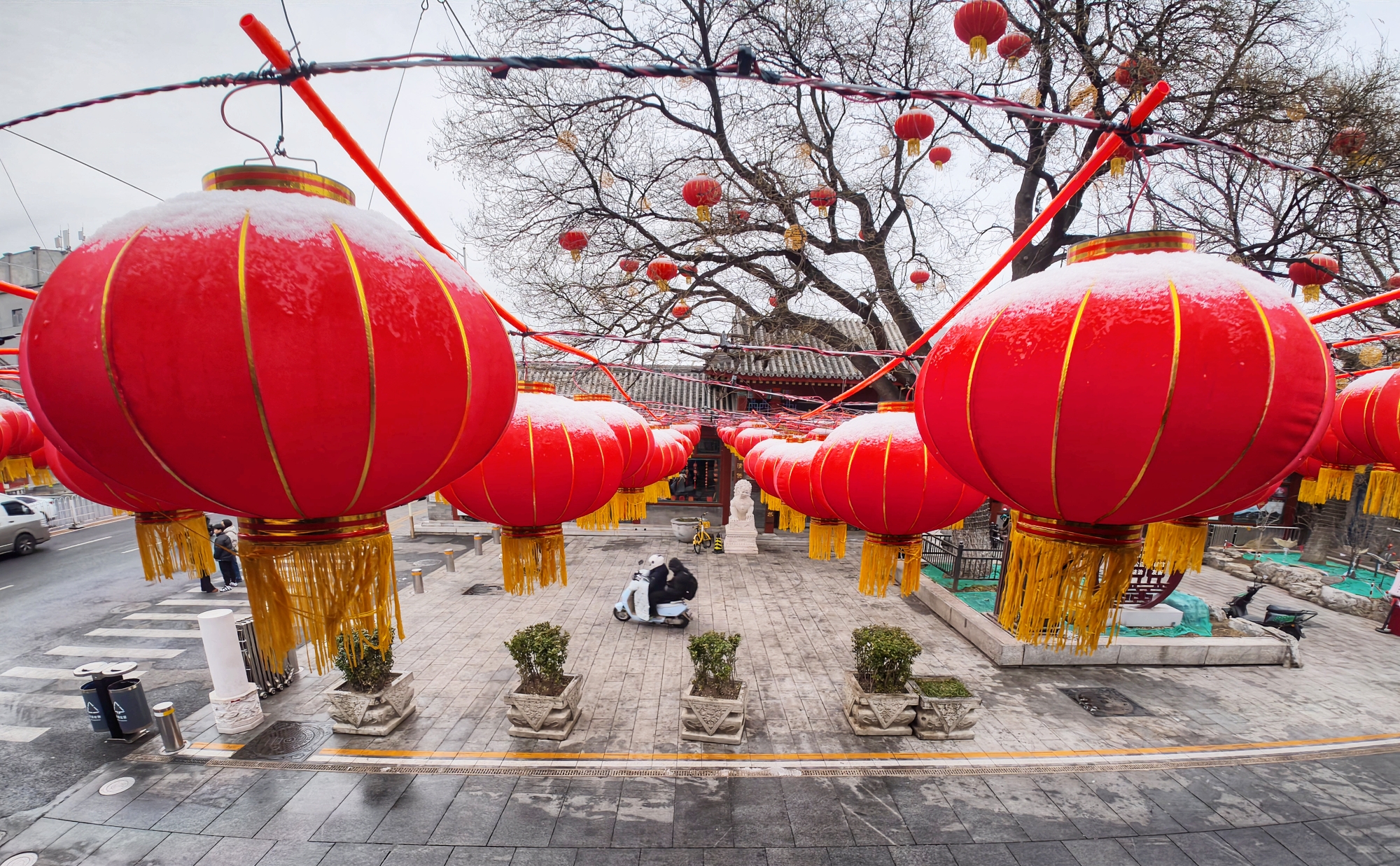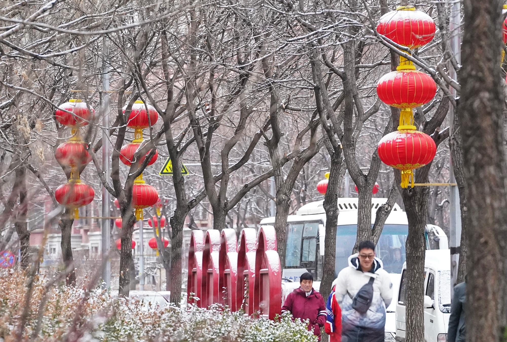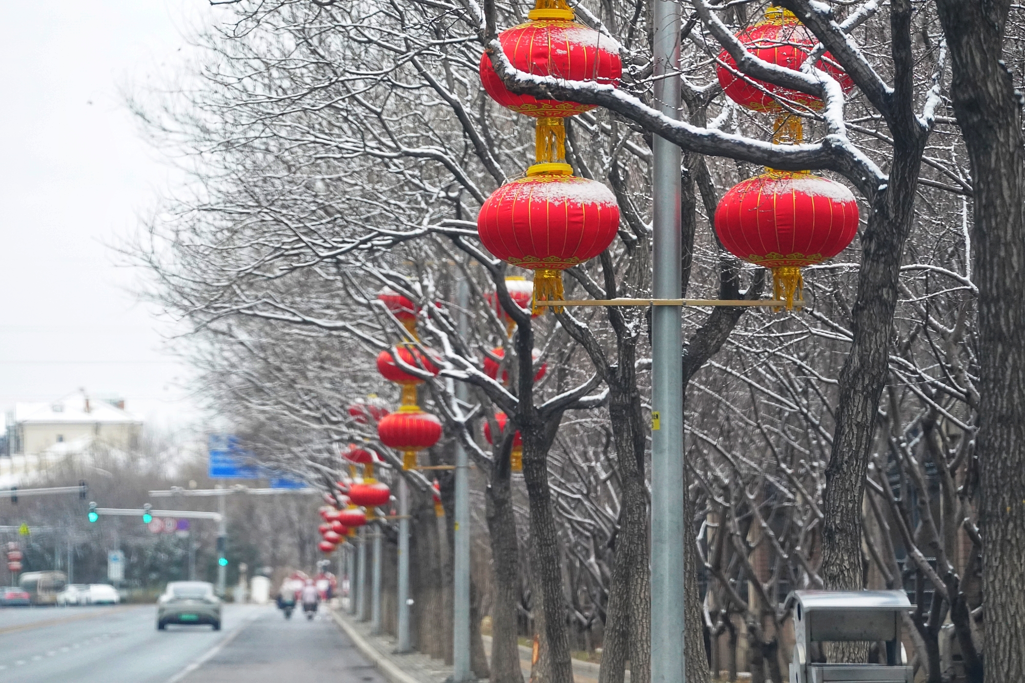 京城街头,白雪与红火灯笼相映成趣,年味未散,春意渐生,春雪为新春添上一抹温润亮色。