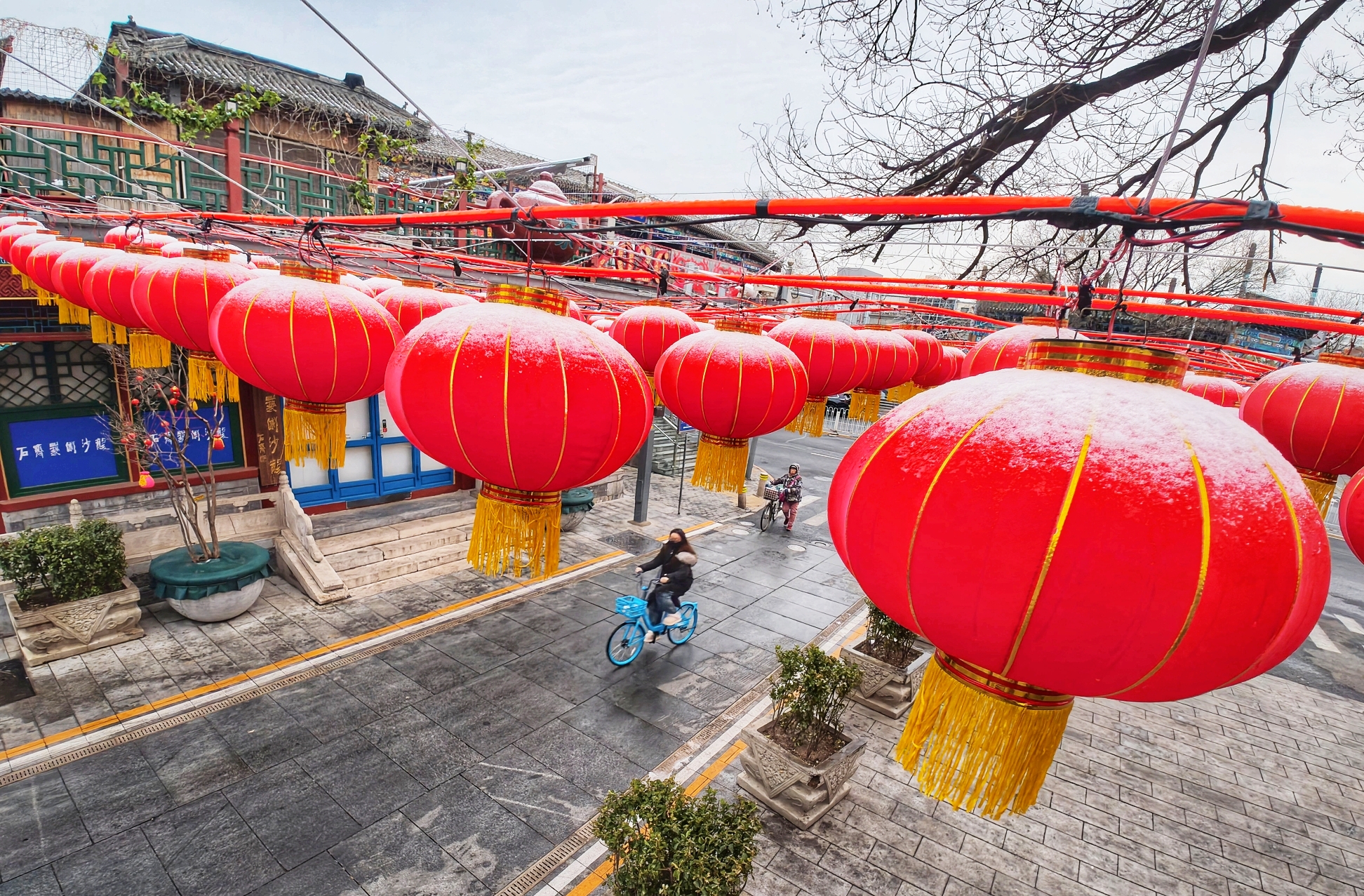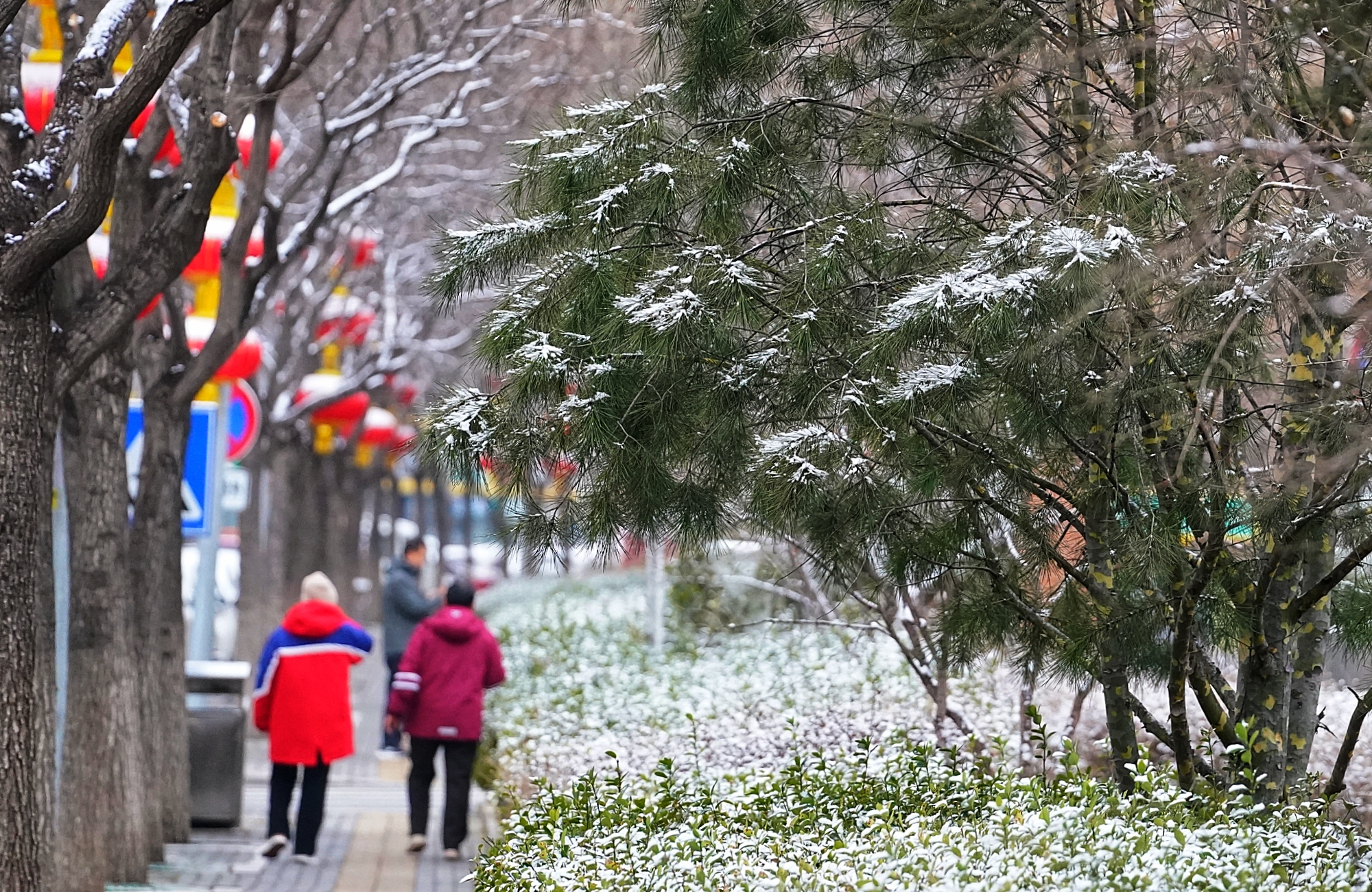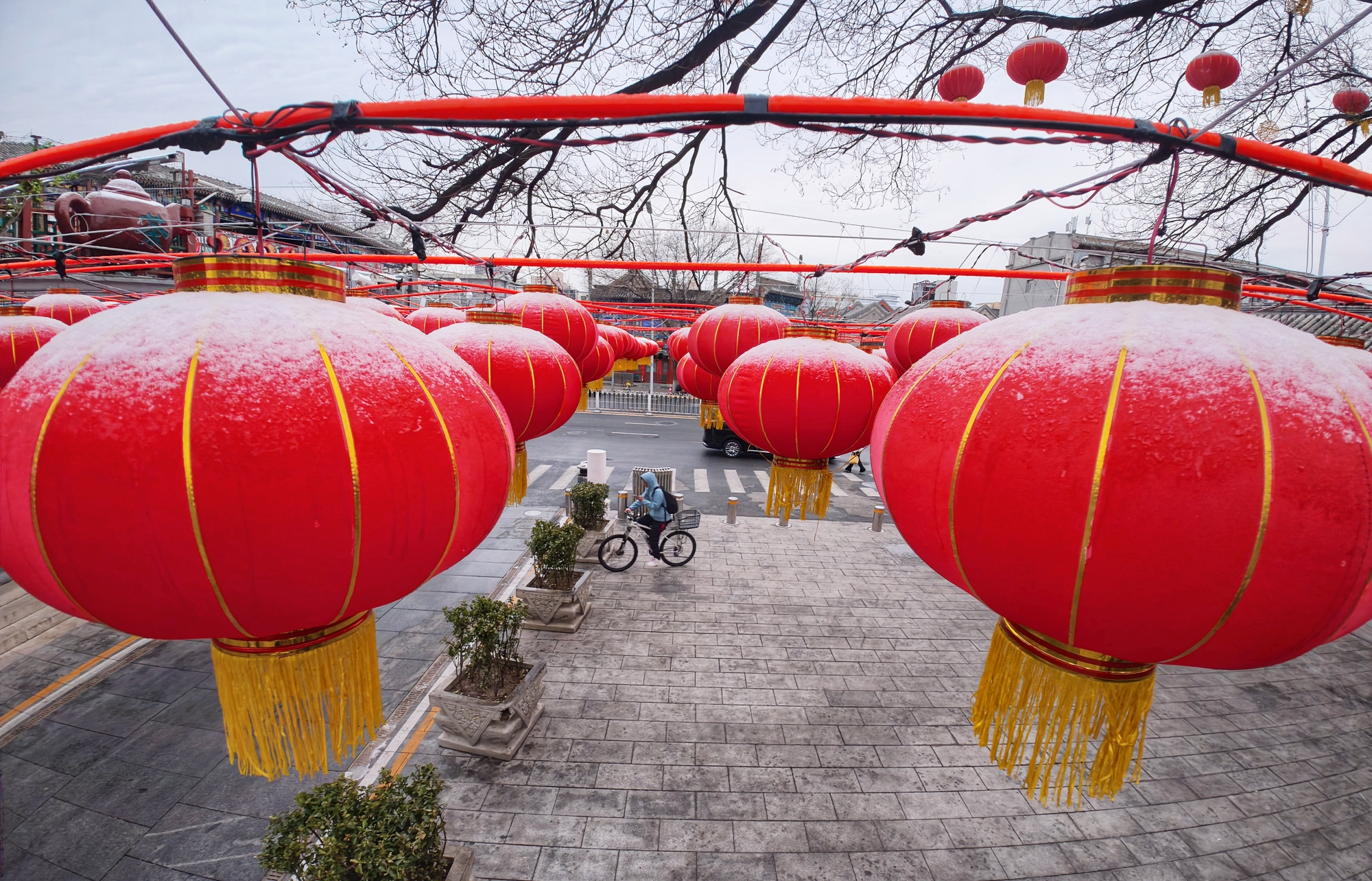 京城街头,白雪与红火灯笼相映成趣,年味未散,春意渐生,春雪为新春添上一抹温润亮色。