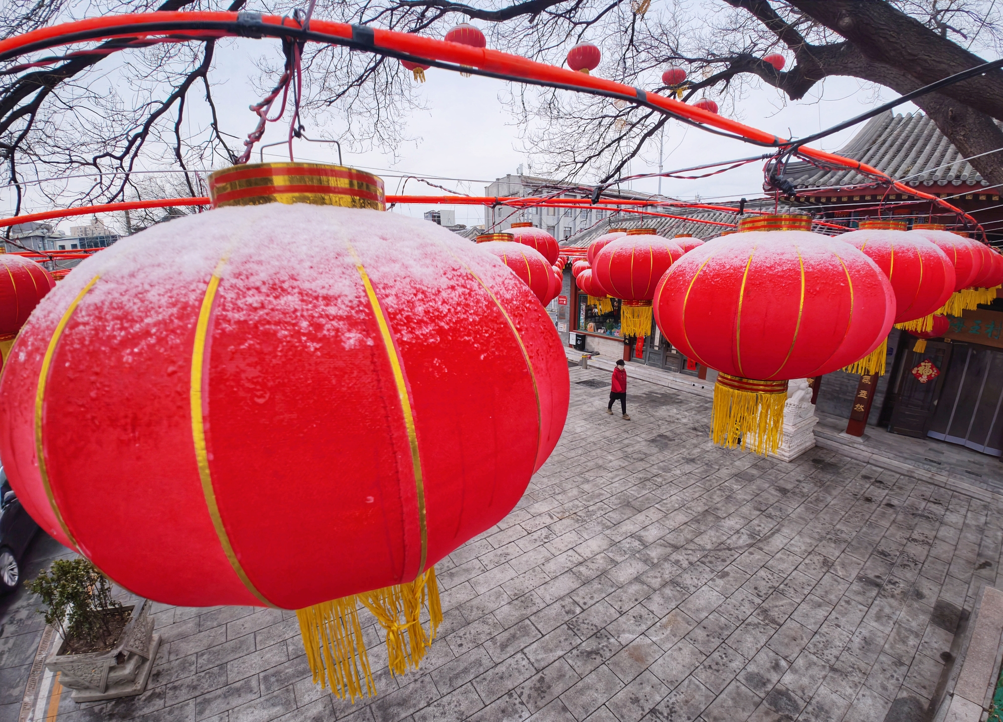 一场春雪悄然而至,清晨为京城披上素白轻纱。枝头、檐下,串串红灯笼在白雪映衬下勾勒出“瑞雪兆丰年”的诗意画面。