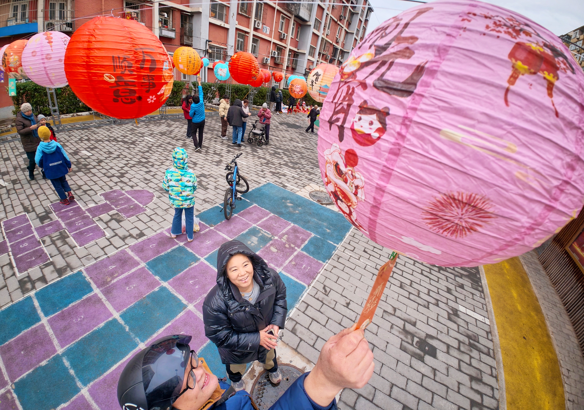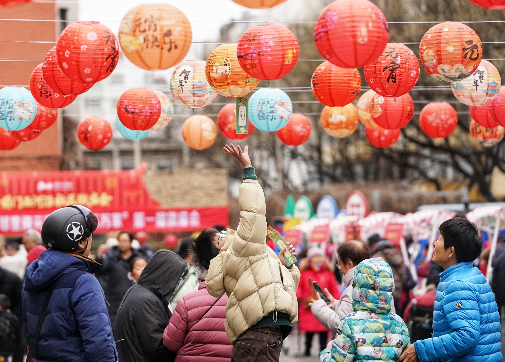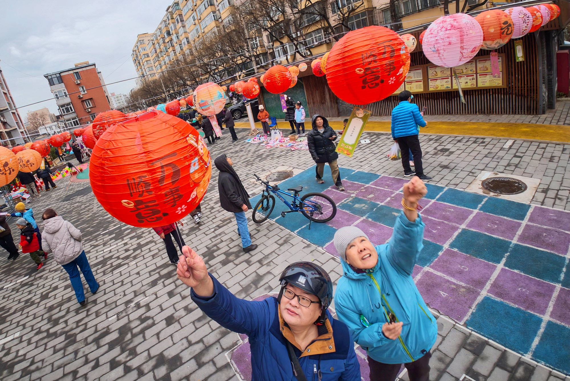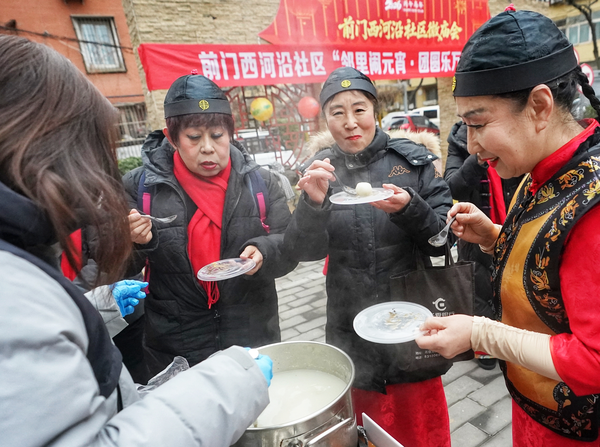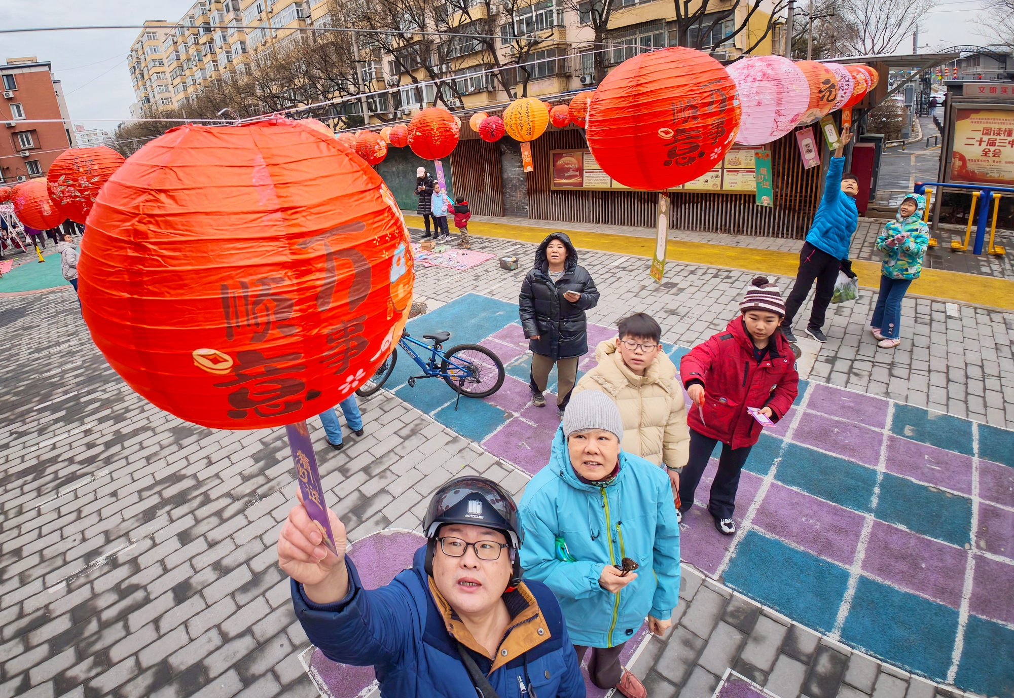 2月27日,西城区大栅栏街道前门西河沿社区“邻里闹元宵·团圆乐万家”首届微庙会在社区小广场热闹开场。社区居民欢聚一堂,沉浸式体验猜灯谜、摇元宵、投铜币等传统民俗,共庆元宵佳节。