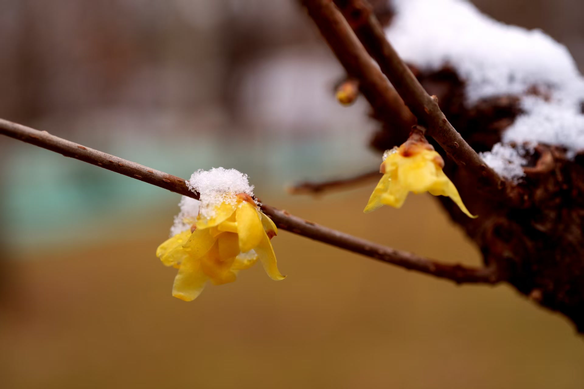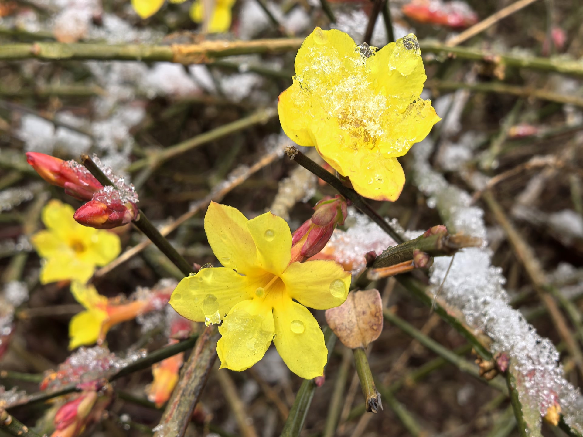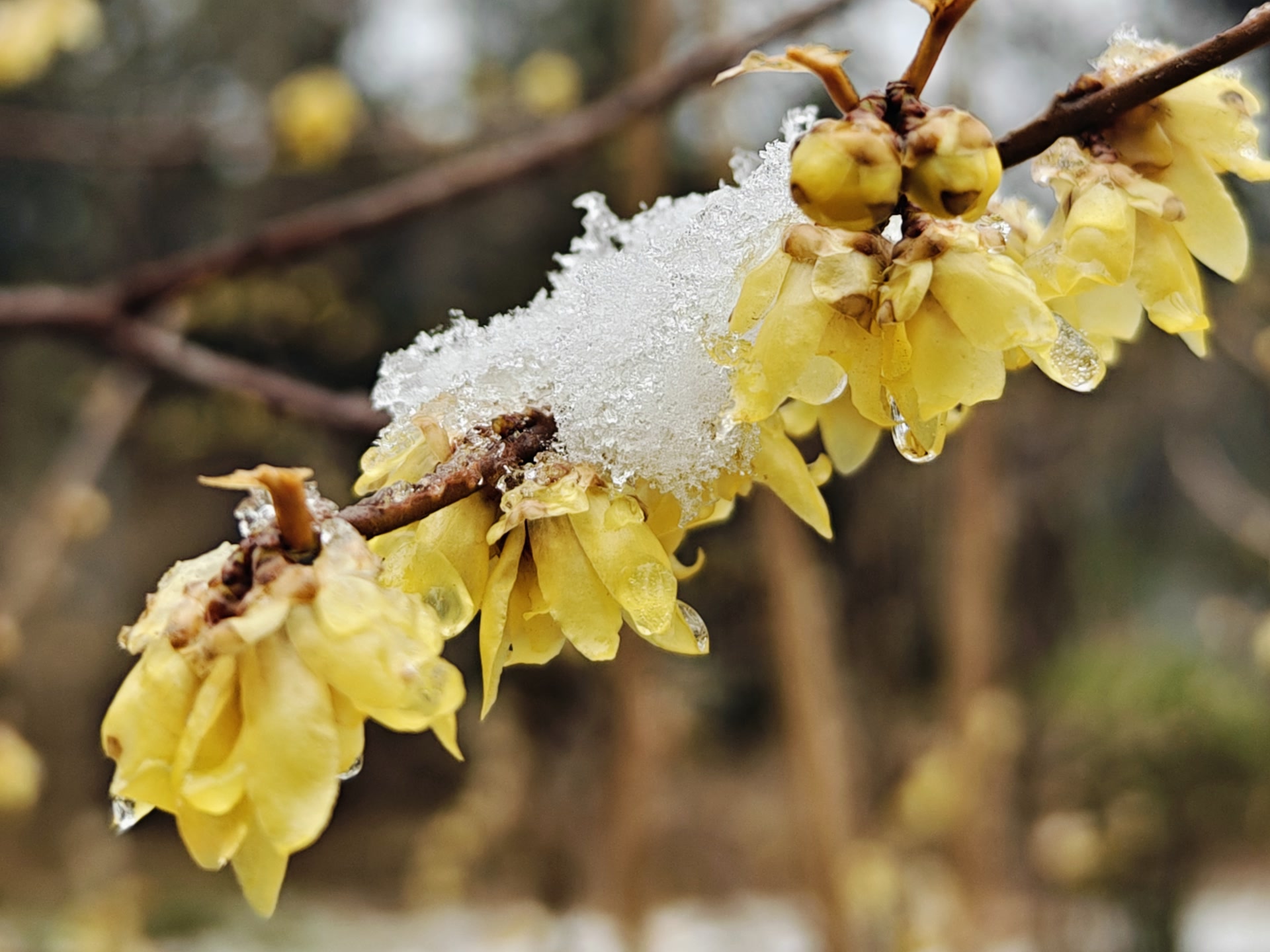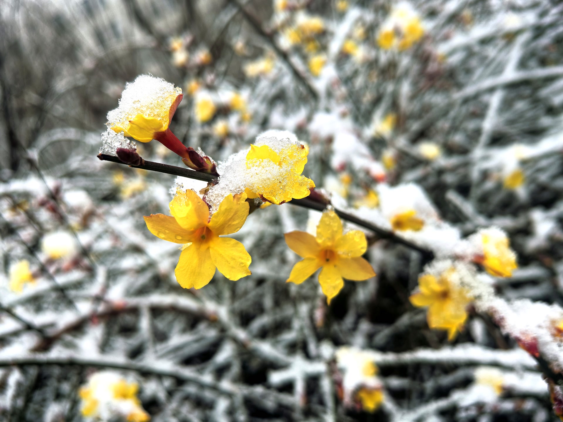 迎春伴蜡梅,雪中共芳菲,寒枝藏秀色,春意满枝头