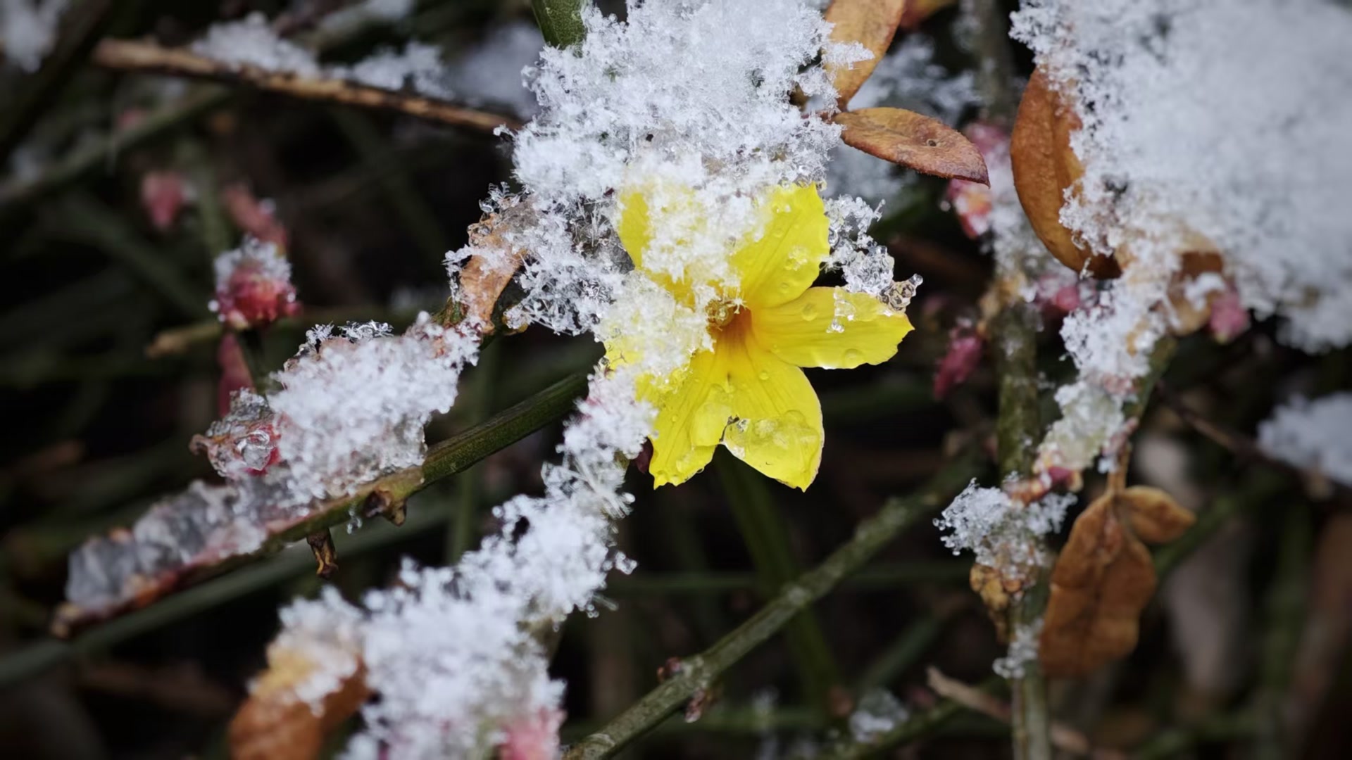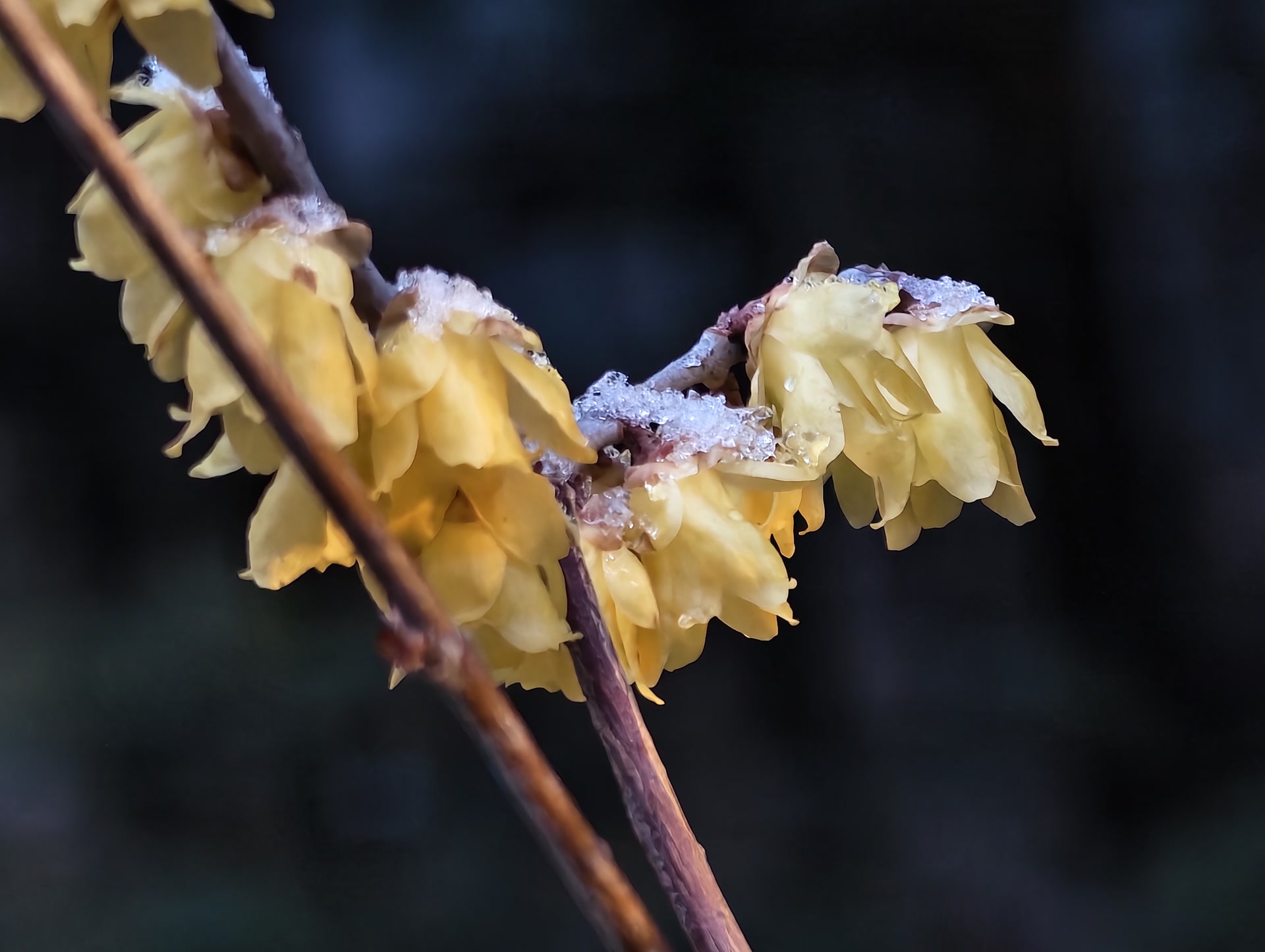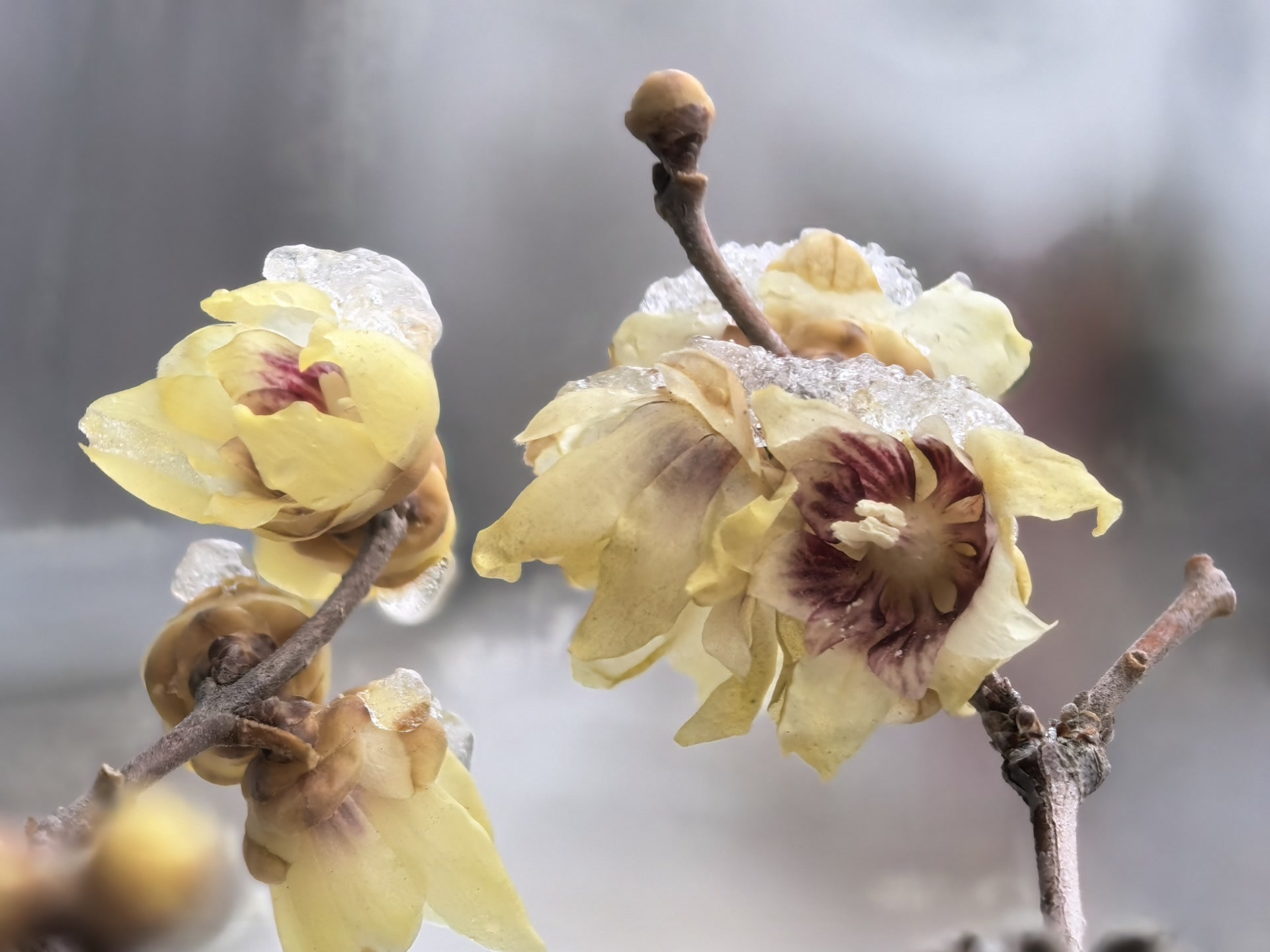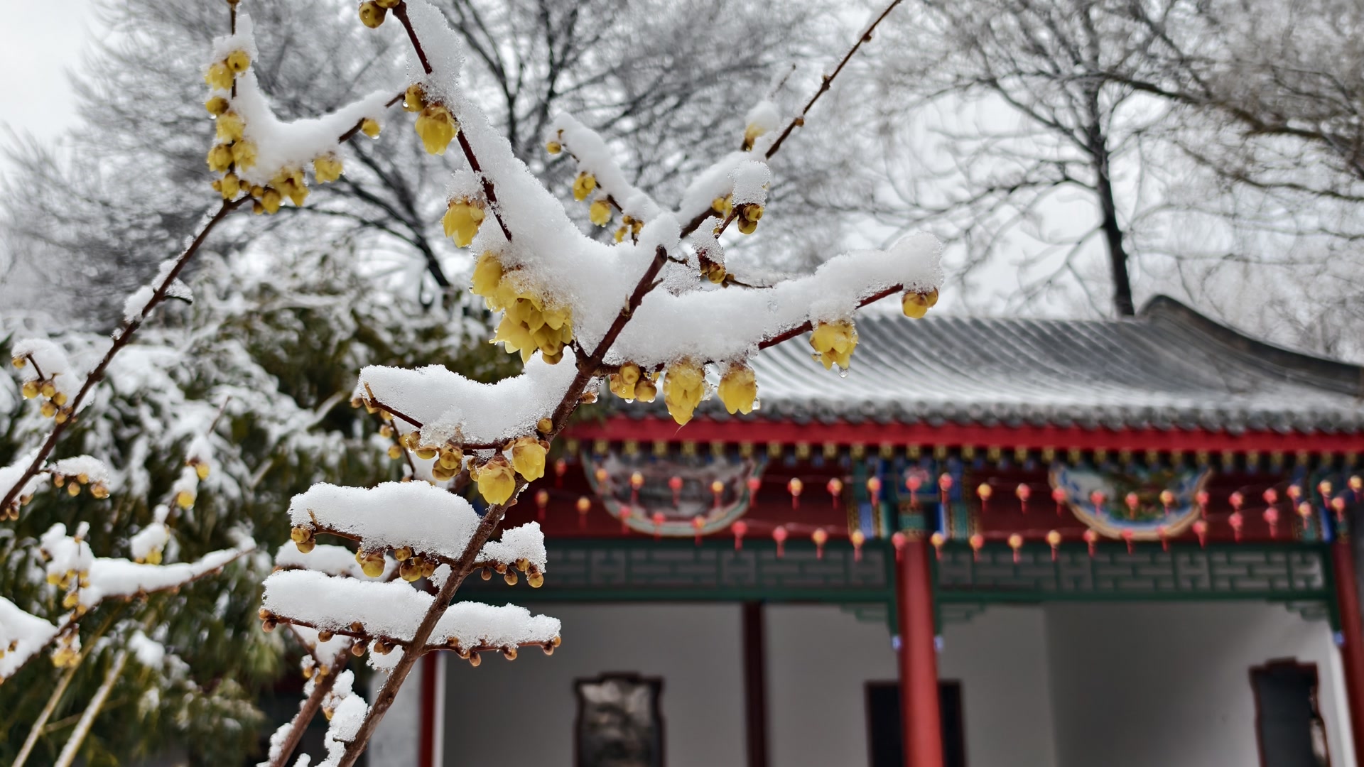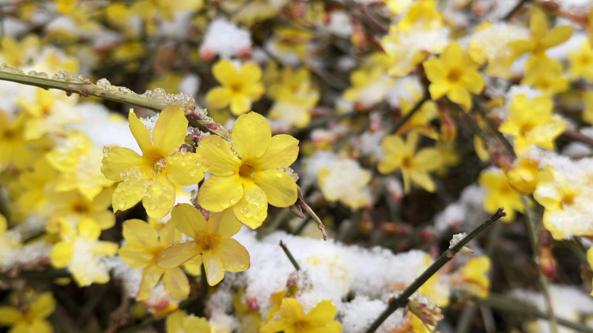 迎春伴蜡梅,雪中共芳菲,寒枝藏秀色,春意满枝头