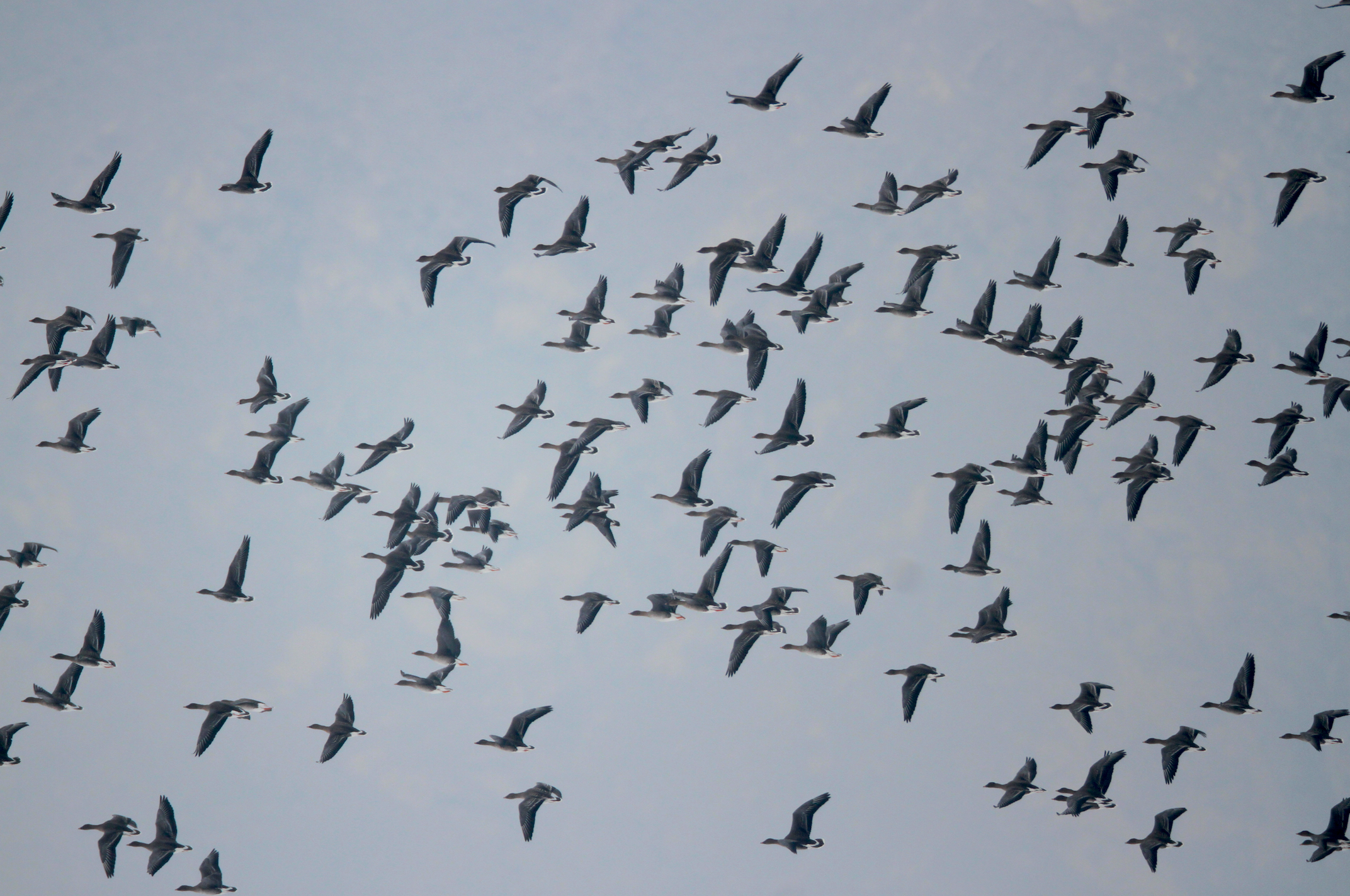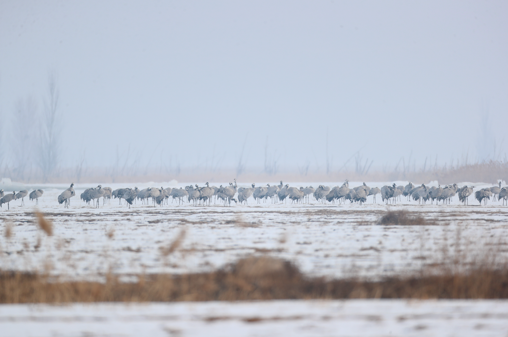 数量最多的是灰鹤,目前共有6800多只,它们在周边的农田里寻找食物,鸣叫声极具穿透力。