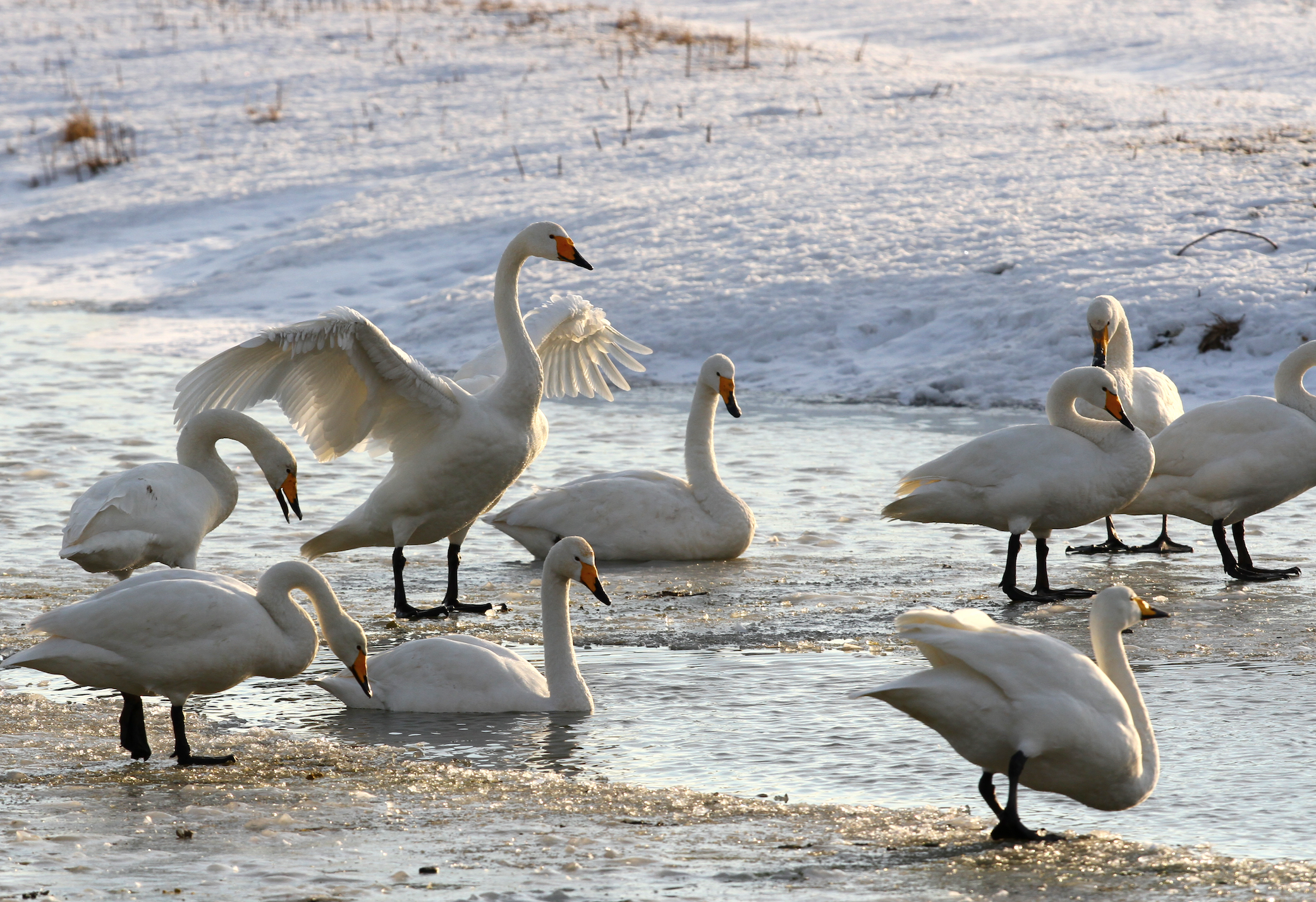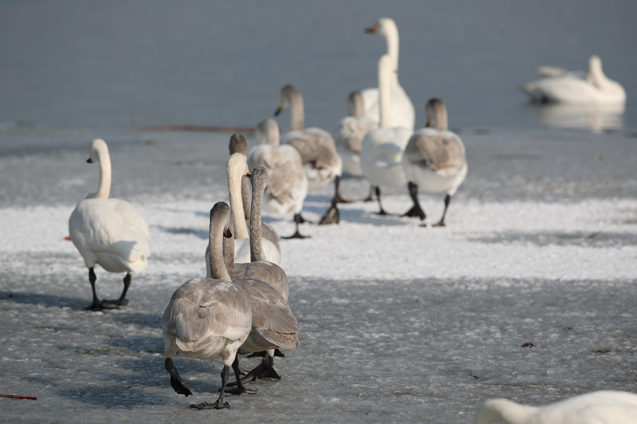 春节前,北归候鸟的先头部队就已经抵达,都是身强体壮的成年候鸟。“这两天,拉家带口的天鹅来了,它们的带崽量很大,一对父母带四五只灰色的亚成体宝宝。”站长李理介绍,目前,库区共计有大天鹅74只、小天鹅88只,天上还有一些正在陆续降落。天鹅很忙,既要带队觅食,也要教孩子生存本领,“它们精神头不错,胖乎乎的,毛色鲜亮。”