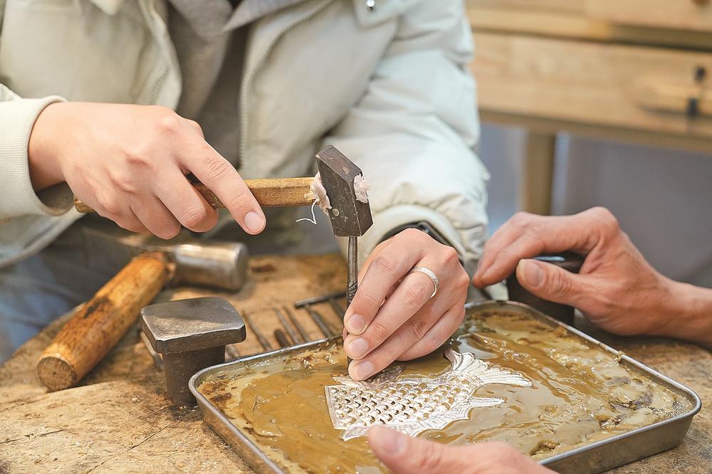 “在银箔上画好鳌鱼的线稿,是錾刻的基础,一定要细致再细致。”“錾刻时,左手要稳如磐石,右手用力要精准巧妙……”工作间里,林忠秋正手把手地指导儿子林贞盛。父亲耐心十足,倾囊相授;儿子勤学好问,细心揣摩。锤錾交击的叮当声,仿佛成了两代人之间无声的交流与对话。
