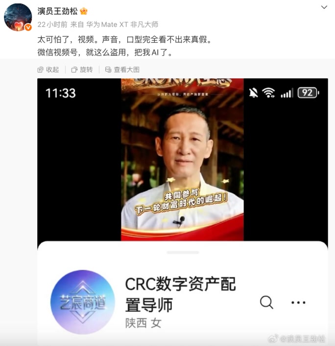 近日,知名演员王劲松发文控诉自己的形象被AI盗用生成视频,连其家人都难分真假,“太可怕了”。尽管通过投诉相关视频最终被删除,但他仍担心,“谁能保证,这种钻法律空子的擦边球,最后不沦为犯罪手段?”