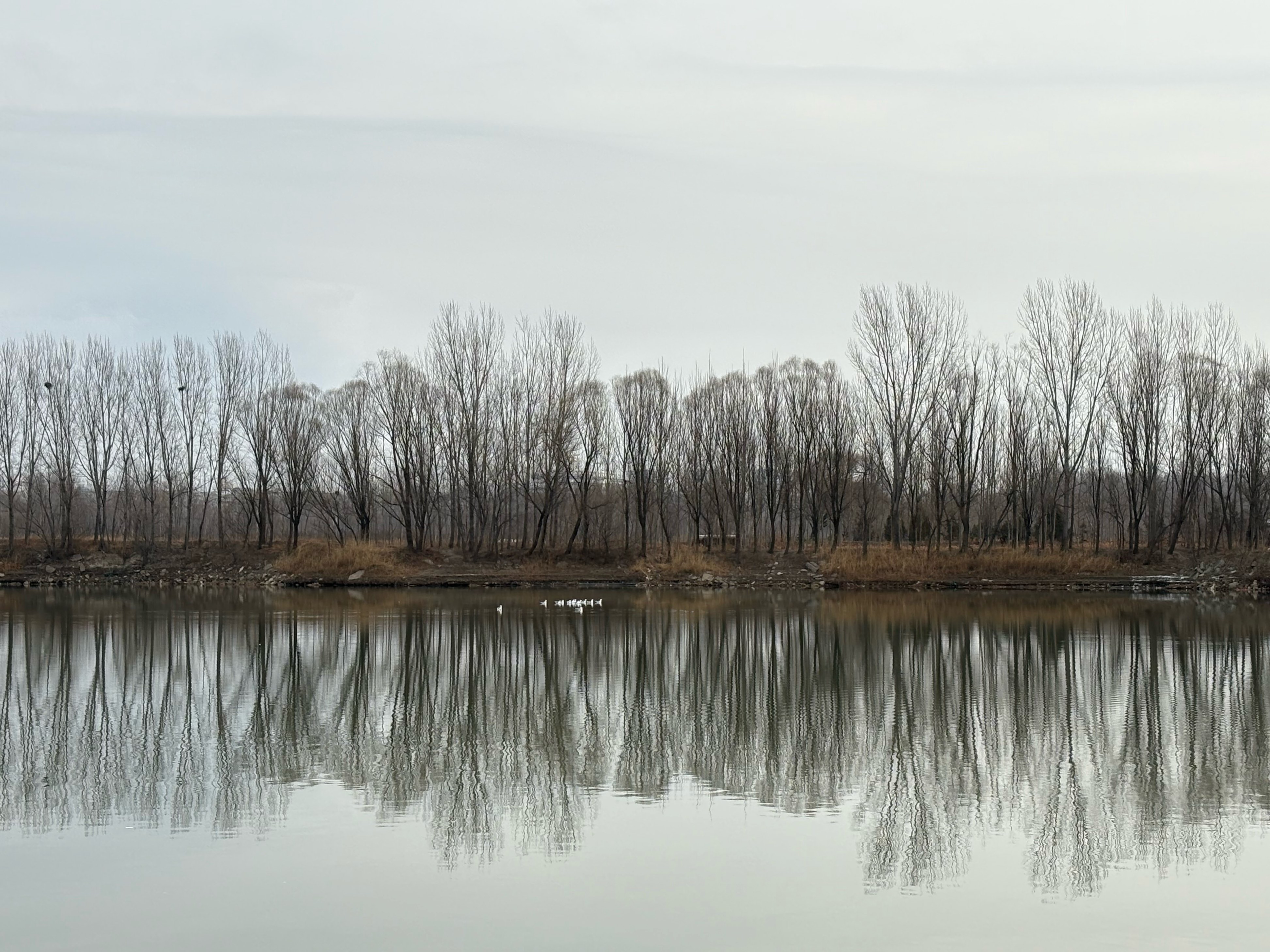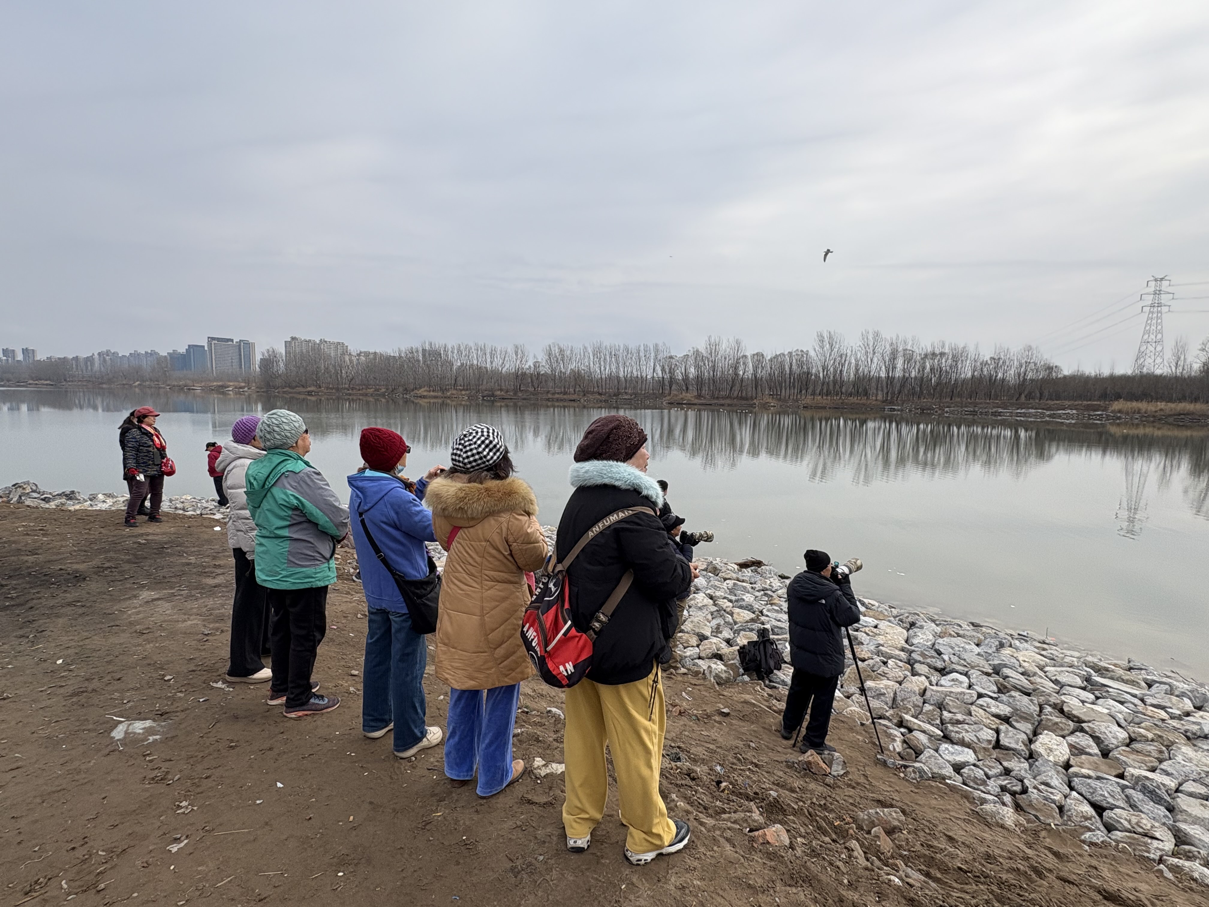 一场小雪拦不住鸟友们的热情,早上9时,摇不动村就开始堵车了。潮白河水面开阔,少说有三四十只白色的鸟,有的张开翅膀在空中翱翔,有的静静窝在水面上。