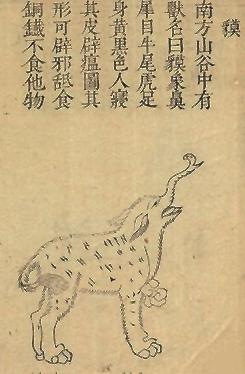 综上,“驺虞”有仁兽名、兽官名、乐曲名、幡旗名、地域名和古币名。作为动物名称时,具有传说中祥瑞、珍奇之兽的品格,其形象特征是“若虎”“白质黑章”“尾长于身”“不食生物”“食自死之肉”“日行千里”“义兽”“仁兽”。