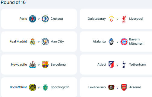 本赛季欧冠1/8决赛完整对阵: