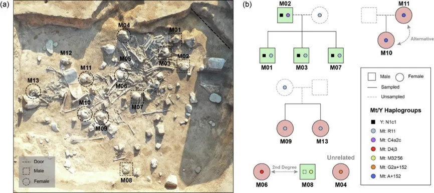 此外,考古学家在四台蒙古营遗址发现了居室葬的现象,通过古DNA亲缘关系鉴定,研究团队重建了埋藏在同一房址中的个体之间的家庭关系网络:其中包括一位父亲与他的三个亲生儿子、一对母女以及一对亲姐妹。这一发现为理解该遗址的社会结构提供了直接的生物学证据。