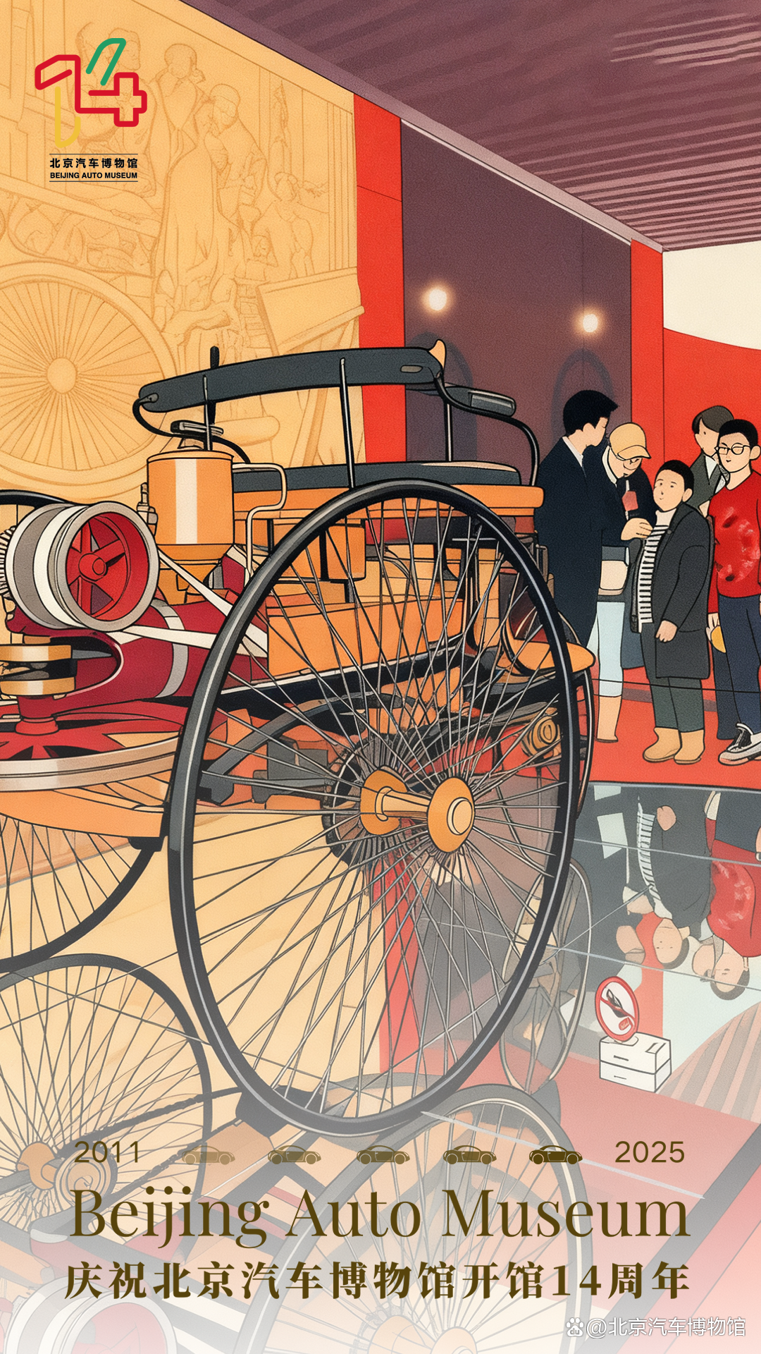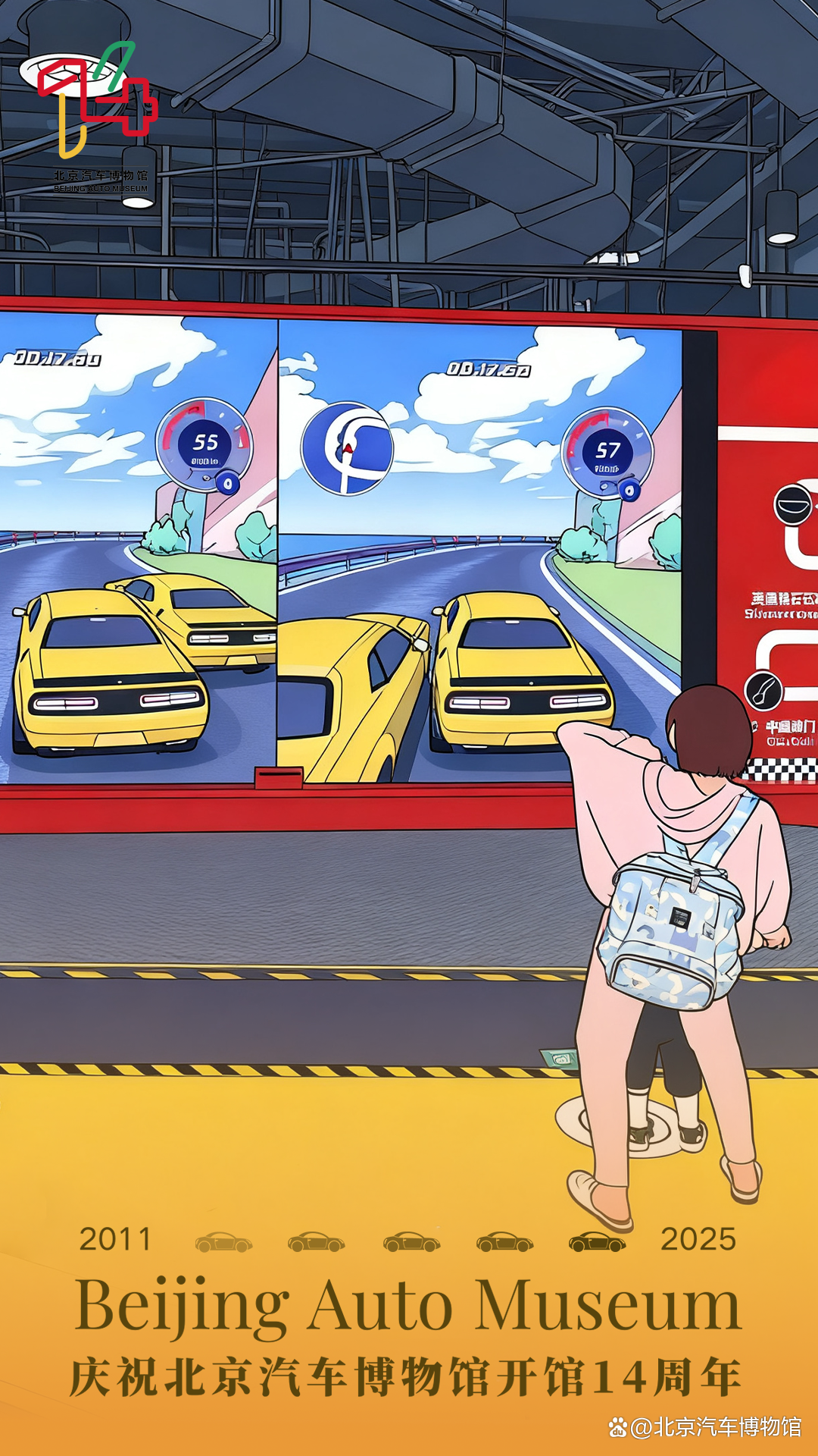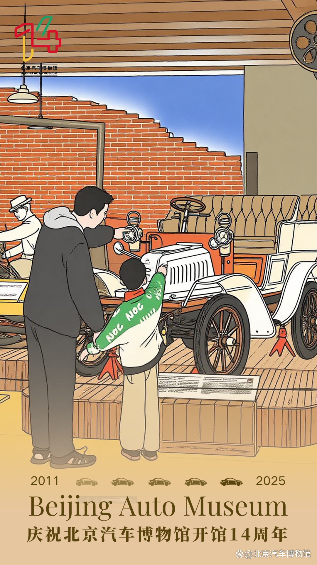 北京汽车博物馆此次入围的“14周年系列海报”,以庆祝开馆十四周年为主题,围绕“我和心动馆藏车的故事”这一核心理念展开设计。作品采用观众在博物馆游览时拍摄的真实照片作为视觉基底,并借助AI图像生成技术,将实景照片转化为生动活泼的插画风格,实现了观众情感记忆与艺术表达的有机融合。