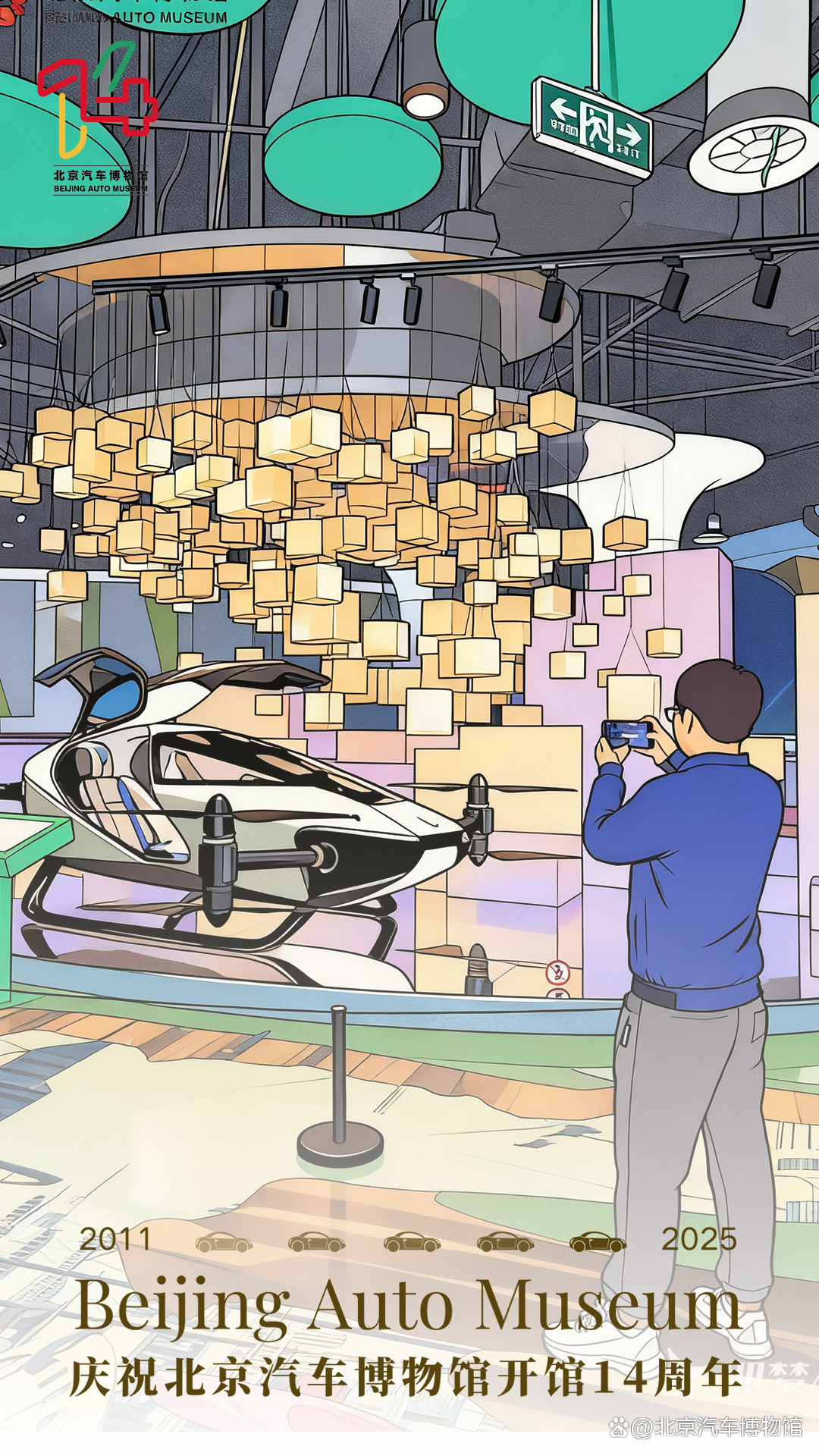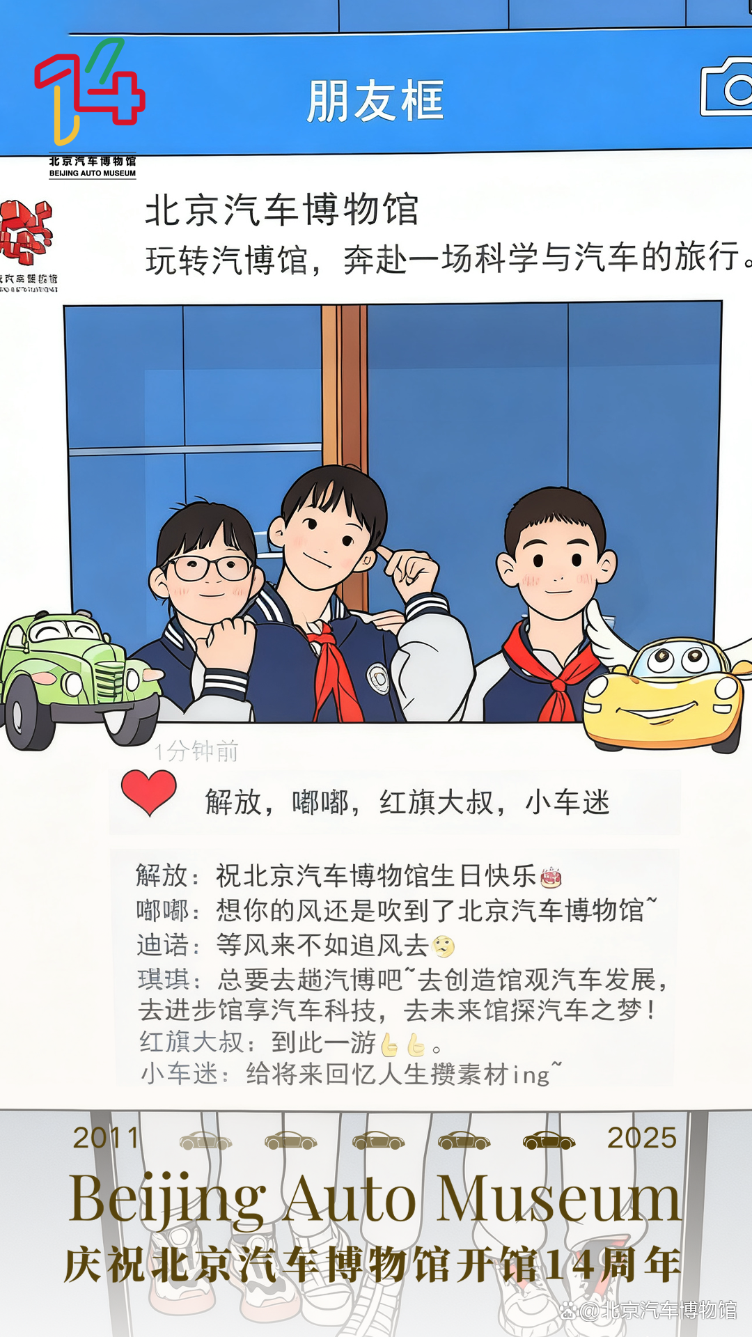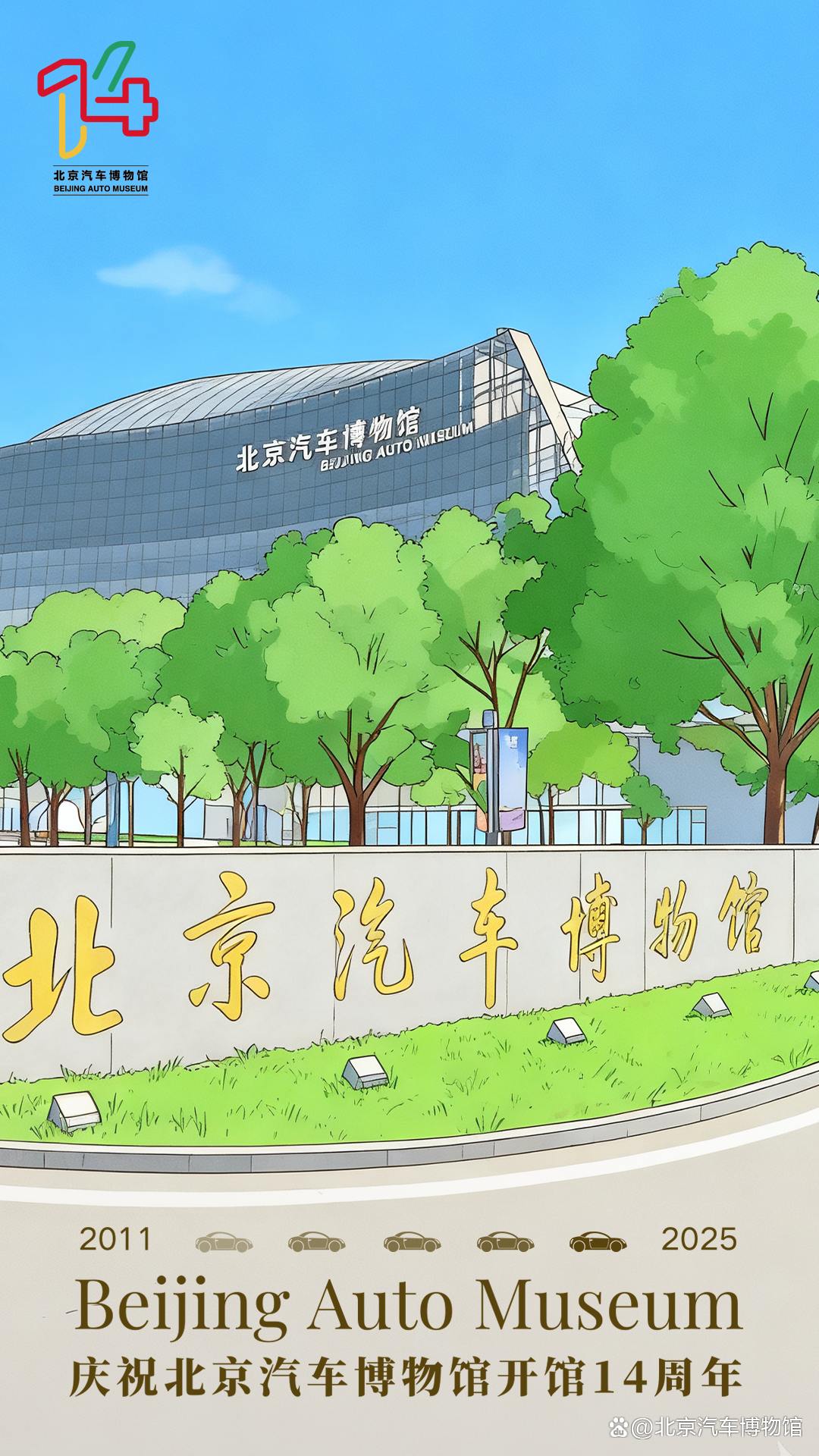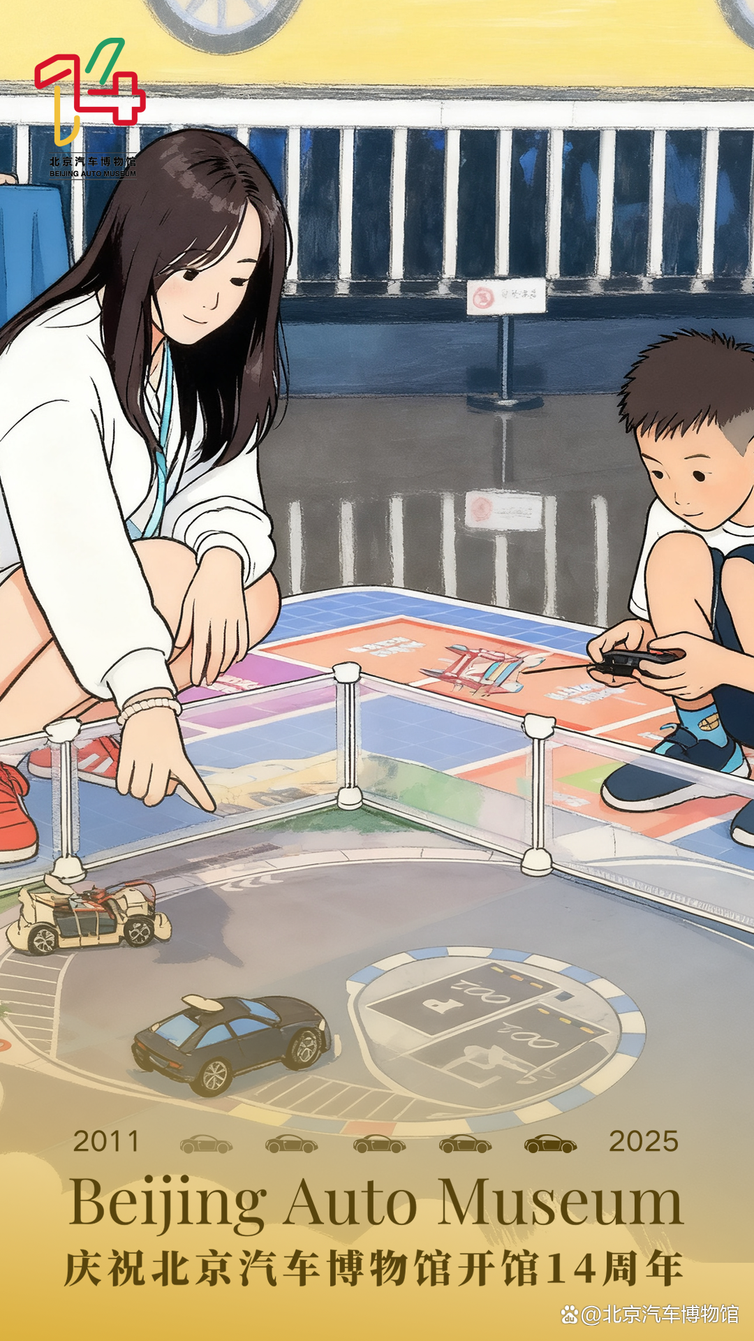 北京汽车博物馆此次入围的“14周年系列海报”,以庆祝开馆十四周年为主题,围绕“我和心动馆藏车的故事”这一核心理念展开设计。作品采用观众在博物馆游览时拍摄的真实照片作为视觉基底,并借助AI图像生成技术,将实景照片转化为生动活泼的插画风格,实现了观众情感记忆与艺术表达的有机融合。