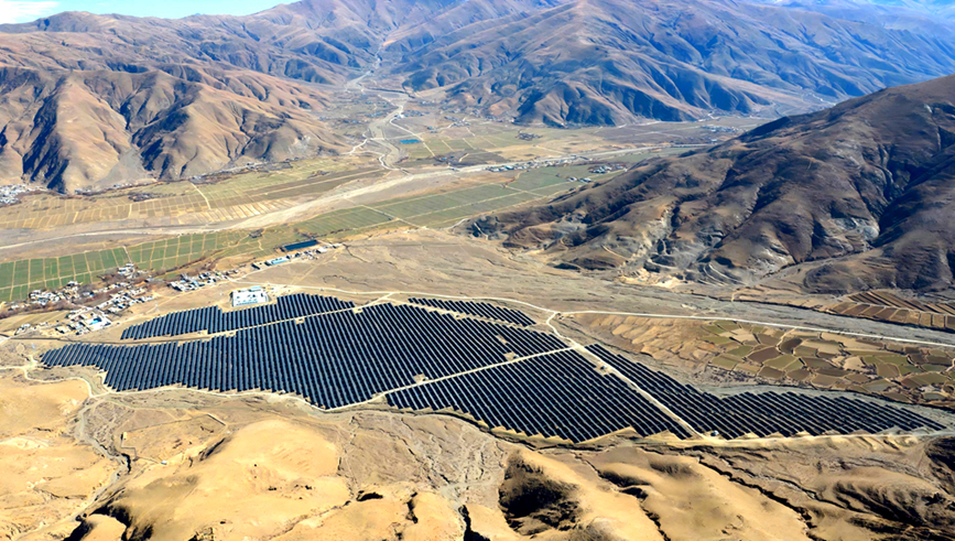 雅鲁藏布江畔,光伏“蓝海”覆盖昔日沙丘。人民网记者 吴雨仁摄