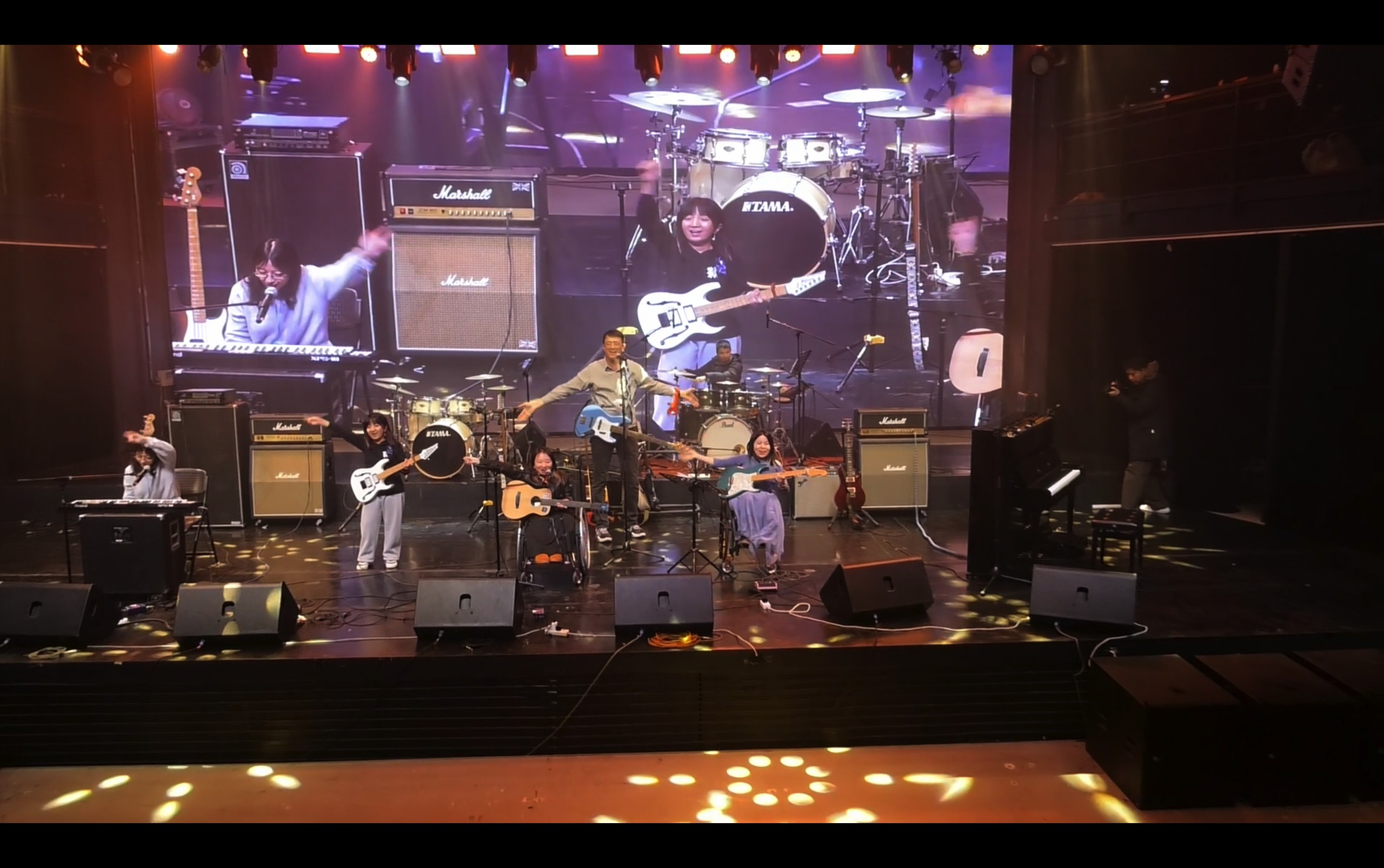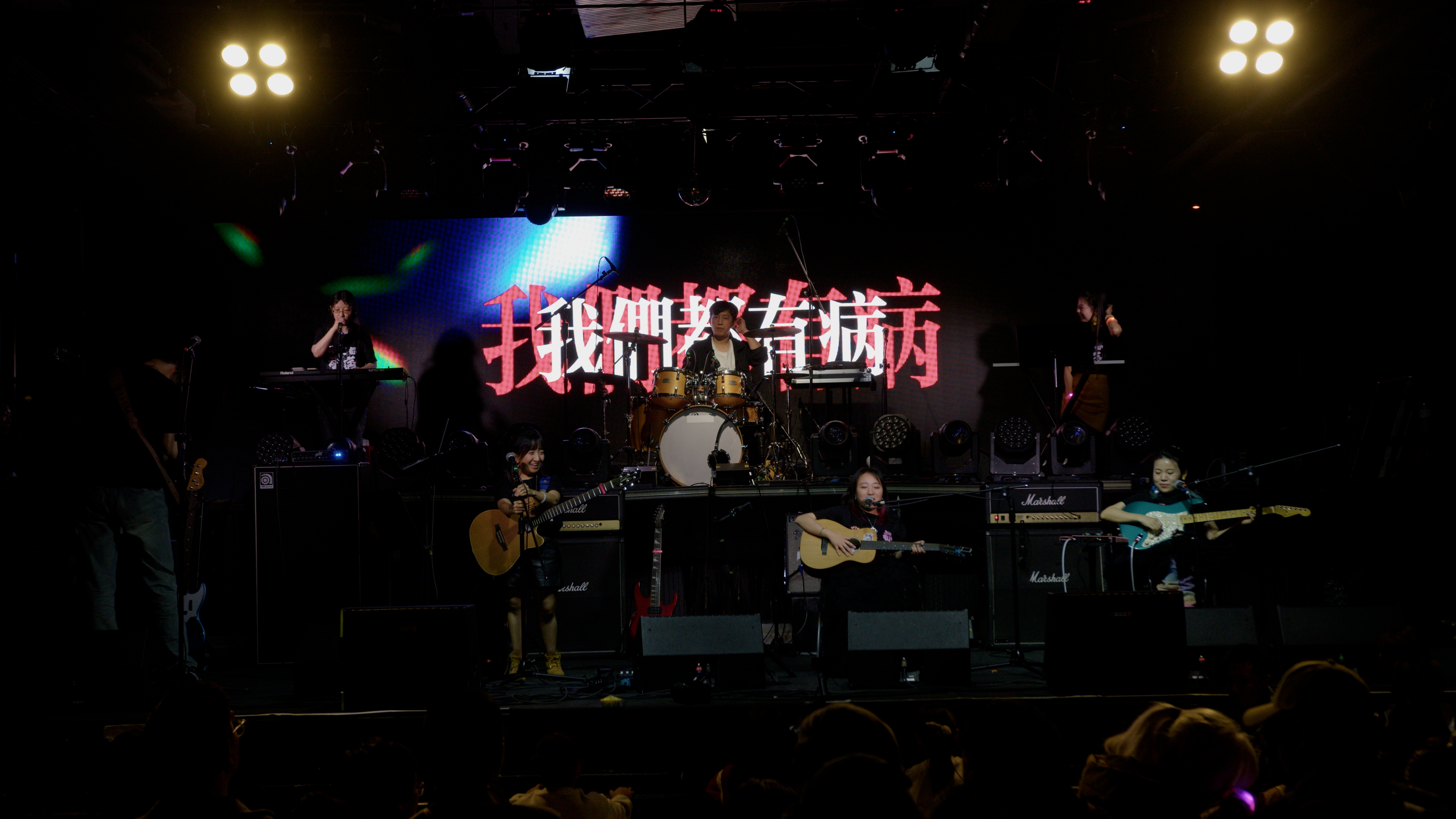 舞台上,7位成员“高低错落”地呈现在观众面前。他们之中,有因成骨不全症(又称瓷娃娃病)而需要坐在轮椅上的吉他手,也有因马凡综合征导致身高接近两米的贝斯手。视觉上的高度落差,丝毫不影响他们在音乐上的默契表达,带给观众听觉的享受。当晚,乐队的新歌老歌轮番登场,每一段旋律、每一句歌词都传递着他们内心最真实的声音。陪伴乐队十年、一直义务辅导成员做音乐的天空乐队队长马歌也带着乐队和学生前来助阵,在现场掀起一阵高潮。
