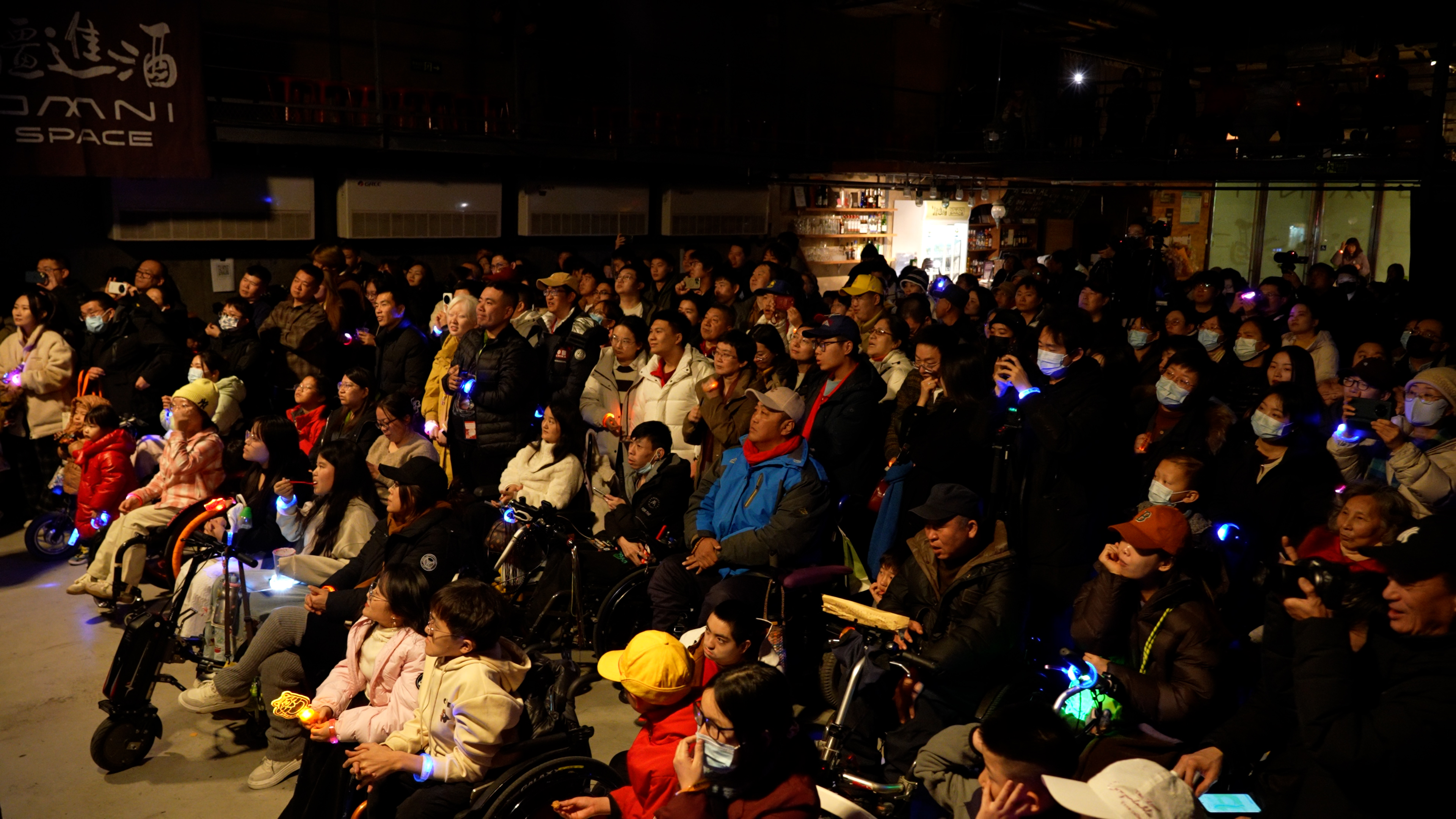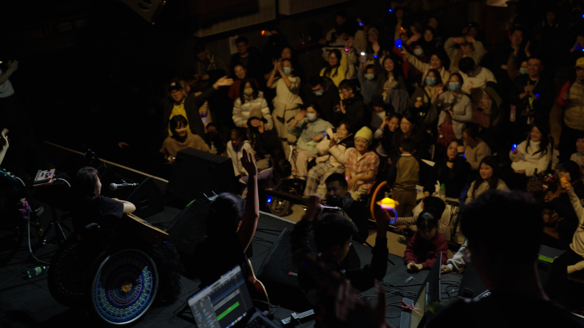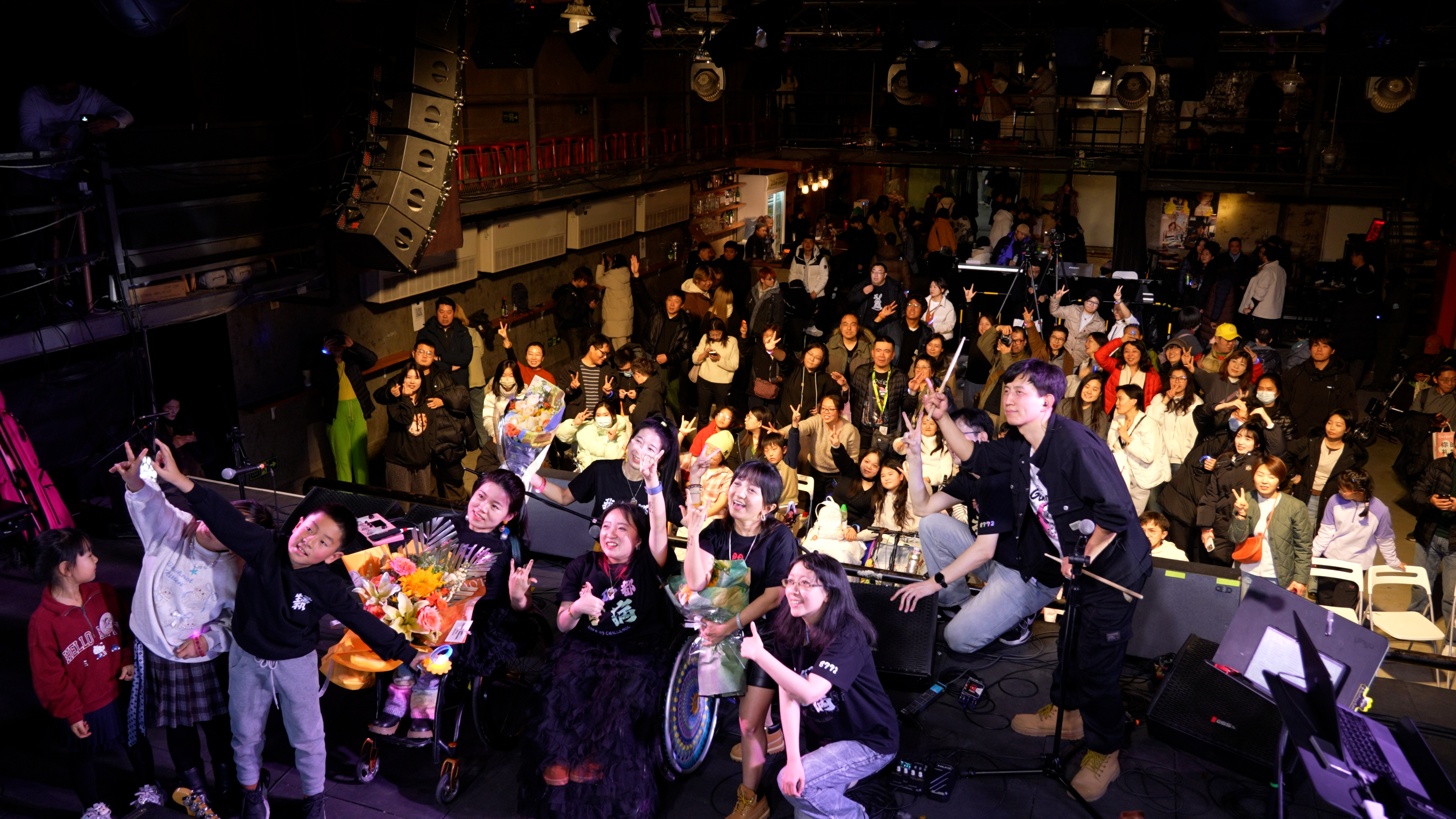事实却是,当天的舞台下挤满了300多位冒着严寒从四面八方赶来的人,共同见证了这支乐队值得纪念的时刻。前排位置被预留给坐轮椅的伙伴,后方的人群中,有刚加完班匆匆赶来的年轻乐迷;有带着患病孩子一起感受“完整世界”的家长;还有头发已花白的老者,站在台下大声喊着键盘手的名字,用力挥舞手臂,只为给自己昔日学生最有力的支持……