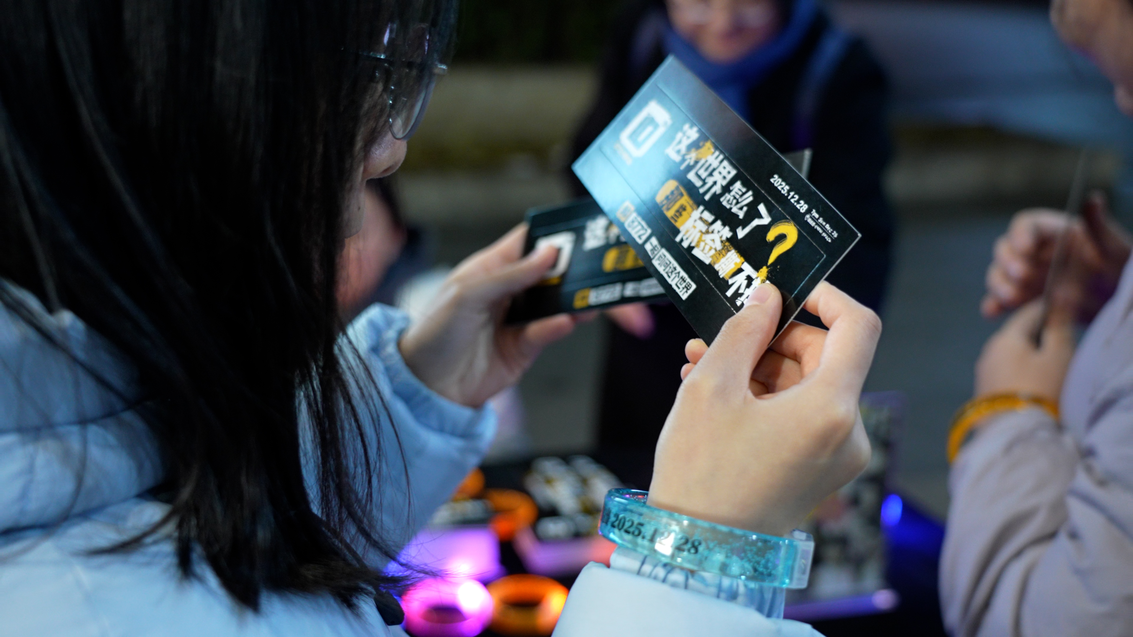 2025年12月28日晚,西城区天桥附近的一家音乐展演空间内热闹非凡,8772乐队成立十周年音乐会正在此上演。音乐会的主题叫做“我想问问这个世界”,源自乐队最新专辑《我们都有病》中的同名歌曲。