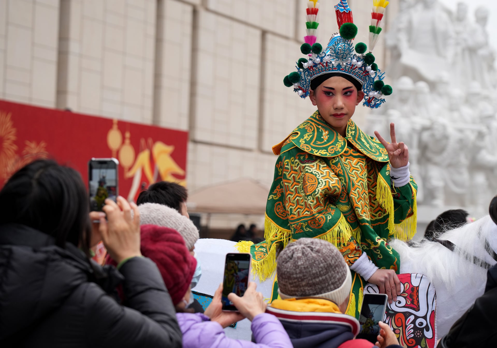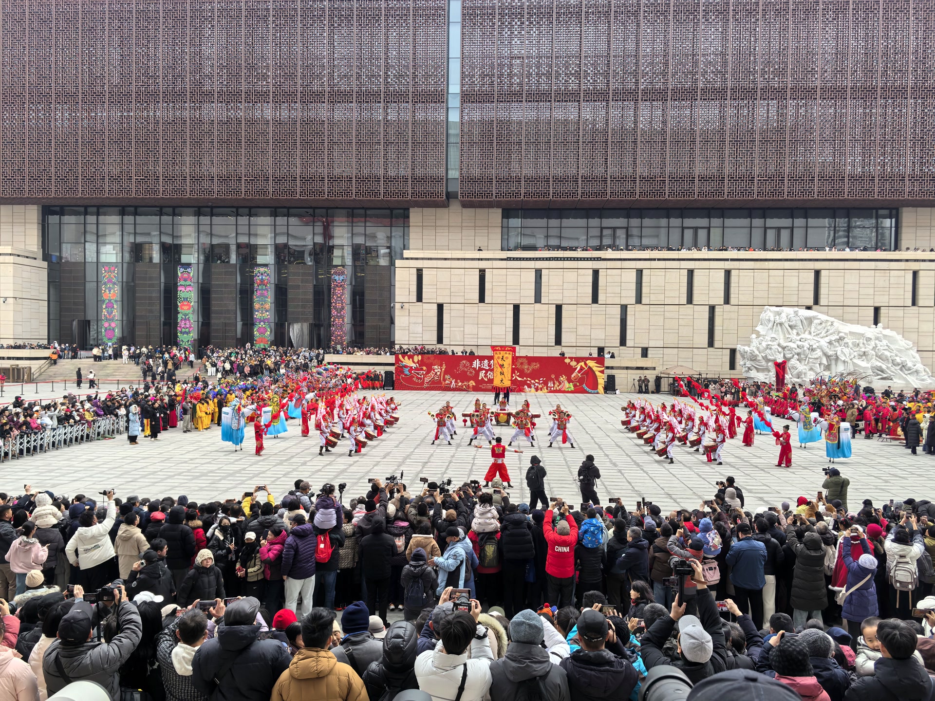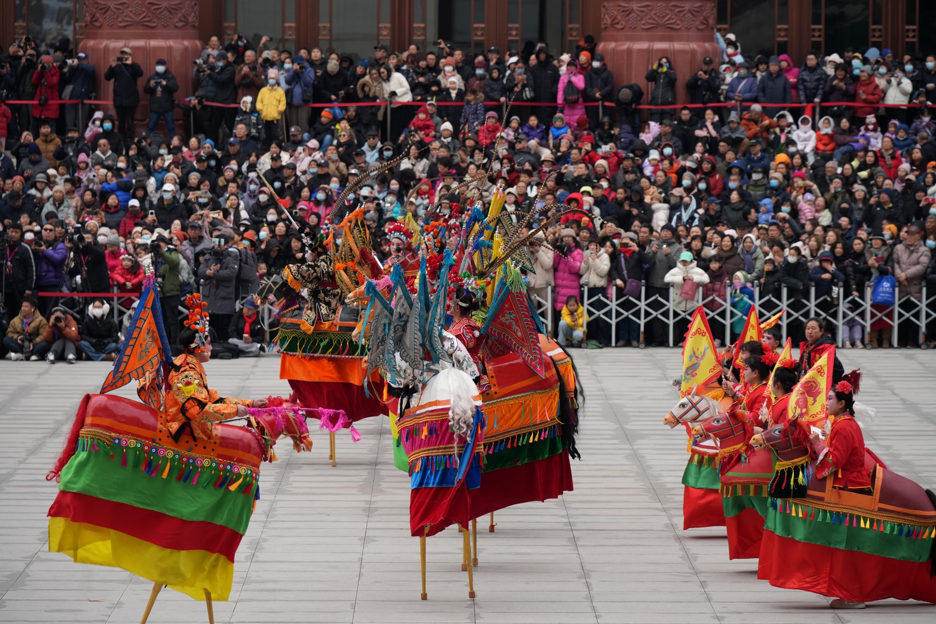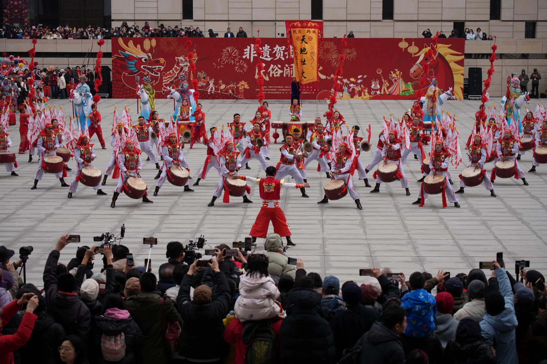 由中国非物质文化遗产馆与中国共产党历史展览馆联合主办的“非遗贺新春 民俗闹红火”广场展演拉开帷幕。伴随着震天的锣鼓声,来自北京、陕西、山西、浙江、内蒙古等8个省(自治区、直辖市)的民俗展演团队轮番登场,将曾庄大鼓的雄浑、麒麟舞的灵动、寿阳高跷竹马戏的惊险、蒙古族马头琴的悠扬,以及曲周龙灯、蚌埠花鼓灯等14项非物质文化遗产代表性项目,浓缩成一场精彩绝伦的视听盛宴,引得现场观众叫好声此起彼伏,不少人为了看得真切,索性让孩子坐在肩头,一览这难得的民俗盛景。