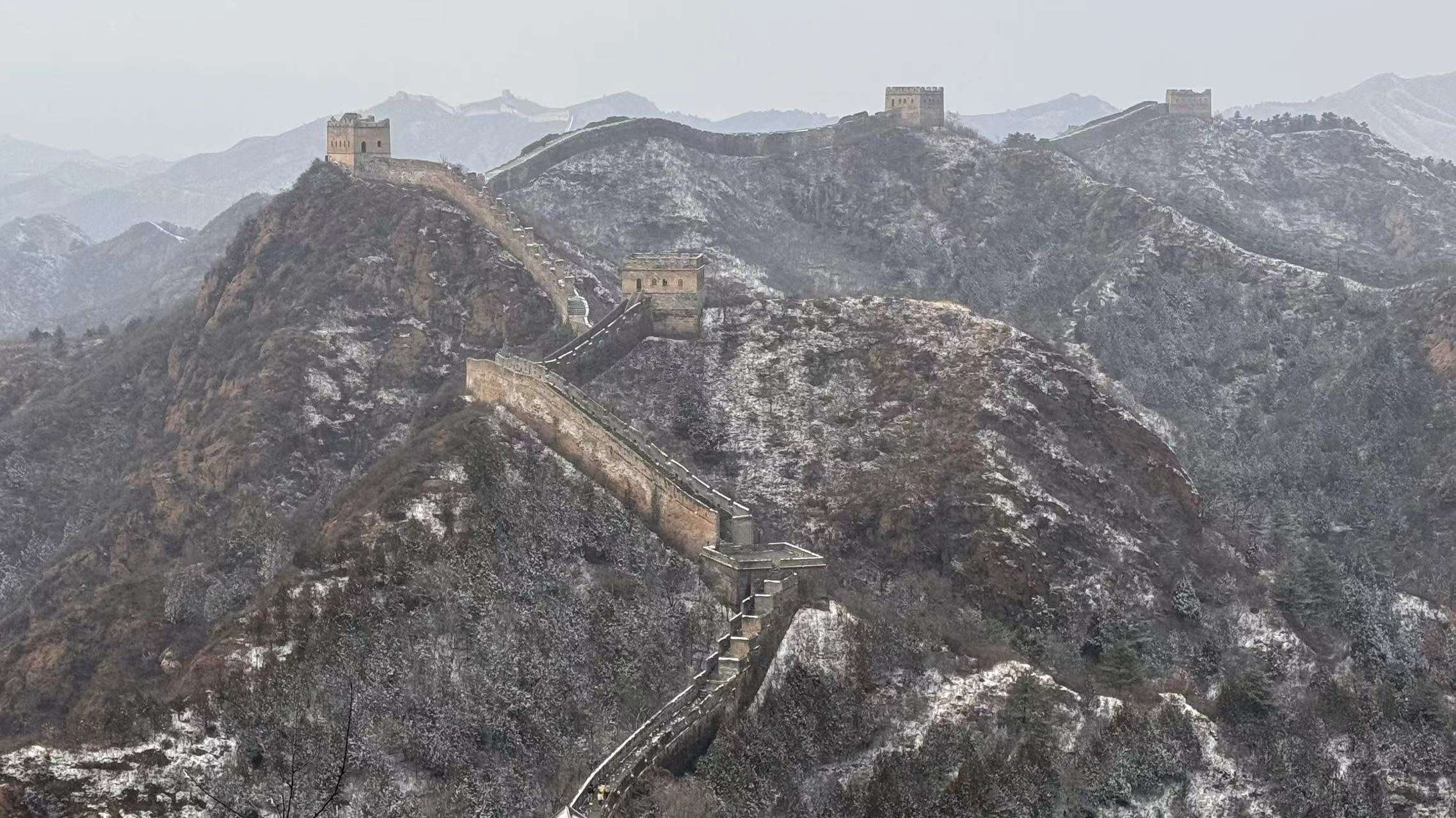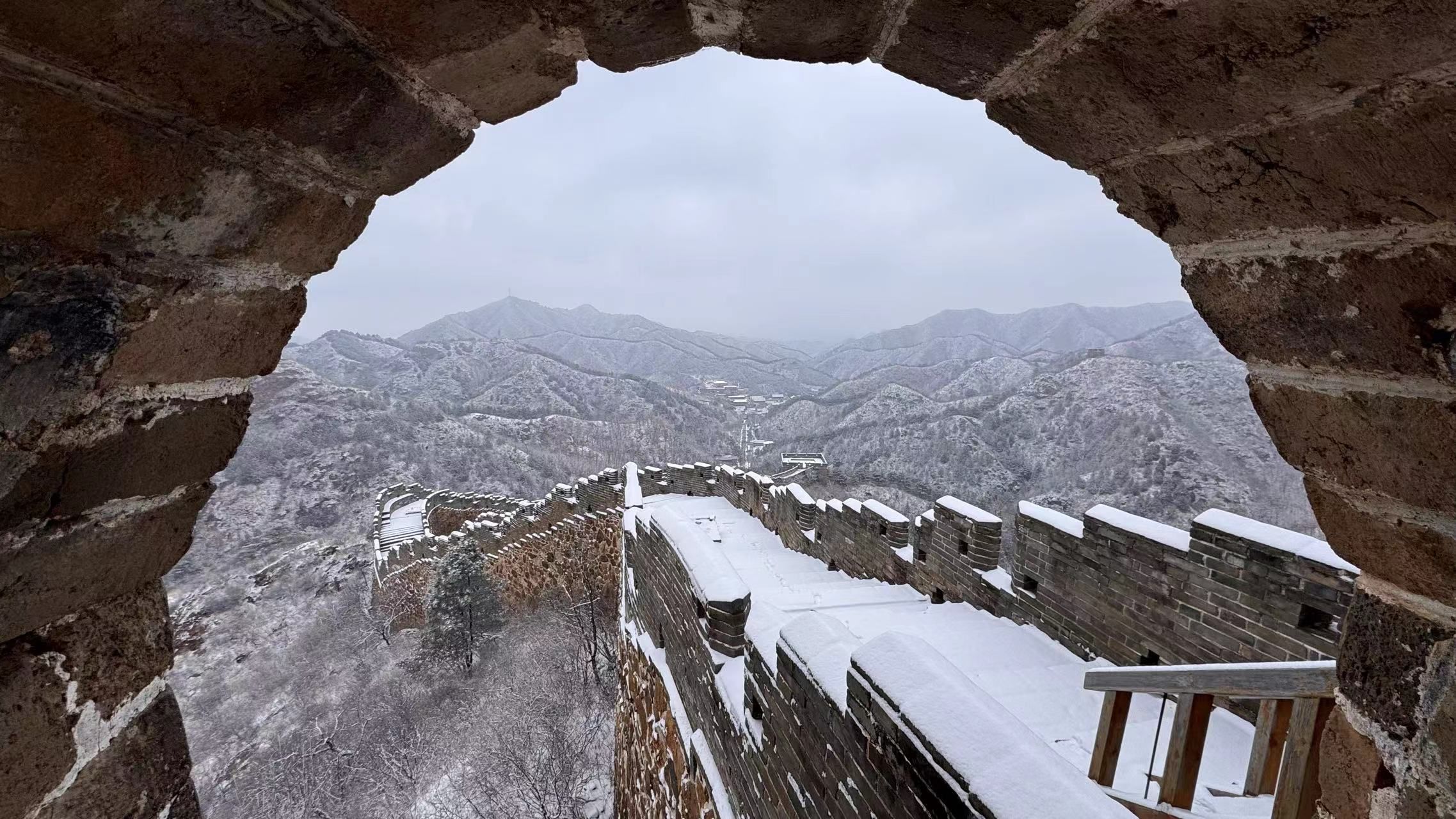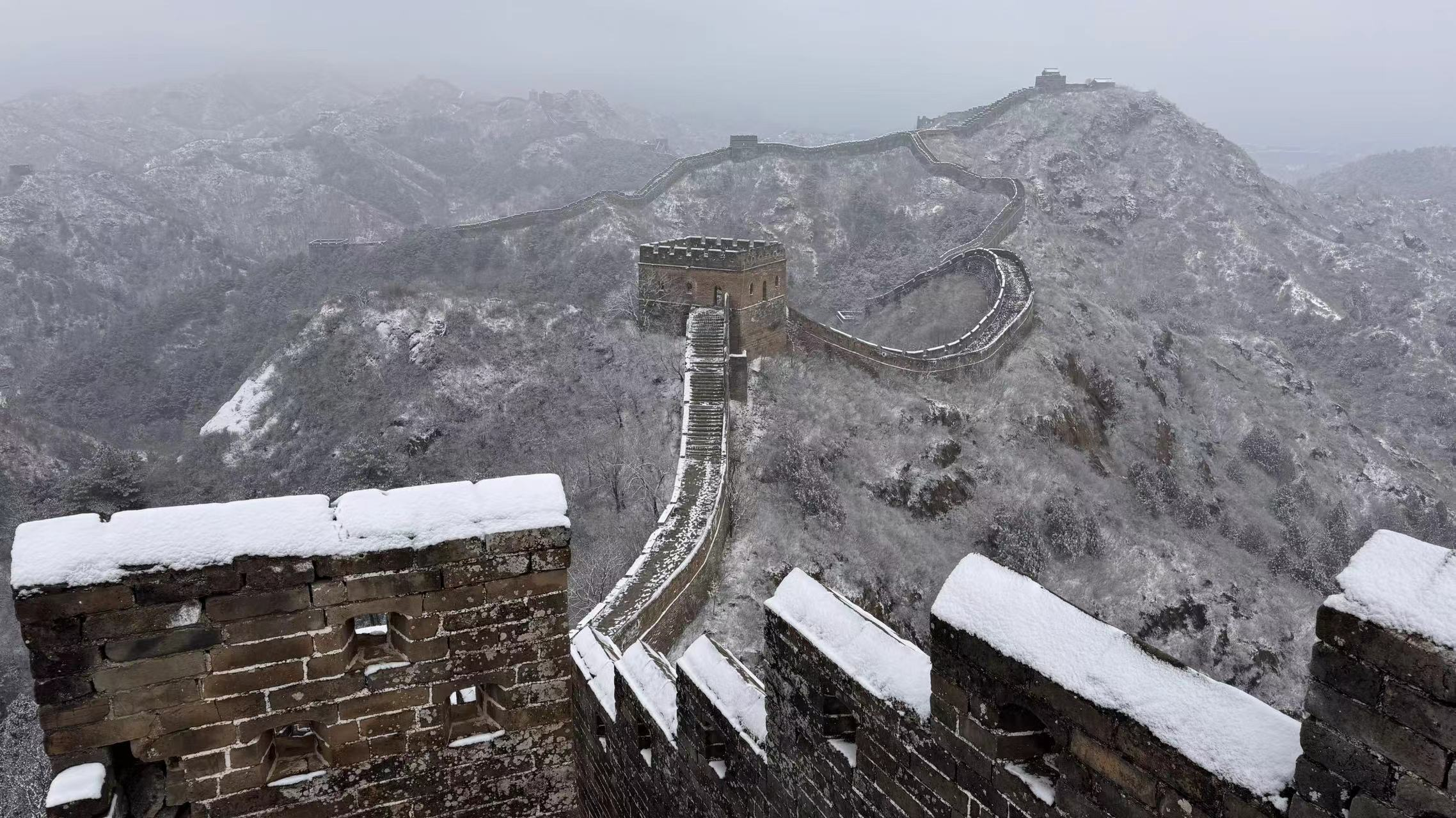 连日来的雨雪天气,河北省承德市滦平县金山岭长城被皑皑白雪覆盖,银装素裹,一派壮美北国风光景象。
