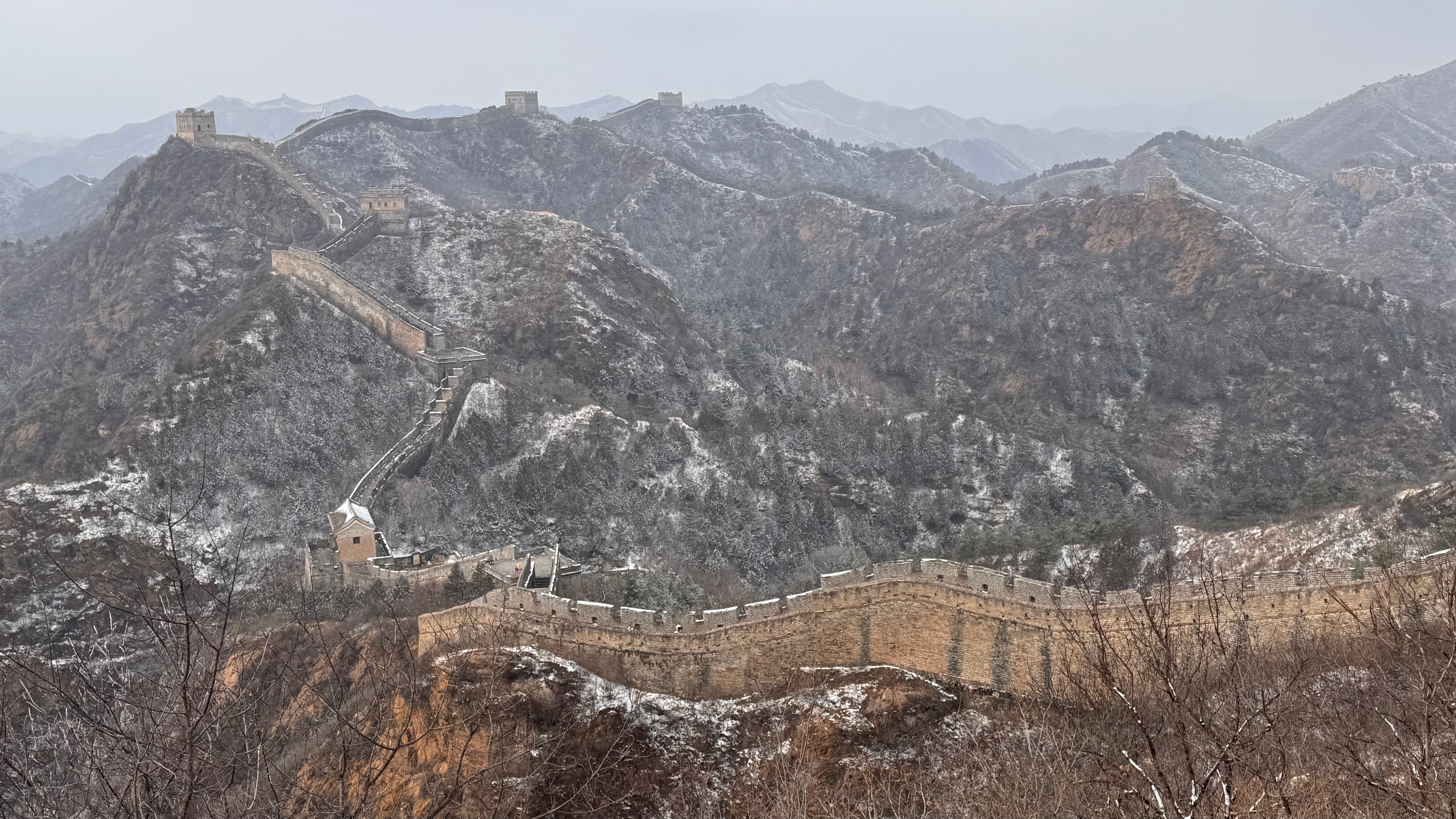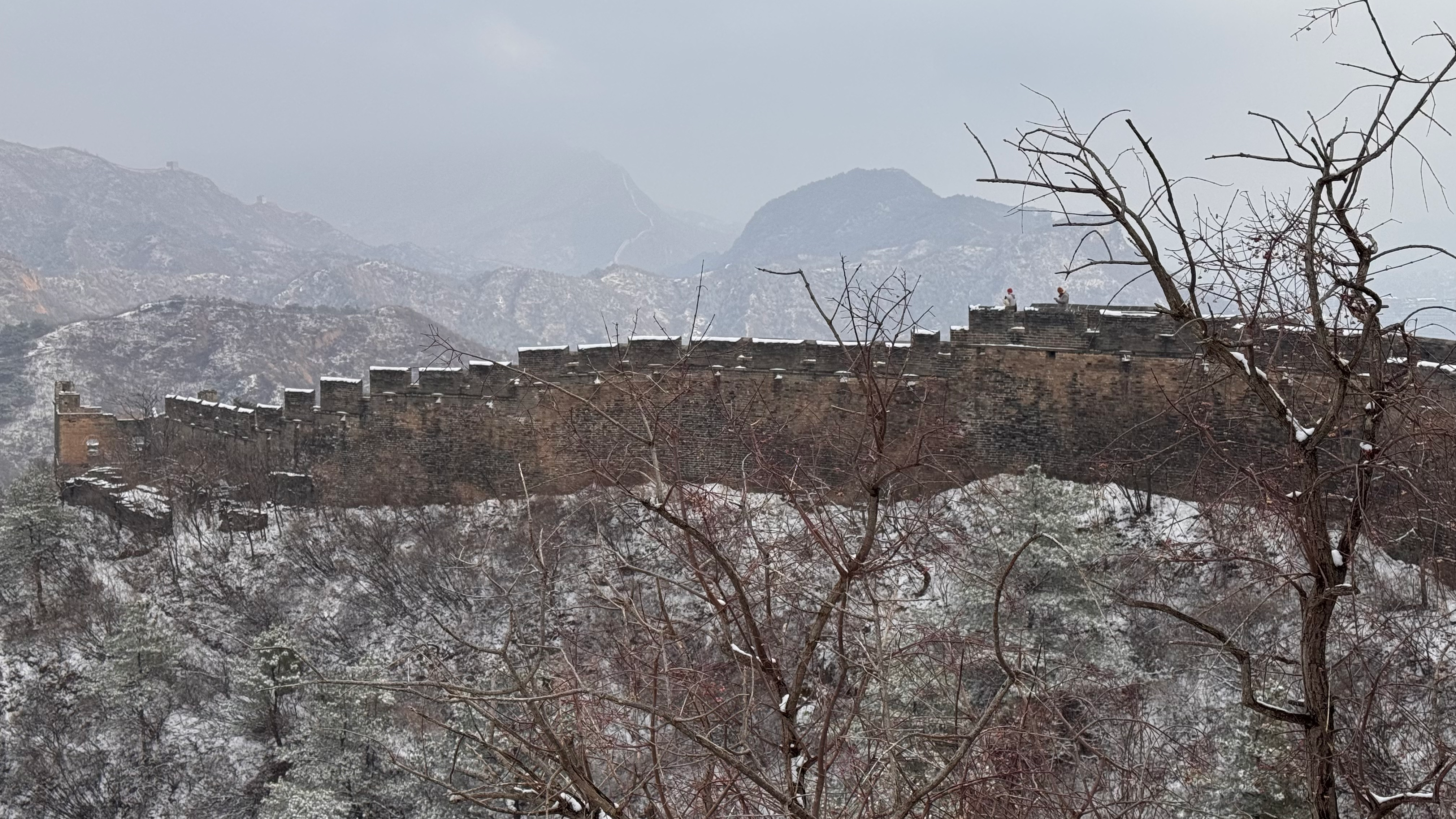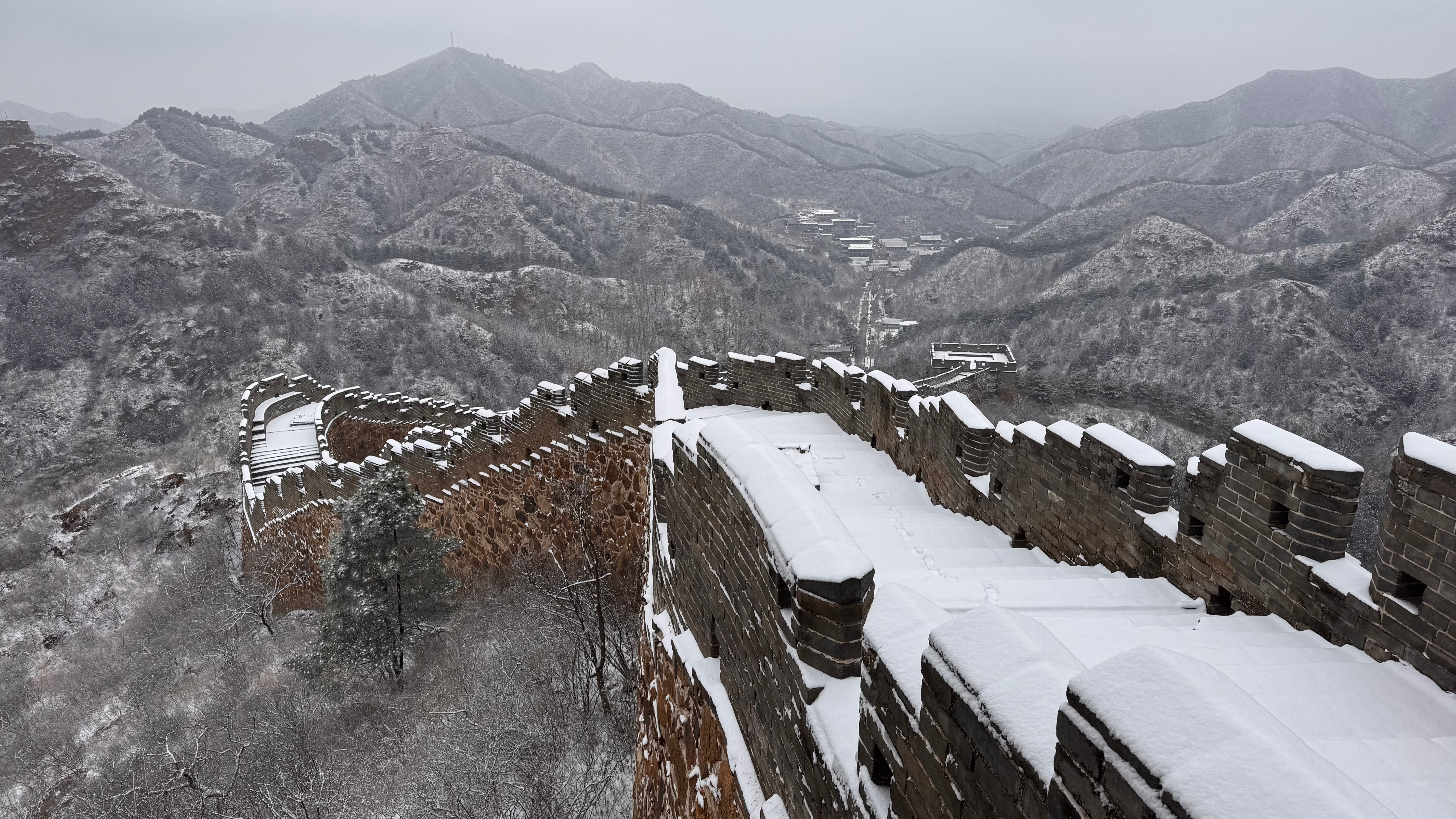 连日来的雨雪天气,河北省承德市滦平县金山岭长城被皑皑白雪覆盖,银装素裹,一派壮美北国风光景象。