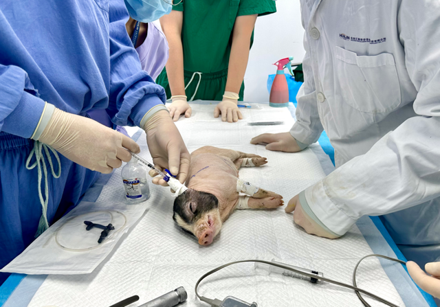 此次动物实验,按照实验研究方案选取体重分别为2.5kg、3kg、5kg三只与新生儿食管闭锁手术患儿体重和月龄相近的巴马小型猪(Bama Mini-Pig)作为实验对象,在全麻下对三只实验动物实施心电、血氧、血压及血气指标的监测。术中首先切除3cm胸腔段食管建立食管闭锁动物模型。第一只经开放手术顺利完成食管替代吻合,随后的第二、第三只小猪先后采用胸腔镜微创手术非常顺利地进行应用高分子支架材料的食道重建手术,成功一期修复了3cm的食道缺损。手术结束三只实验动物均获存活。同时,术前通过CT明确该年龄段实验动物的食管内外径,填补了该方向的数据空白。这一成功,为后续开展的临床研究奠定了坚实的基础。
