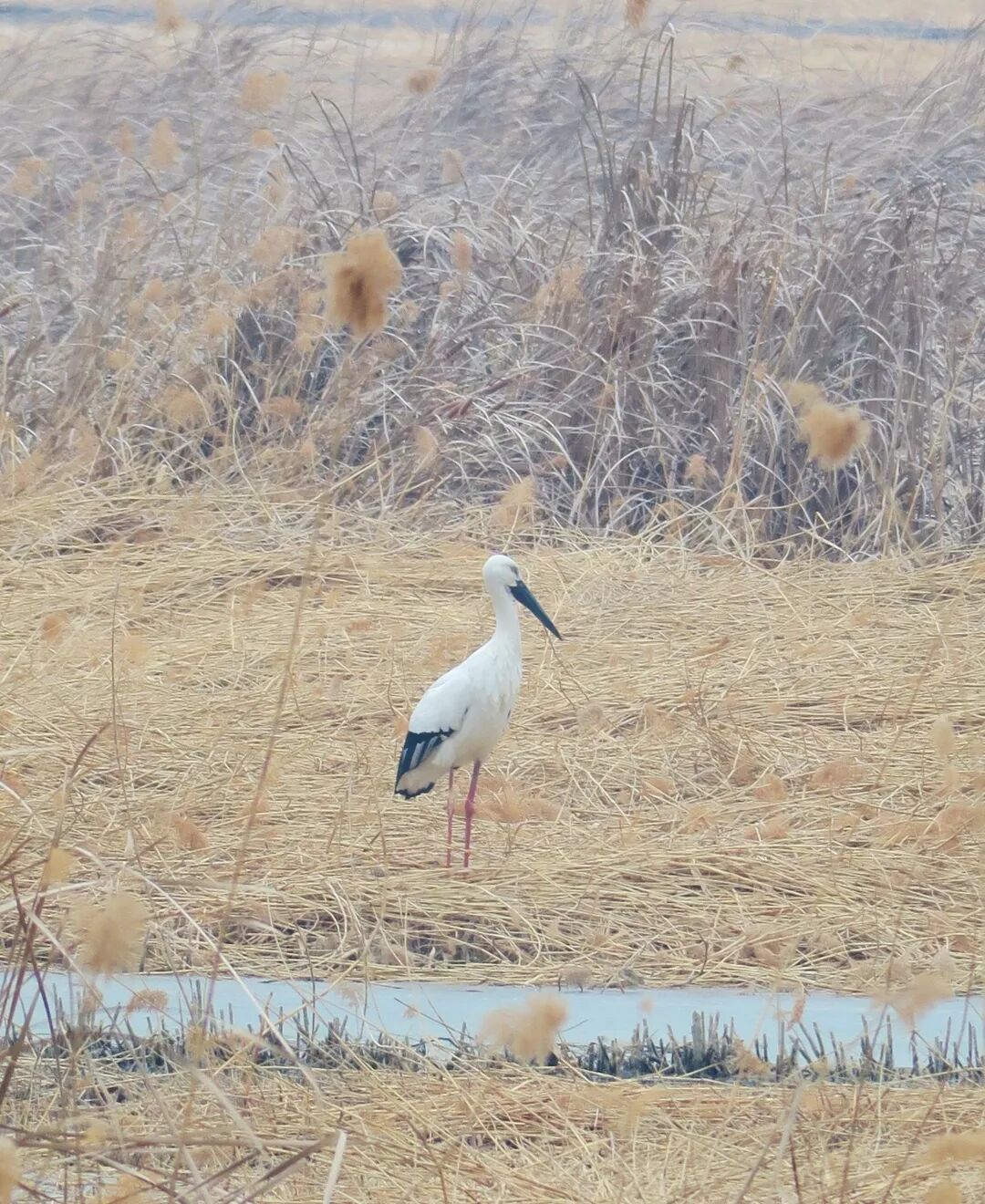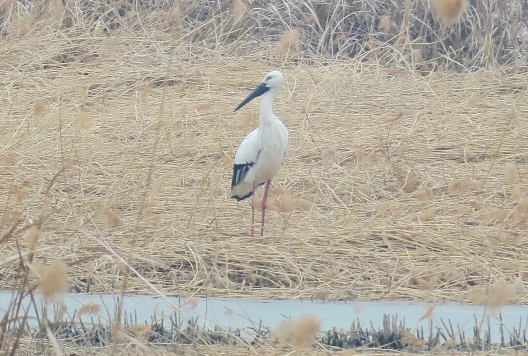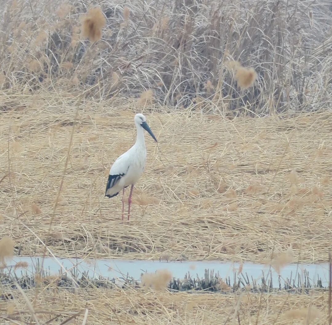一只体态优雅的大鸟正在汉石桥湿地的芦苇荡中悠然踱步。它体羽洁白,翅尾漆黑如墨,一双标志性的红色长腿在浅滩中缓缓移动,时不时用细长的喙探入水中觅食——这便是东方白鹳。