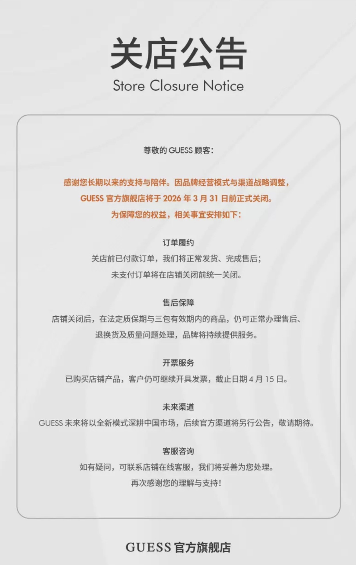 根据GUESS官方旗舰店发布的关店公告,其表示,在订单履约方面,关店前已付款订单,将正常发货、完成售后;未支付订单将在店铺关闭前统一关闭。在售后保障方面,店铺关闭后,在法定质保期与三包有效期内的商品,仍可正常办理售后、退换货及质量问题处理,品牌将持续提供服务。开票服务方面,已购买店铺产品,客户仍可继续开具发票,截止日期为4月15日。GUESS官方旗舰店也表示,未来将以全新模式深耕中国市场,后续官方渠道将另行公告。