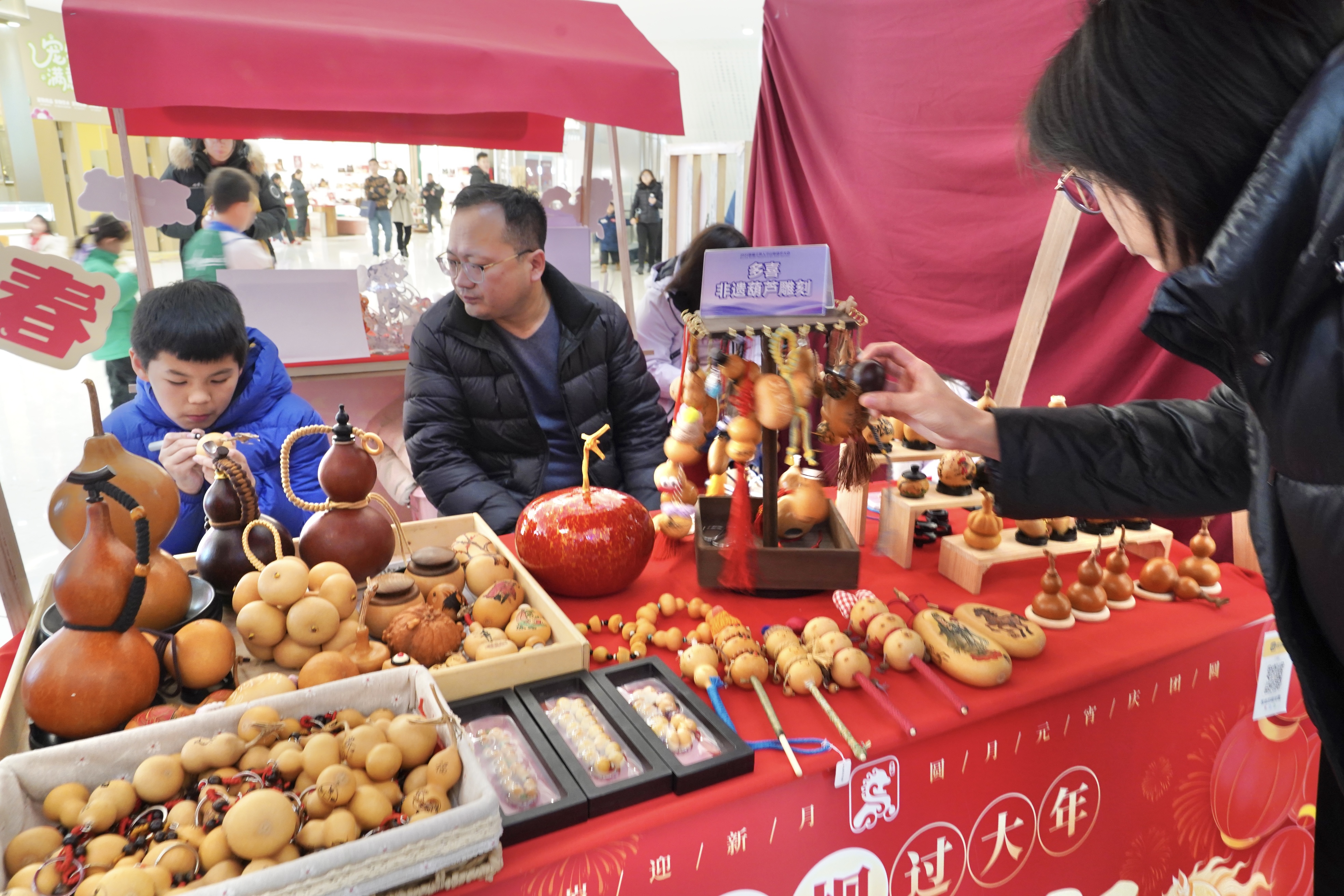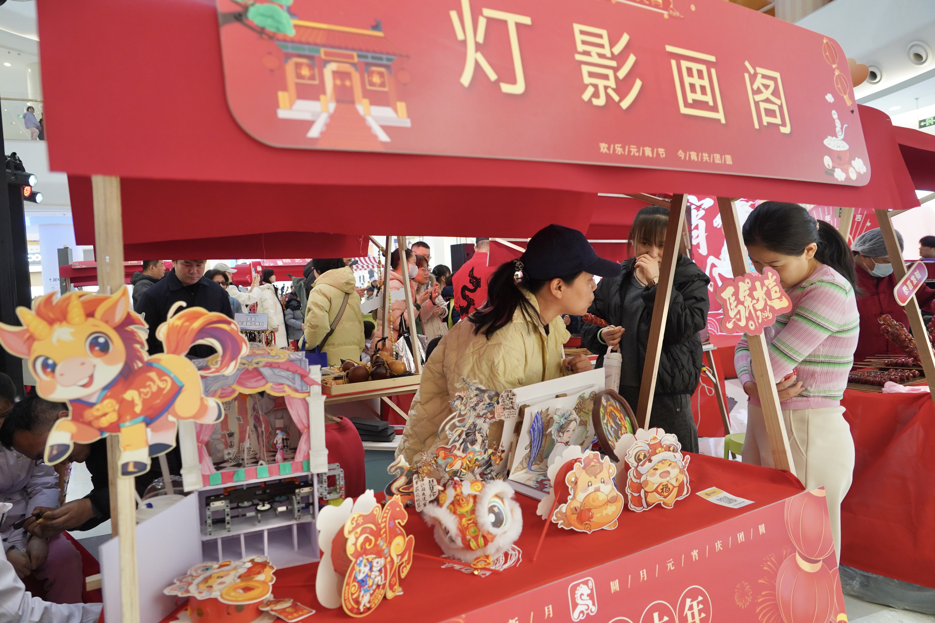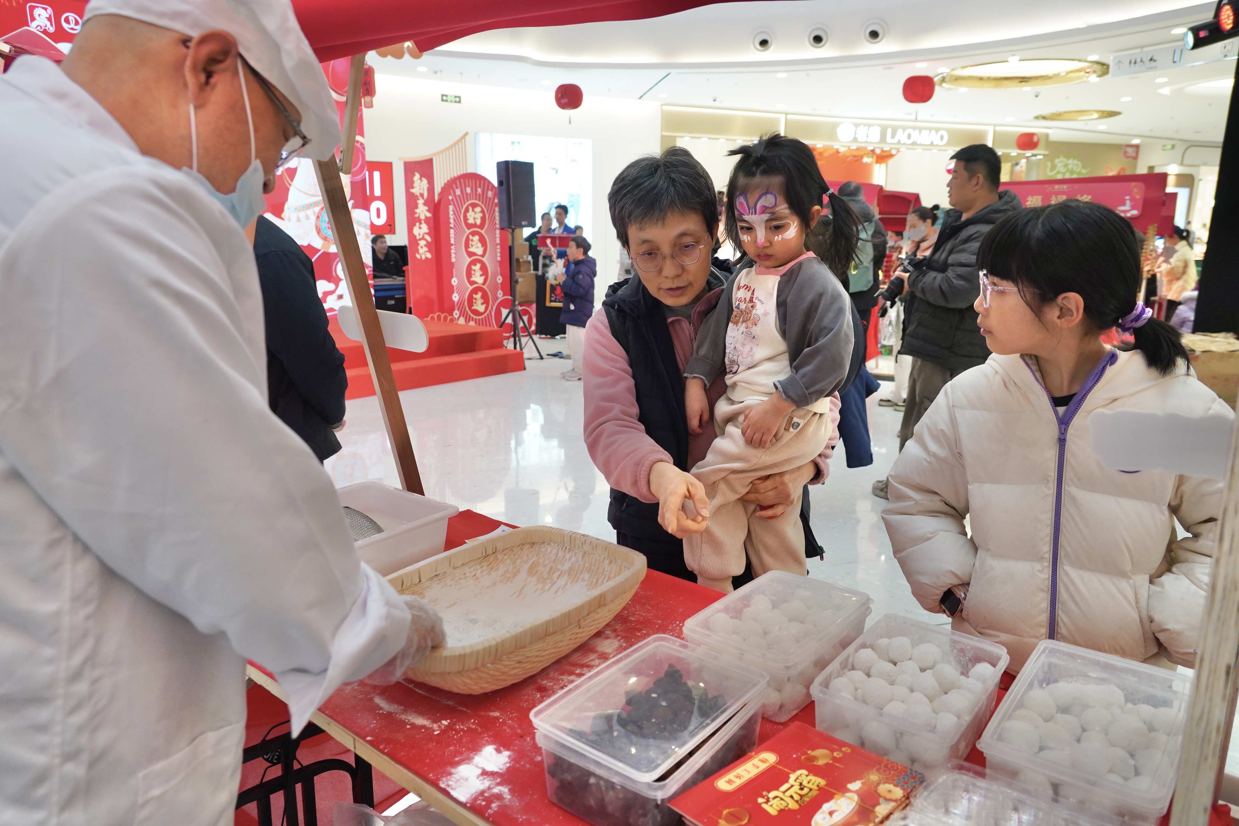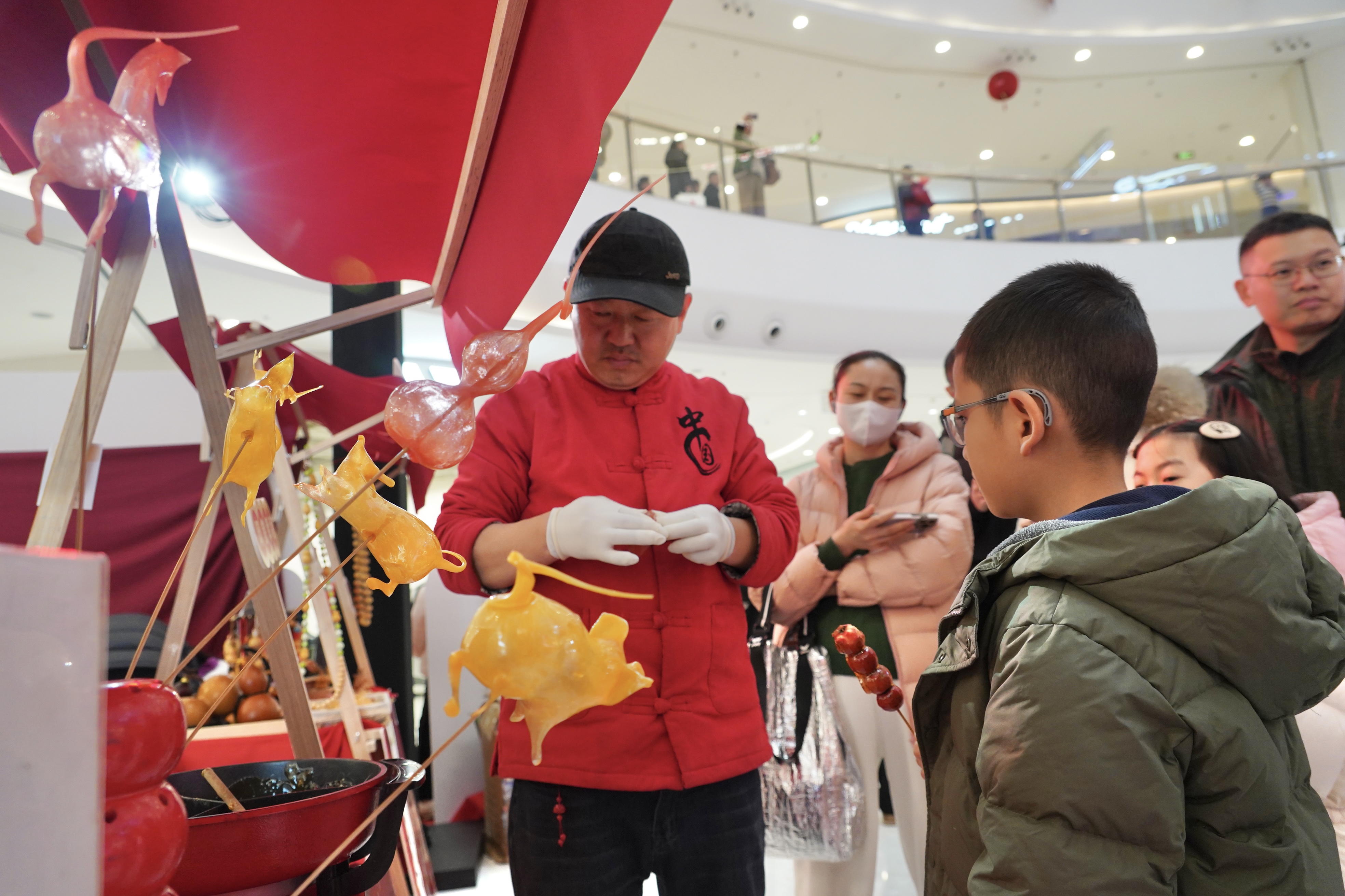 在趣味互动区,孩子们套圈、丢沙包、传统投壶……家长与孩子并肩作战,将寓意着旧日的“烦恼”丢进靶心。糖葫芦、吹糖人、捏面人……吸引孩子们驻足端详。地道的手工美食与民俗技艺,让居民近距离感受传统节日文化的魅力。