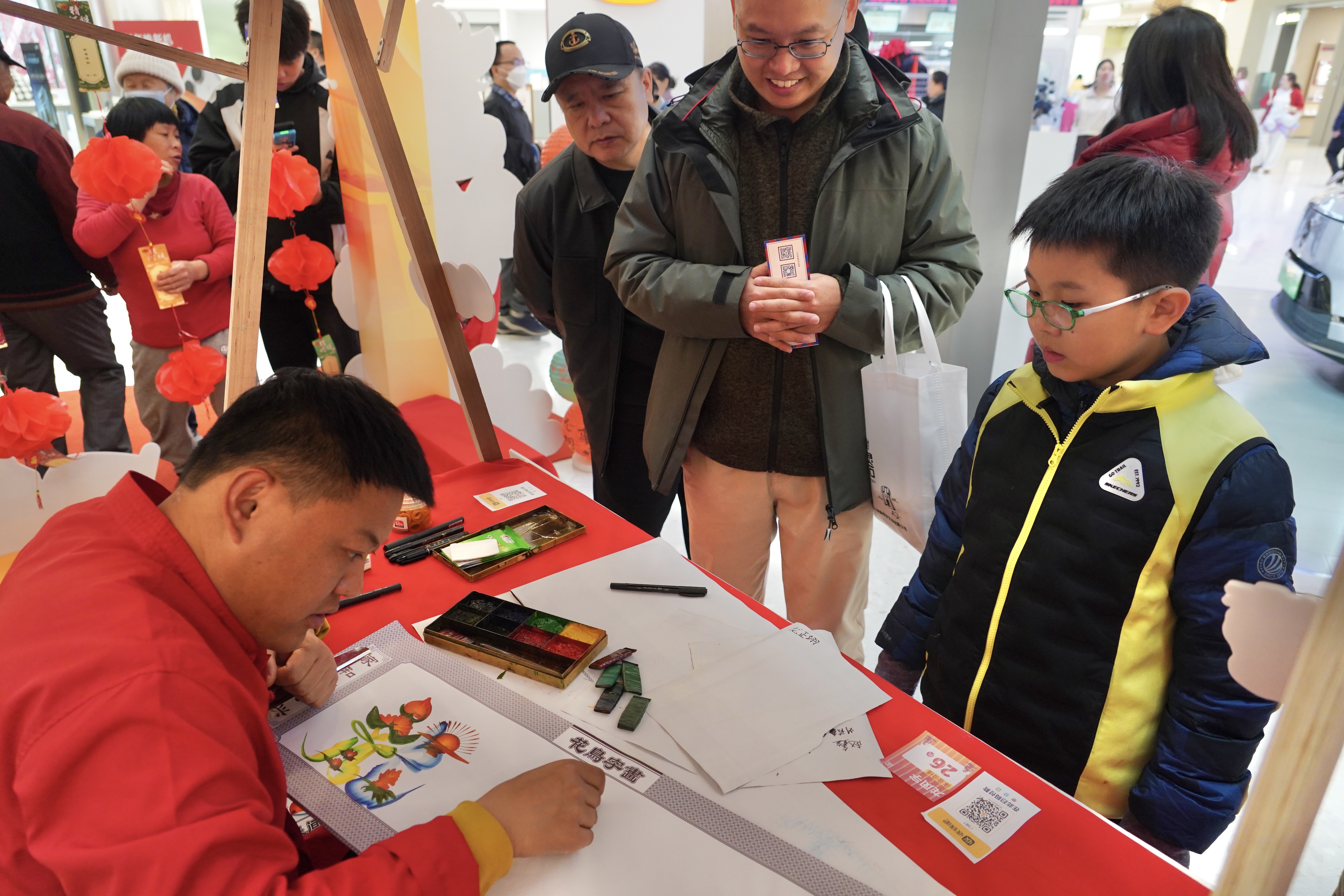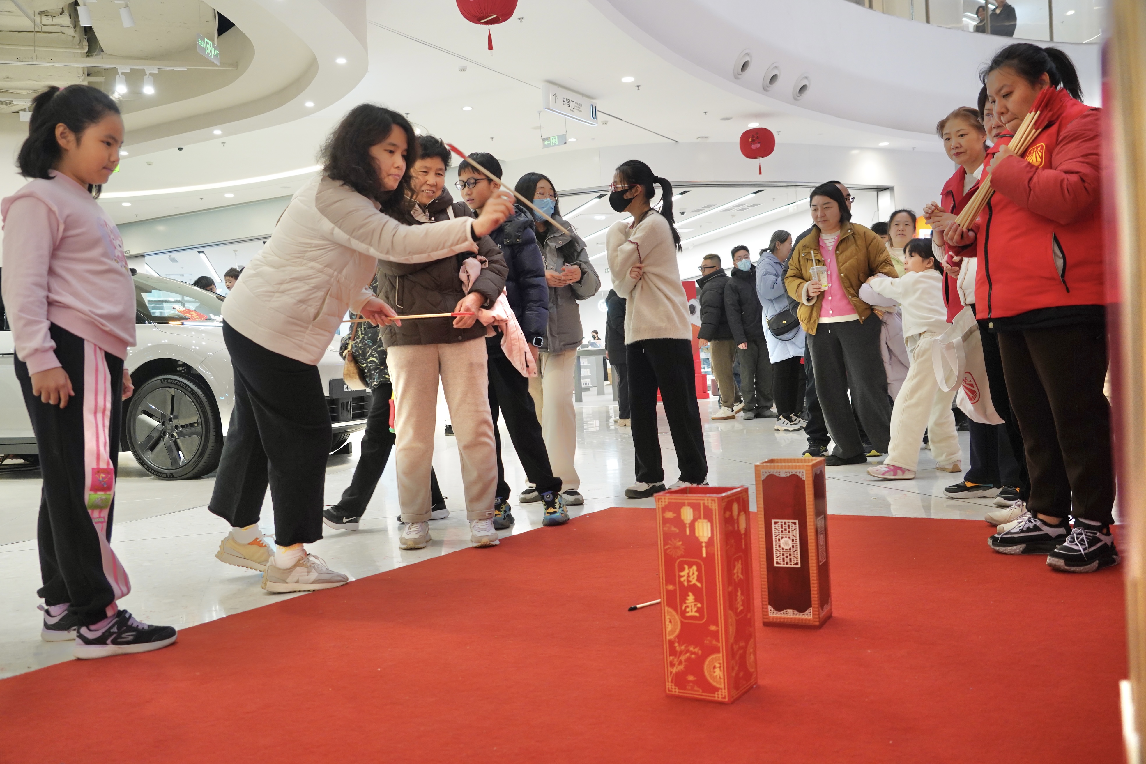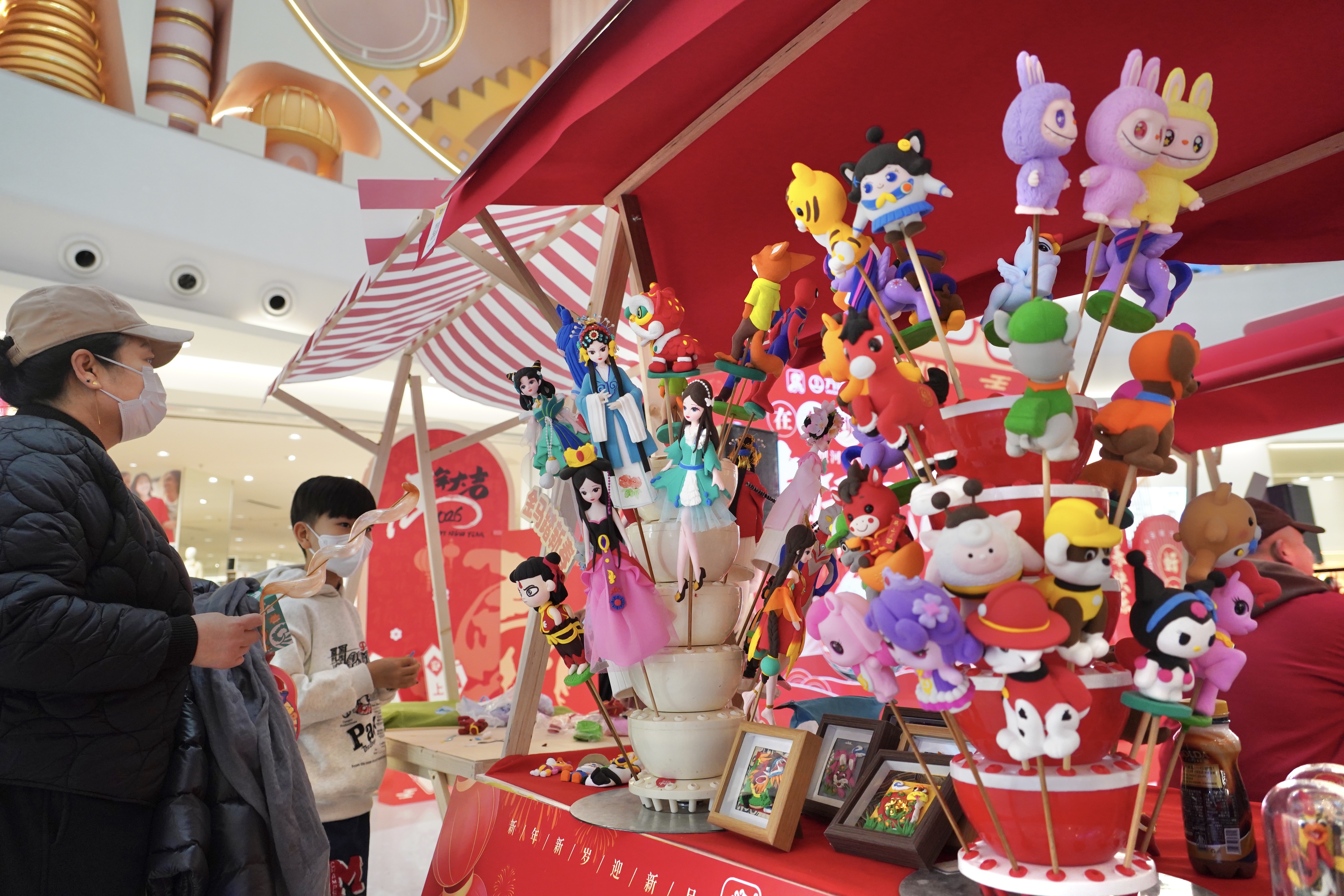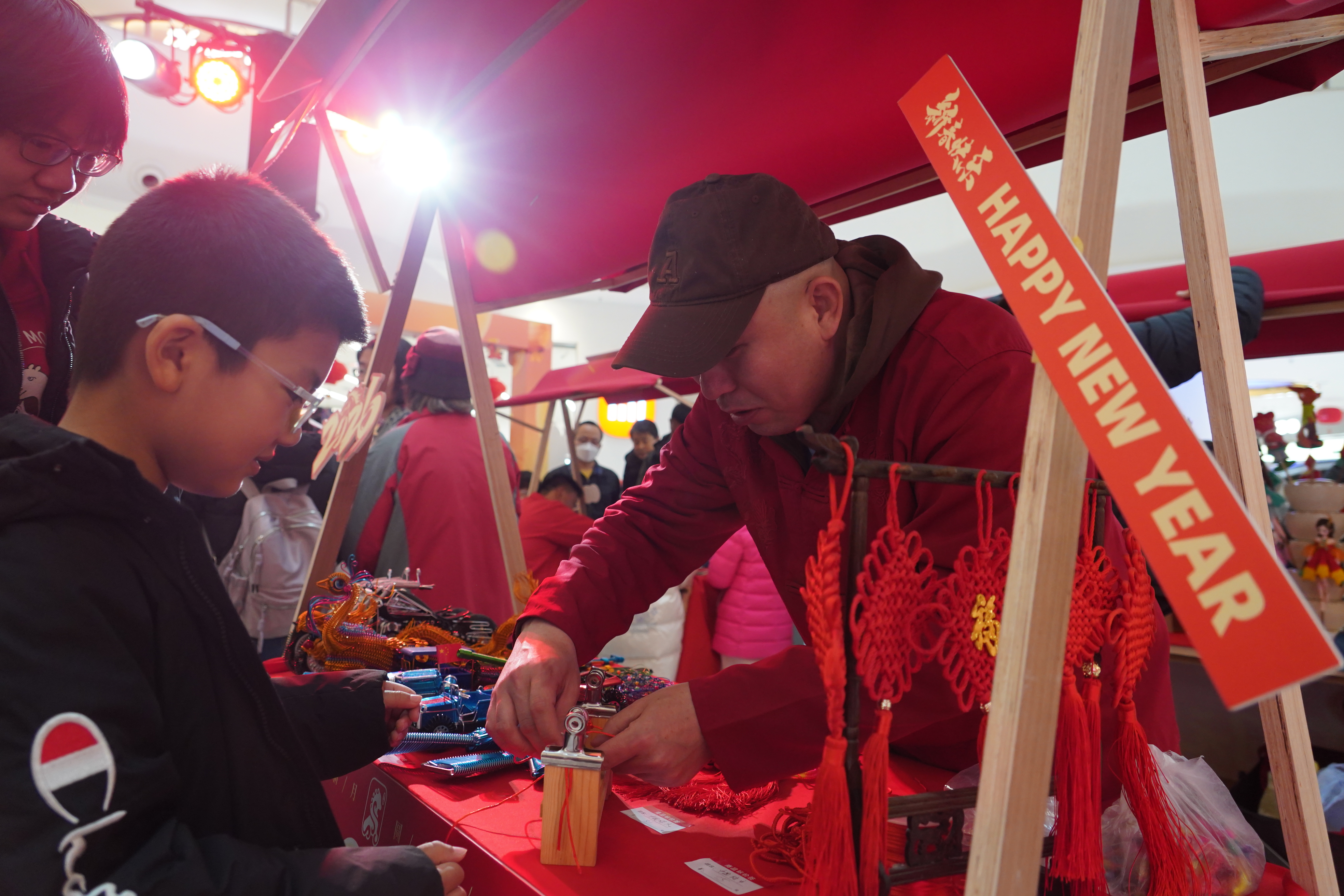 在趣味互动区,孩子们套圈、丢沙包、传统投壶……家长与孩子并肩作战,将寓意着旧日的“烦恼”丢进靶心。糖葫芦、吹糖人、捏面人……吸引孩子们驻足端详。地道的手工美食与民俗技艺,让居民近距离感受传统节日文化的魅力。