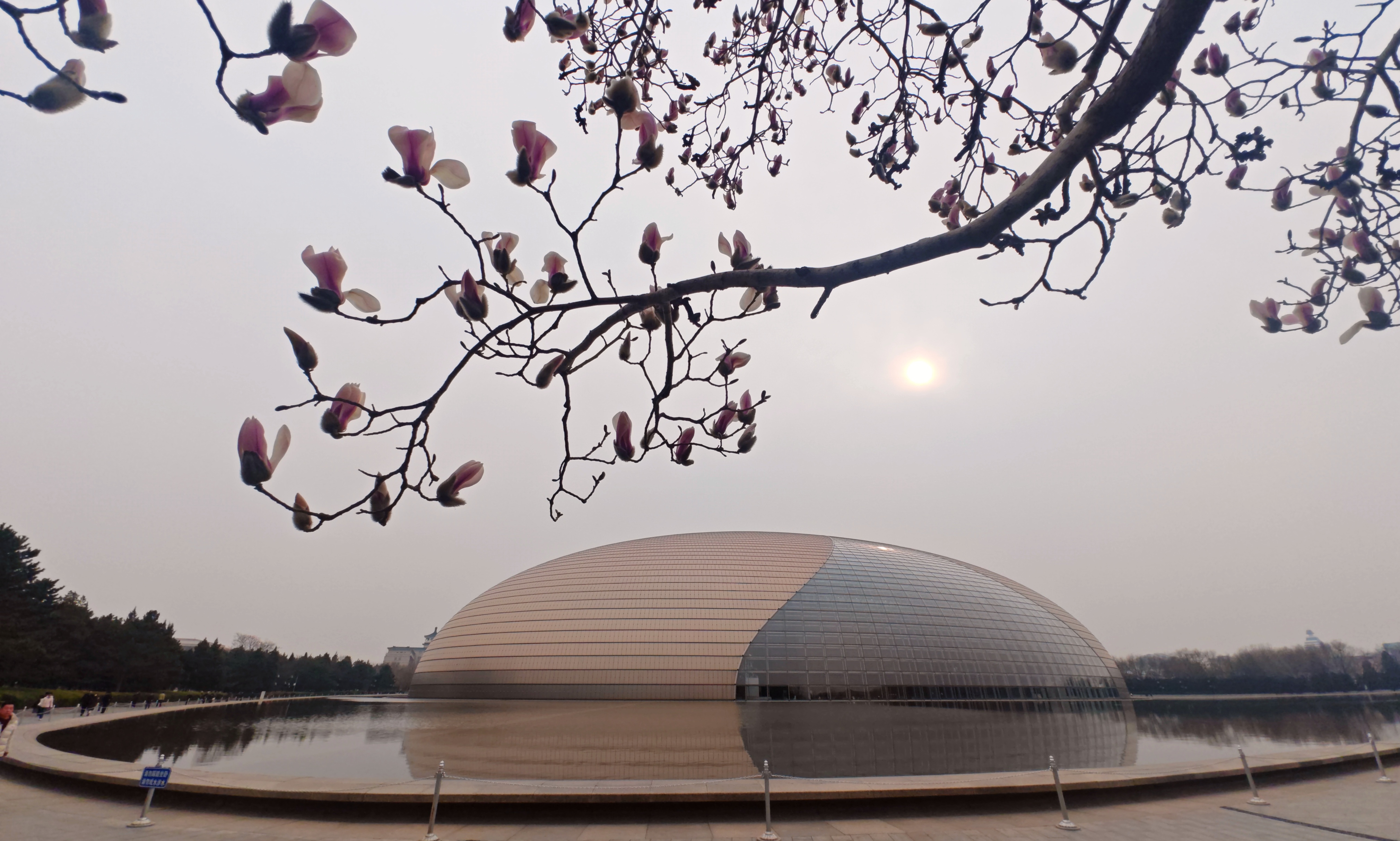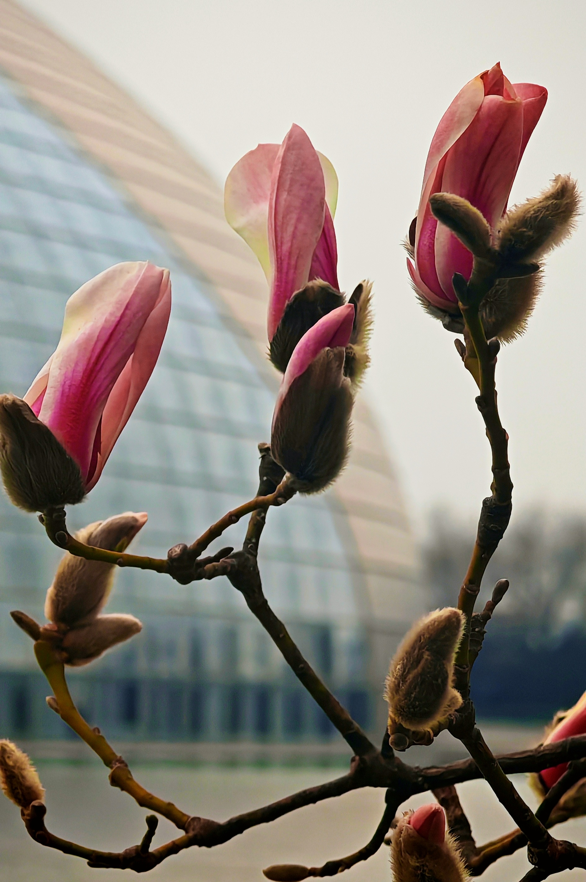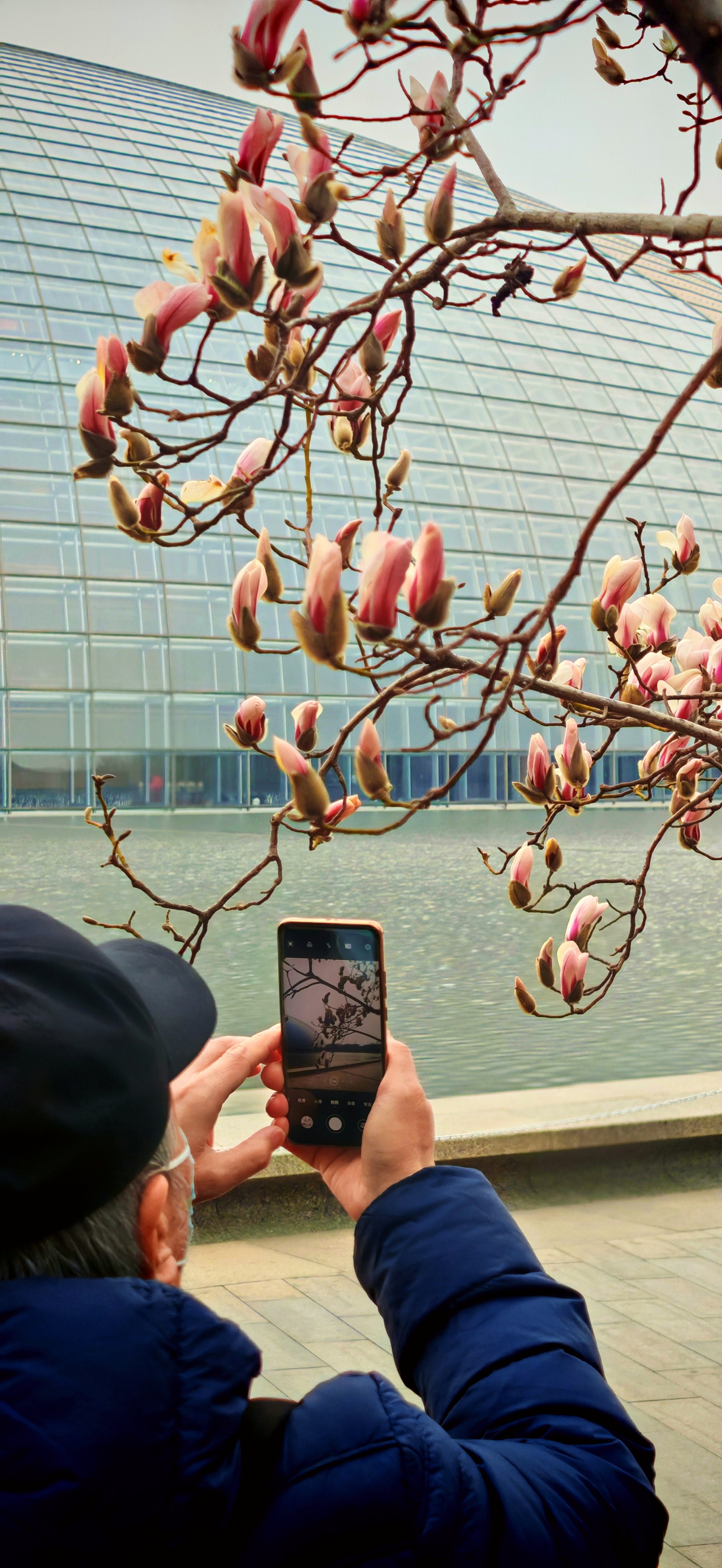 当日,国家大剧院波光粼粼的水池前,一排广玉兰树悄然破壳,吐露出毛茸茸的花苞与初绽的花朵。这些率先感知到春意的“信使”,与远处线条流畅、宛如巨蛋的银色剧院相映成趣——现代建筑的刚硬线条与自然生命的柔美舒展,构成了一幅动静相宜的都市春景图。