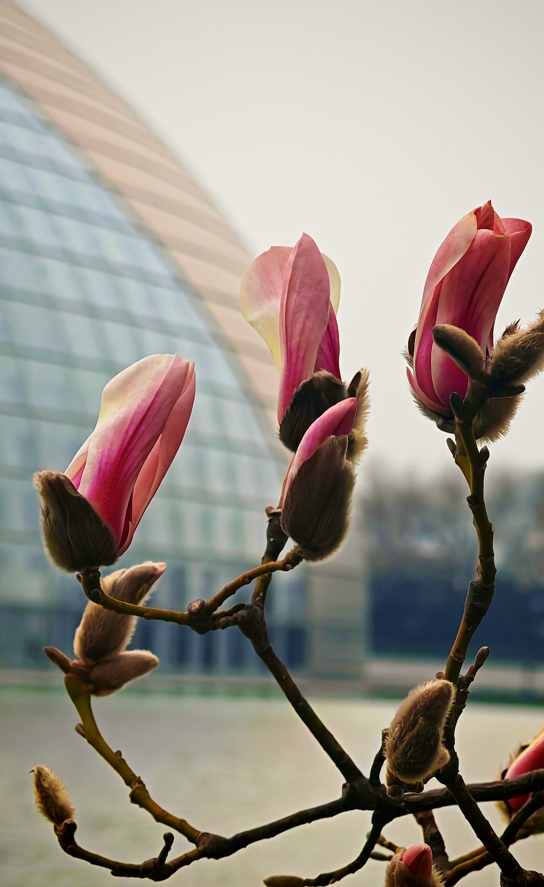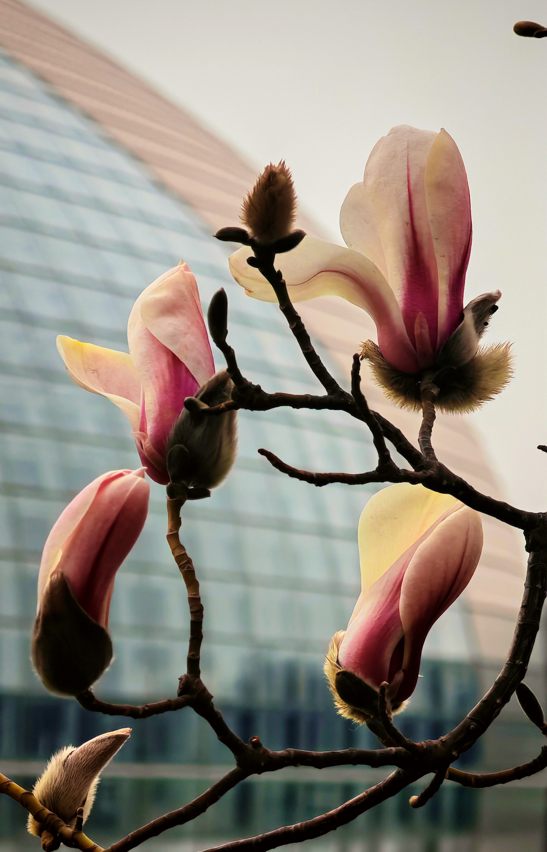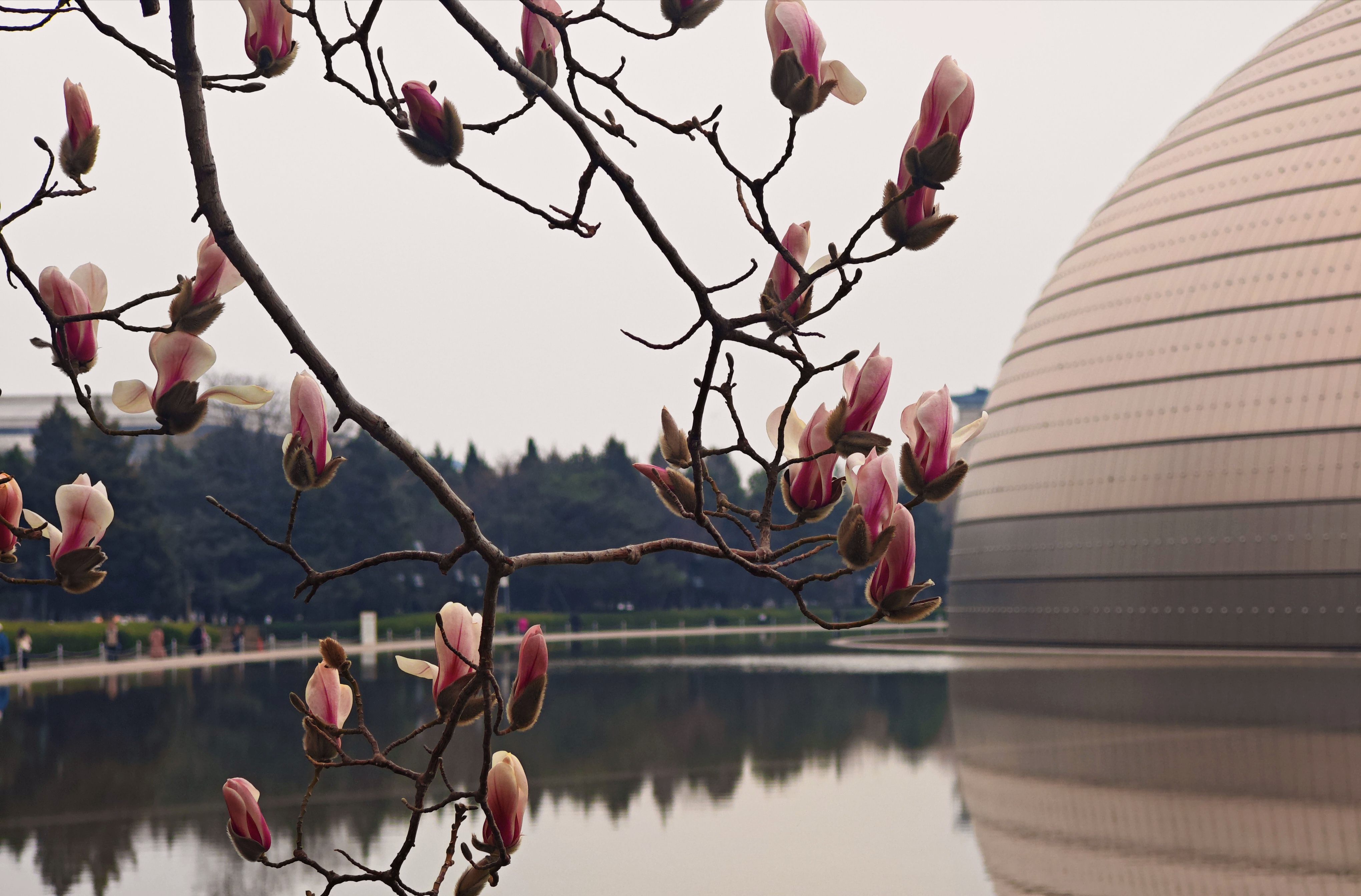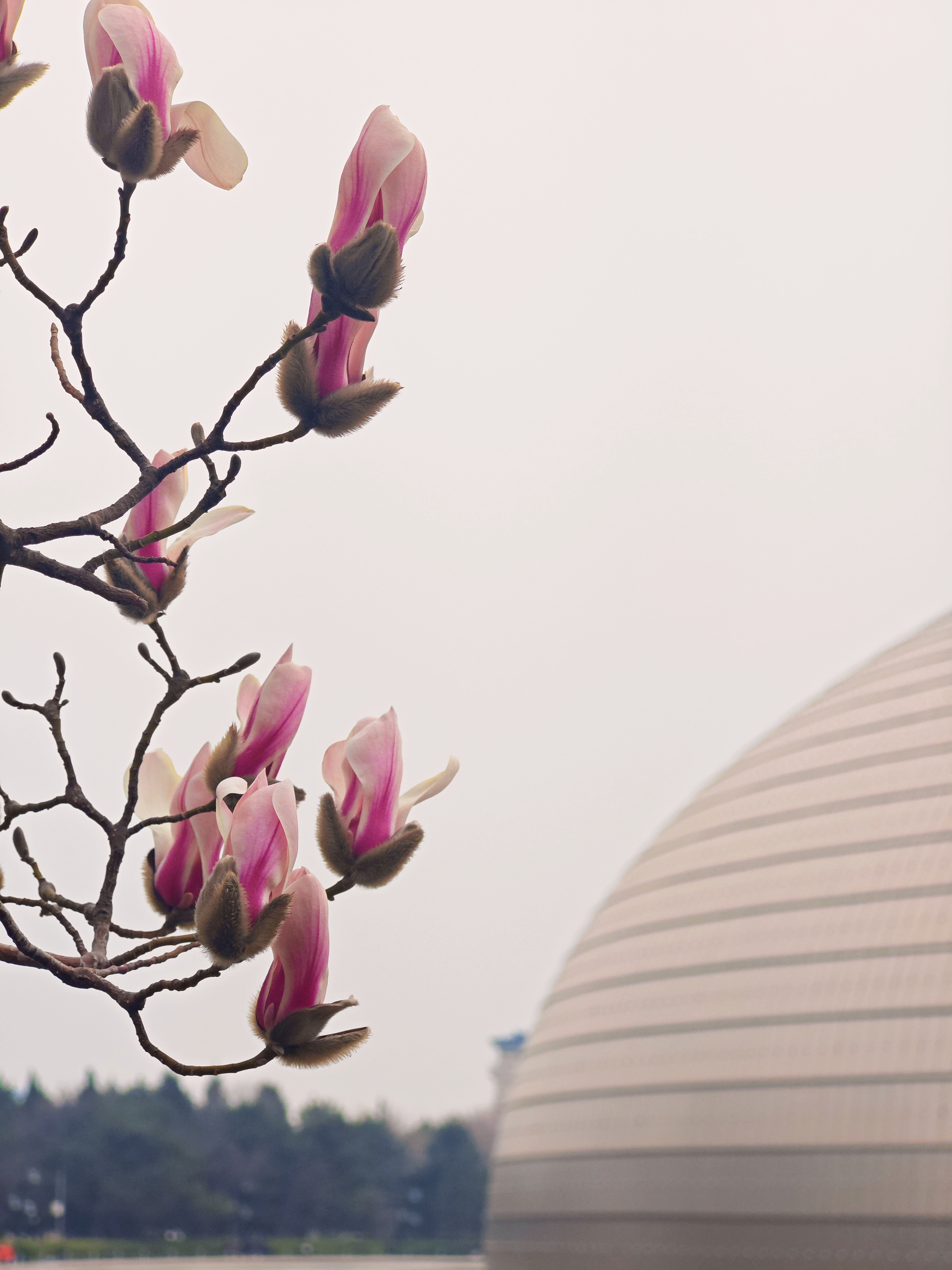 当日,国家大剧院波光粼粼的水池前,一排广玉兰树悄然破壳,吐露出毛茸茸的花苞与初绽的花朵。这些率先感知到春意的“信使”,与远处线条流畅、宛如巨蛋的银色剧院相映成趣——现代建筑的刚硬线条与自然生命的柔美舒展,构成了一幅动静相宜的都市春景图。