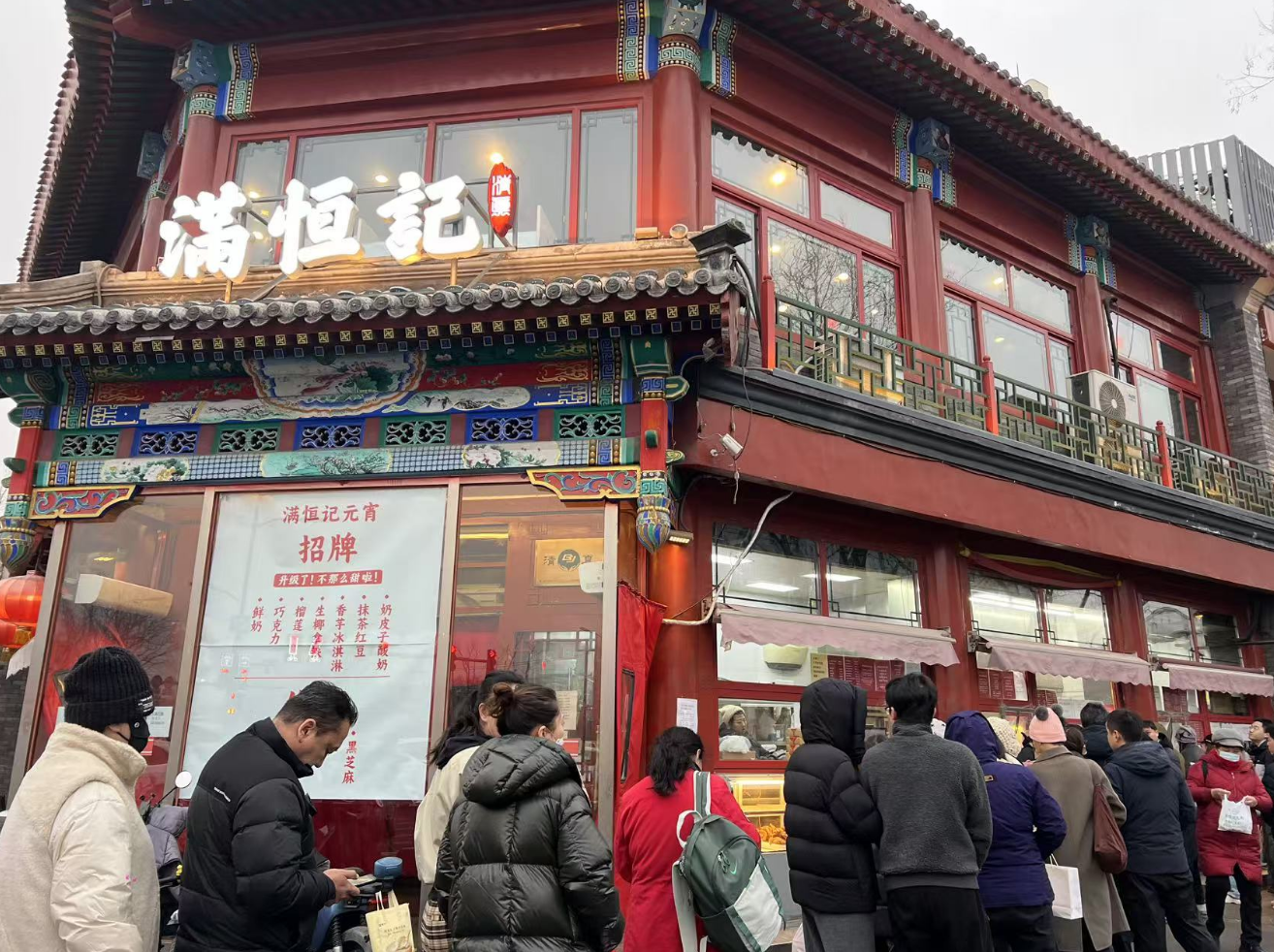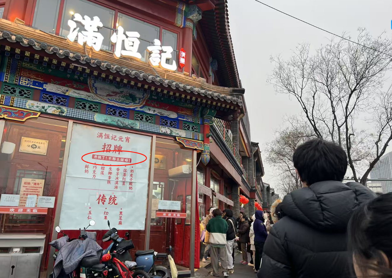 满恒记今年也推出了多种新口味。3月1日下午,平安里西大街上的满恒记店前,三个对外售卖元宵的窗口全都排起长队。门口的招牌上,一行手写大字格外醒目:“升级了!不那么甜啦!”