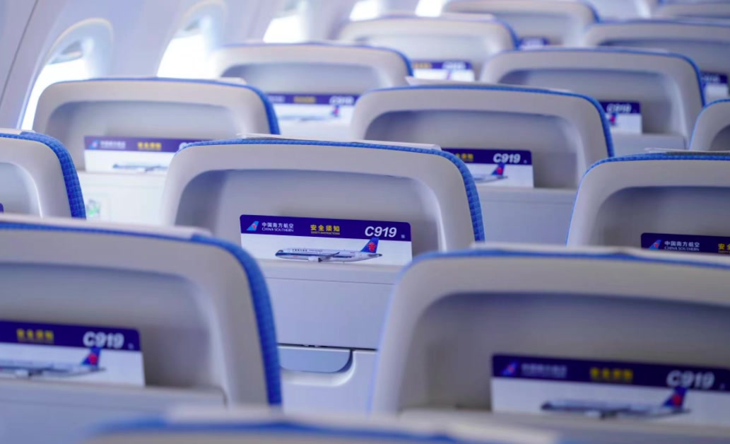 据了解,南航C919国产大飞机采用三舱布局模式,公务舱、明珠经济舱和经济舱共配置164个座位。其中公务舱座位8个,明珠经济舱座位18个,经济舱座位138个。各舱位均配备个人充电接口、杂志袋等多种实用设施,为旅客提供更多便利。南航C919采用下沉式行李架,边缘做弧形设计,天花板高2.25米,客舱过道48.26厘米,视觉上开阔宽敞。