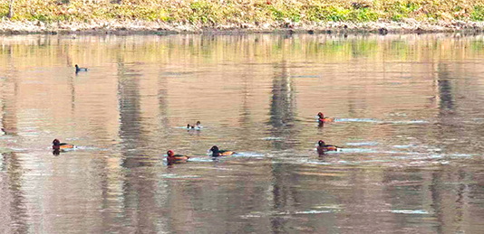 △国家一级保护动物青头潜鸭来到凉水河越冬,与白眼潜鸭混群栖息。北京生物多样性保护研究中心/供图