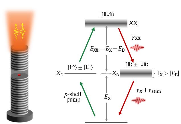 袁之良团队利用北京量子院建设的微纳加工平台,在围绕量子点量子光源研究的过程中发现,单个量子点可产出成对的光子源。通过进一步研究,团队还确认了“双胞胎”光子的辐射来源和激发路径。“我们制备了直径约两微米的微柱腔器件,实现量子点稳定处于腔体中央位置,让发出的光更容易被有效地引导与收集。”袁之良说,团队再将器件集成至面积不足1平方厘米的芯片内,并放置在接近绝对零度的极低温环境中开展后续实验。