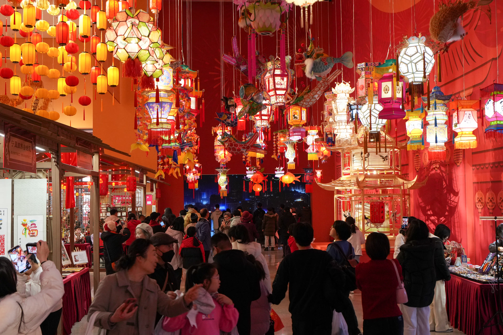在中国工艺美术馆、中国非物质文化遗产馆,来自各地的非遗花灯造型各异、流光溢彩。元宵节当天,该馆推出两项特色互动活动,邀请观众“智”闹元宵。馆内一层,一副妙趣横生的上联“响当当一马当先当仁不让”搭配横批“春风着意”,静候知音。观众可将书写的下联投入中央大厅北侧咨询台的“妙联箱”中,元宵节当天,馆方将精选30条优质下联,入选者可获得限定年节非遗好礼。此外,观众还可领取任务卡,在“过年——丙午春节主题展”展厅内寻找6件与“马”或“元宵节”相关的展品参与趣味答题,赢取丙午马年限定明信片和元宵节限定款冰箱贴。