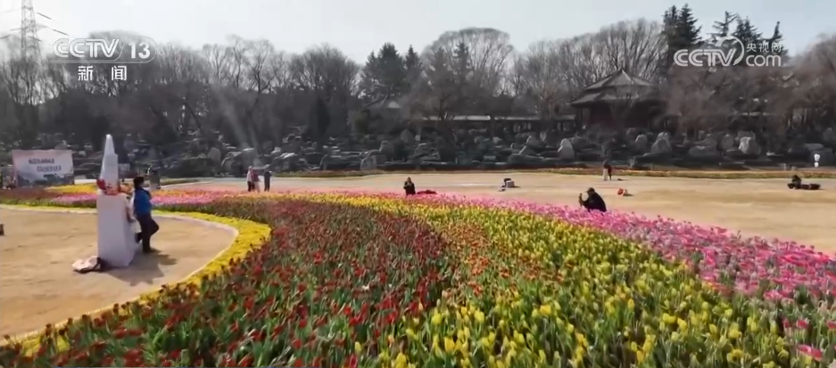 近日,在陕西西安,近20万株郁金香竞相绽放,市民游客徜徉花海,拍照打卡,感受春的气息。