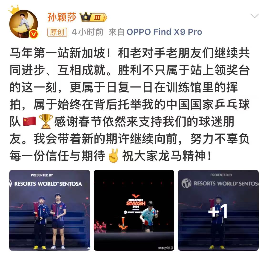 3月1日晚,孙颖莎夺得2026WTT新加坡大满贯冠军,赛后发博:马年第一站新加坡!和老对手老朋友们继续共同进步、互相成就。胜利不只属于站上领奖台的这一刻,更属于日复一日在训练馆里的挥拍,属于始终在背后托举我的中国国家乒乓球队。感谢春节依然来支持我们的球迷朋友。我会带着新的期许继续向前,努力不辜负每一份信任与期待,祝大家龙马精神!