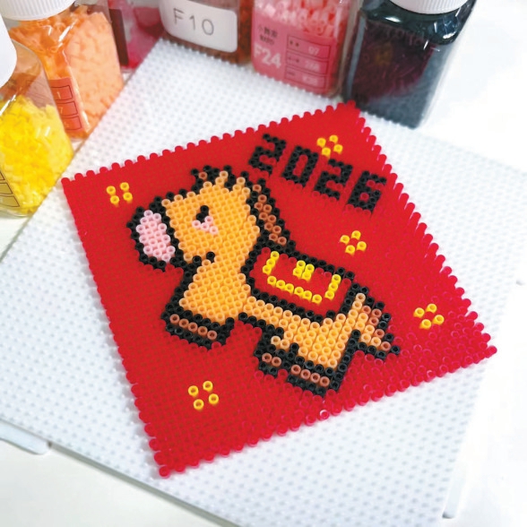 和钩织一起走红的是拼豆。这种以像素风格为主的手工,过去多用于制作卡通头像、装饰画,在2026年春节被赋予“年味”。有人用拼豆拼出大红福字、生肖图案,有人做出立体小灯笼,有人把它做成红包卡套、钥匙扣、桌面摆件。大家在网上分享图纸、交流配色、晒出成品,用这门被称作“新十字绣”的小手艺,拼出属于自己的新年仪式感。