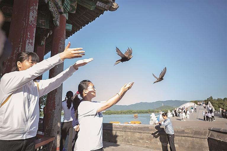 志愿者在北京颐和园放飞环志后的北京雨燕。徐谭摄/光明图片