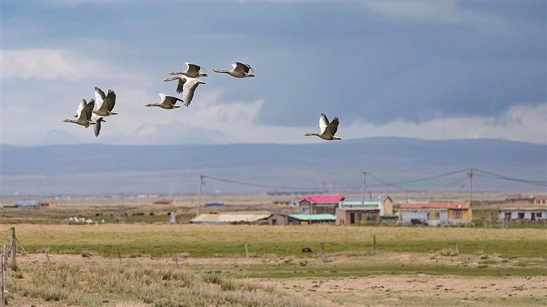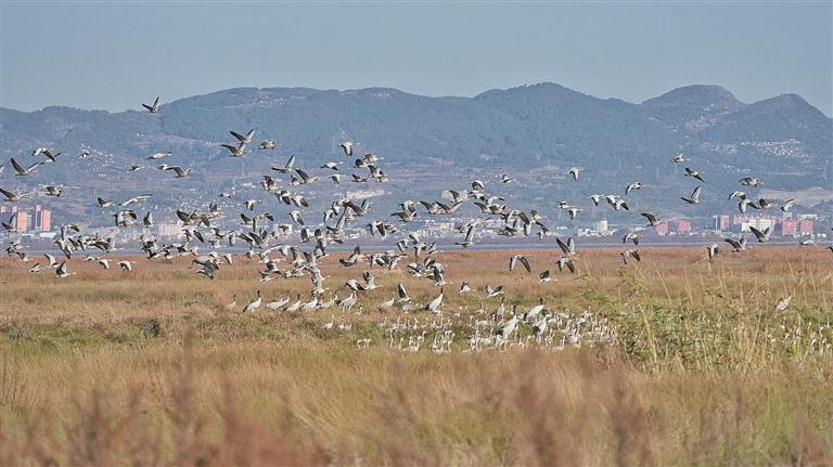 贵州威宁草海湿地,黑颈鹤和斑头雁等越冬候鸟翩跹飞舞。 徐谭摄/光明图片