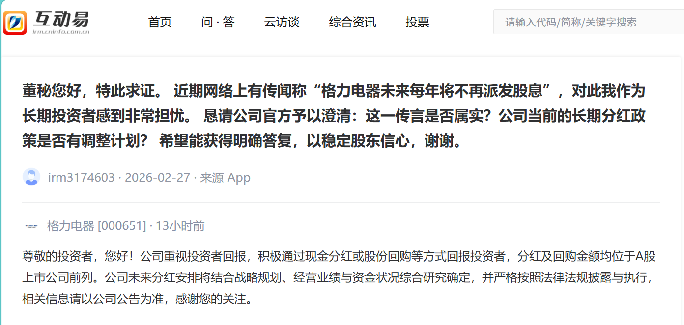 3月2日,格力电器在互动易平台上回应称:公司重视投资者回报,积极通过现金分红或股份回购等方式回报投资者,分红及回购金额均位于A股上市公司前列。公司未来分红安排将结合战略规划、经营业绩与资金状况综合研究确定,并严格按照法律法规披露与执行,相关信息请以公司公告为准。