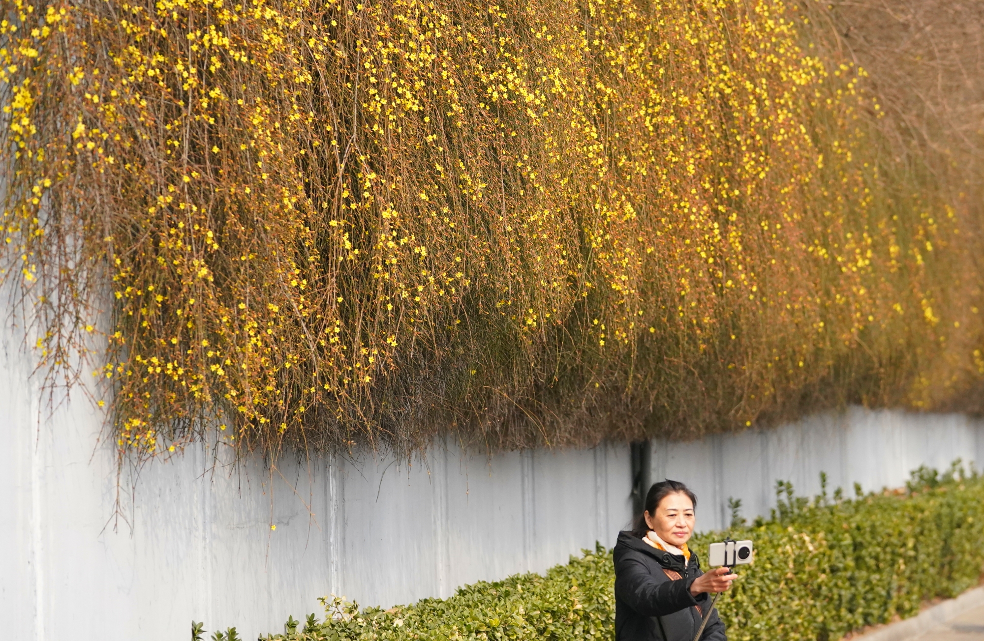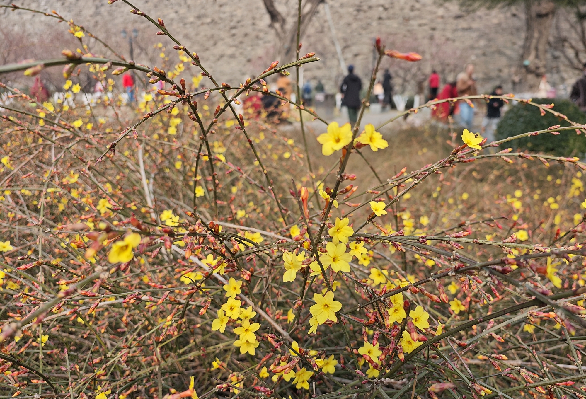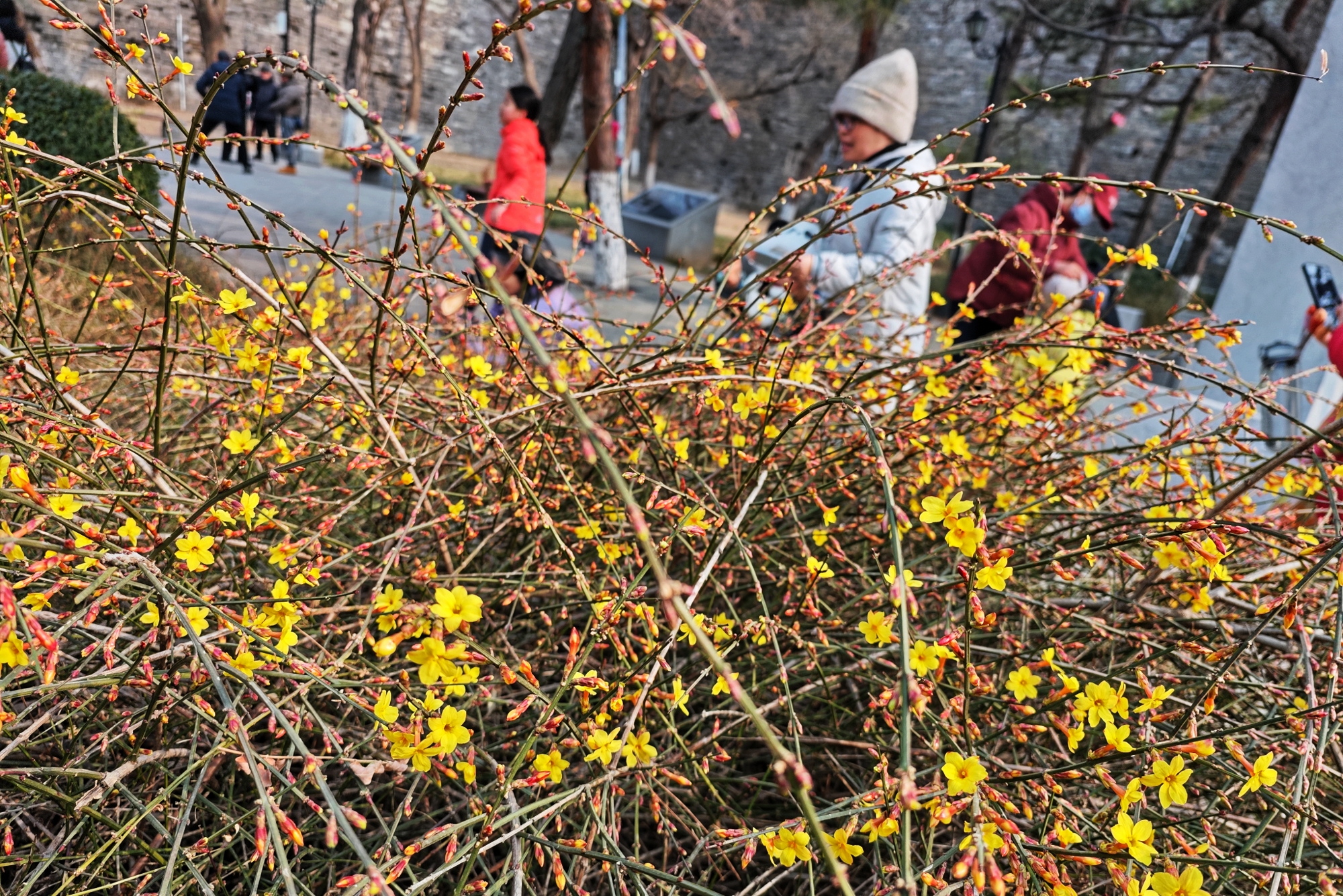 春风和煦间,迎春花或缀于枝头,或铺成花海,与古建筑轮廓相映成趣。不少市民闻讯而来,有的驻足花前细细观赏,有的举起手机、相机定格美景,还有游客特意打卡这处“金色瀑布”,记录下早春的第一抹亮色。