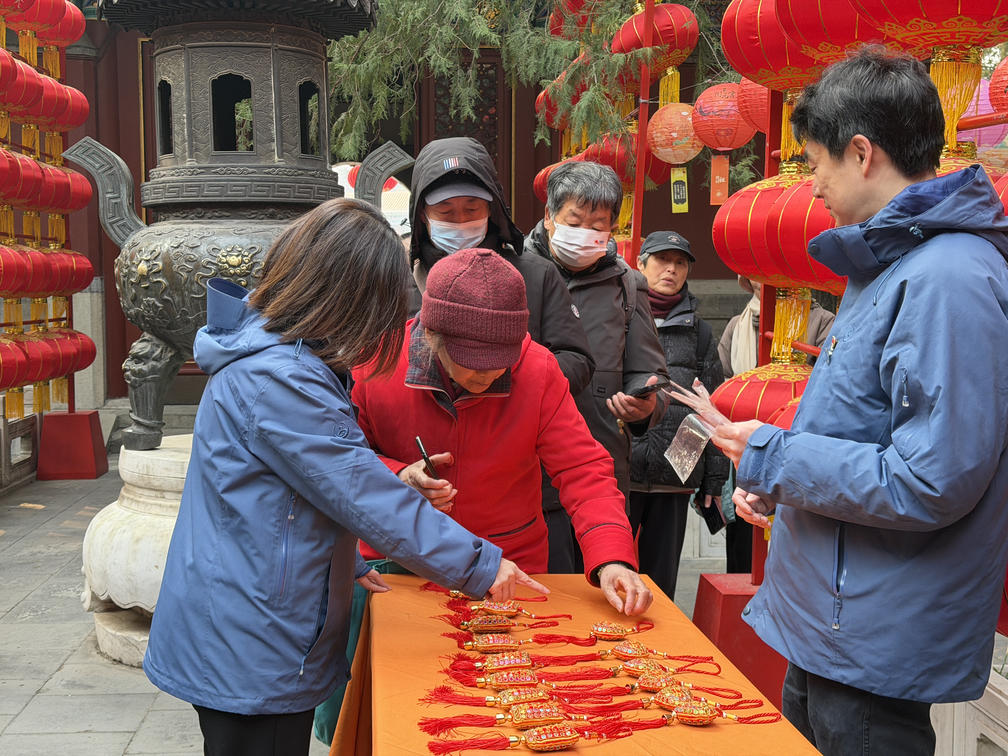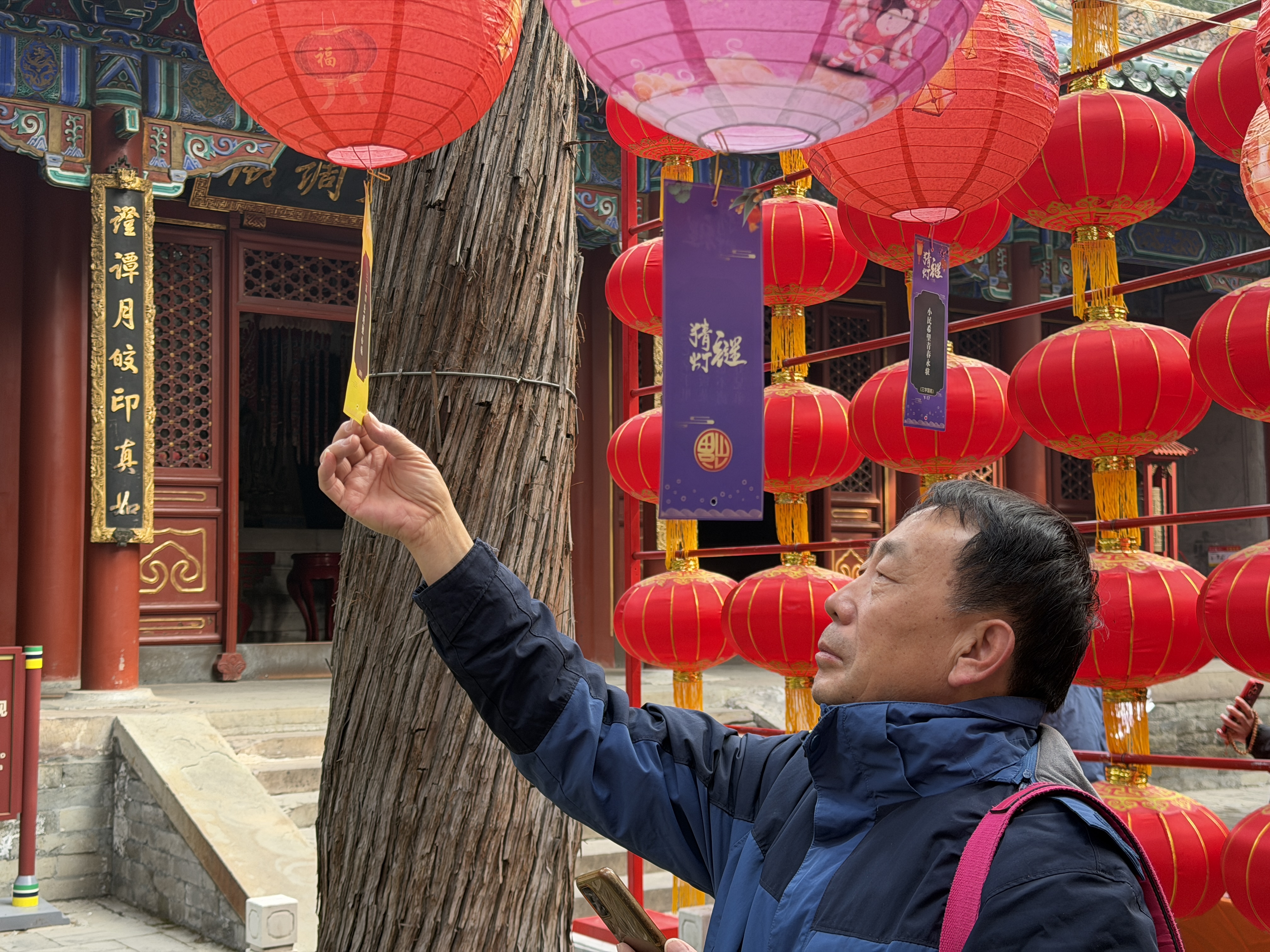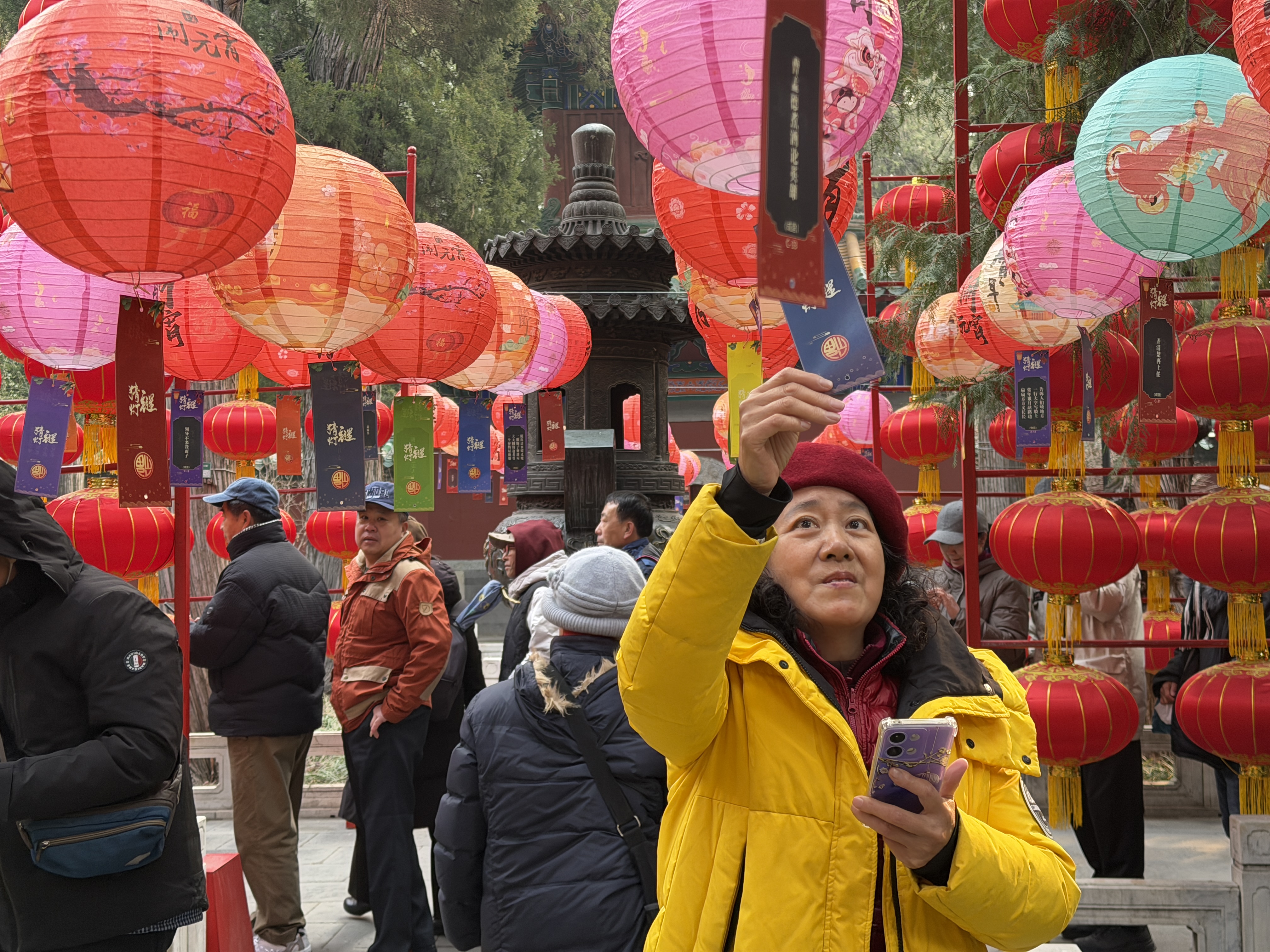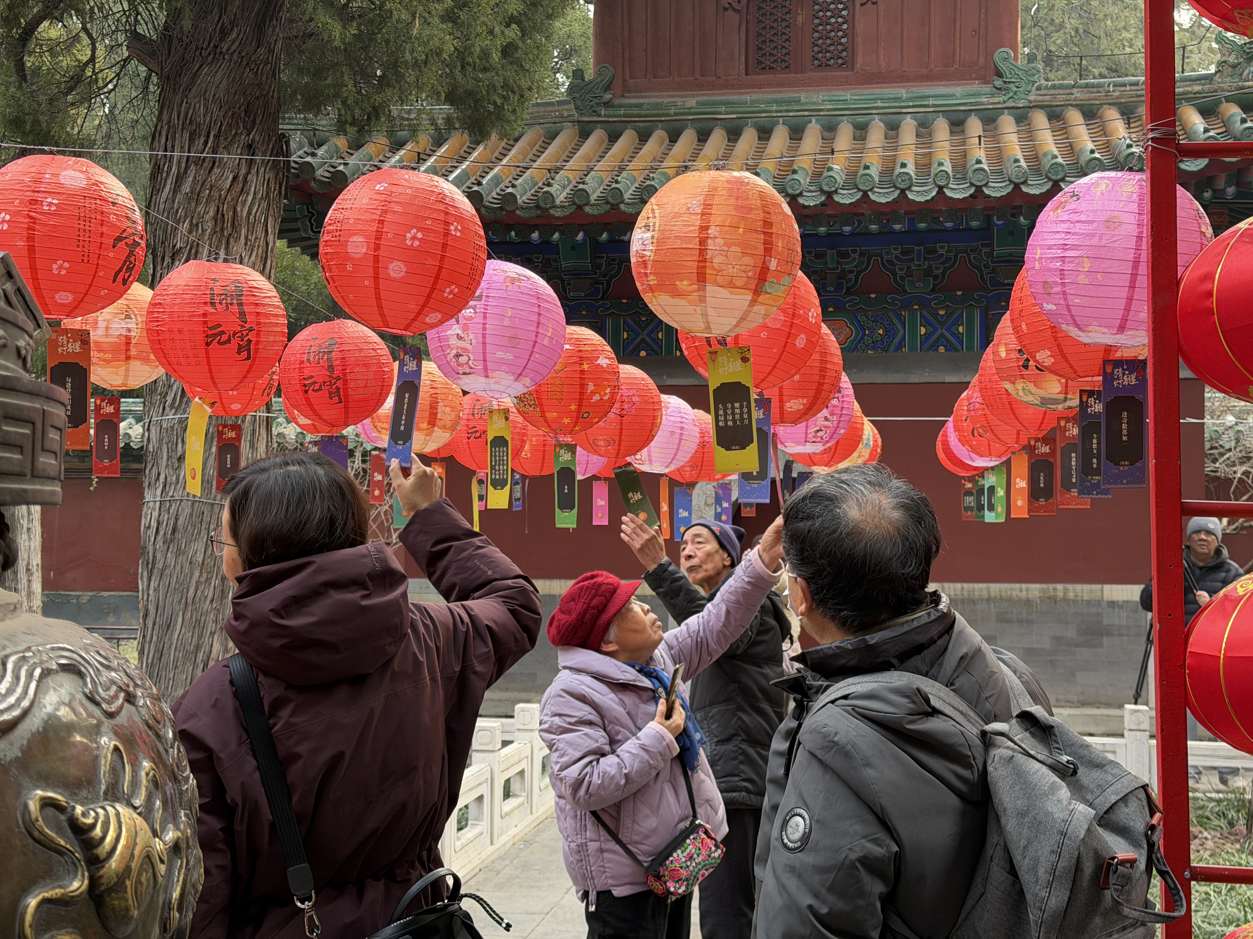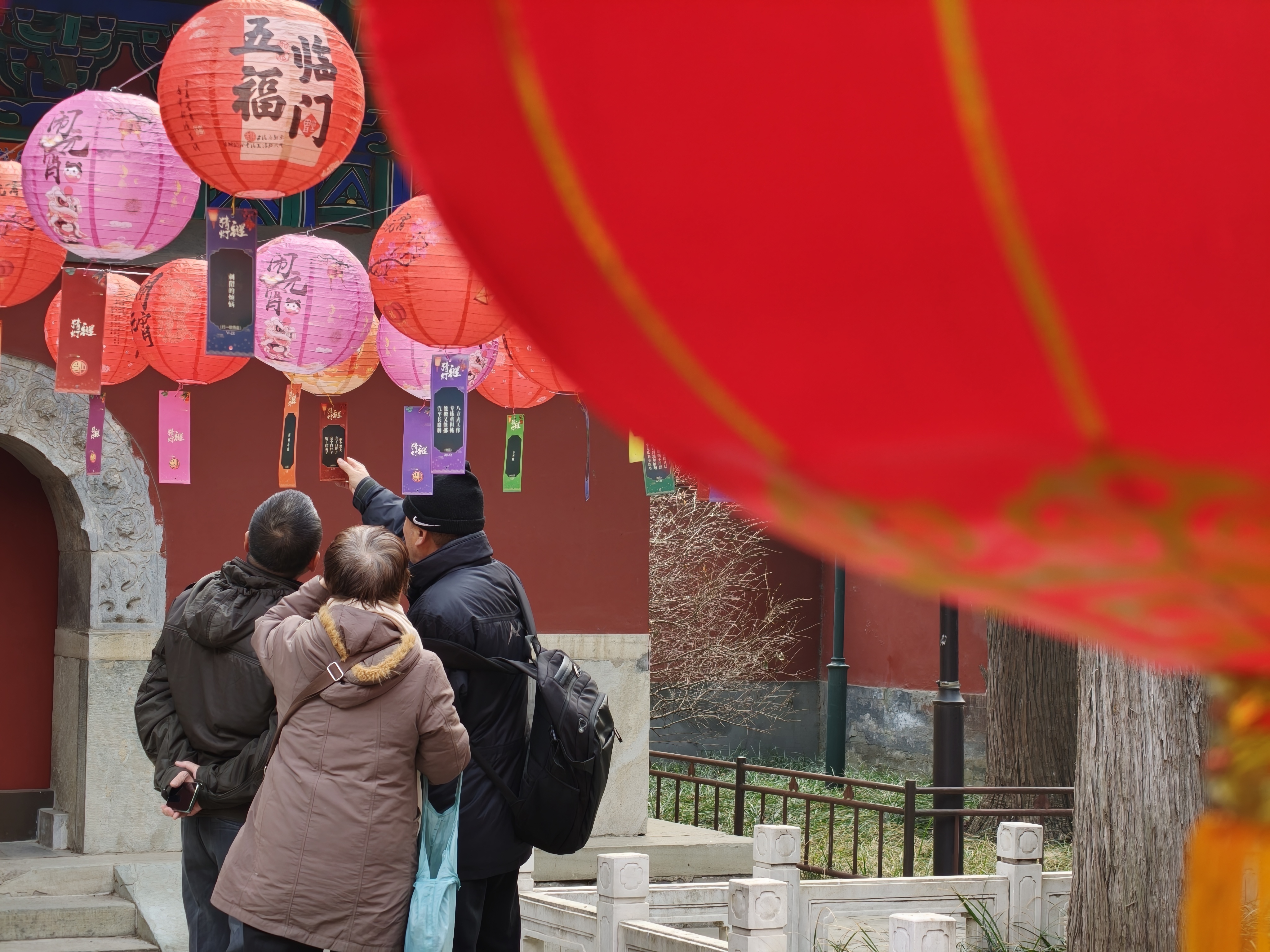 猜灯谜活动作为北海公园元宵节传统活动,今年主题为“北海·圆”,是“福满北海·马跃新程”春节系列活动的收官环节。活动在永安寺内布置九行五列灯笼,意为美好寓意长长久久五福临门。此次灯笼阵安排了一盏特殊图案灯笼,猜对该灯笼对应灯谜的游客有神秘礼物。活动现场市民游客乐在其中,感受元宵佳节氛围。