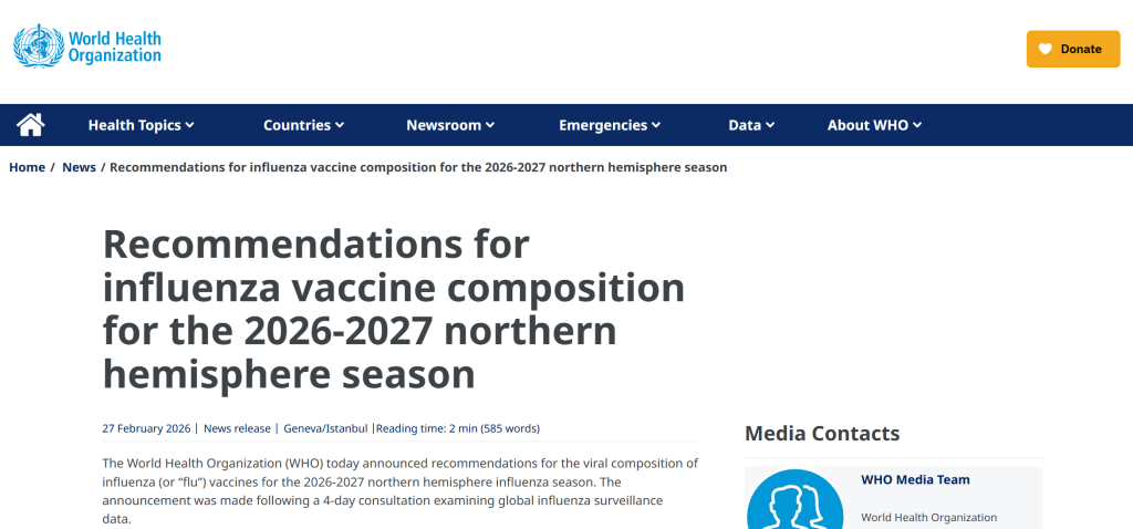 2月27日,世界卫生组织(WHO)发布《2026-2027年北半球流感季节流感疫苗推荐成分》报告,其中三价疫苗覆盖的A(H1N1)pdm09、A(H3N2)、B/Victoria三大亚型组分全部完成更新,同时正式剔除已多年无全球自然流行的B/Yamagata系毒株,推荐北半球优先使用三价流感疫苗。