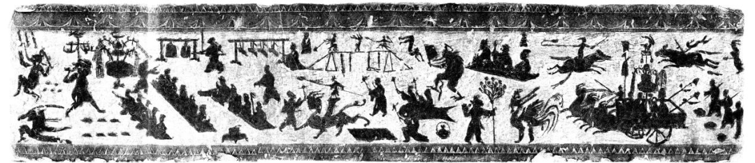 乐舞百戏汉画像石出土于沂南北寨汉墓,定格汉代顶级综艺:飞剑跳丸、七盘舞、十七人乐团、马戏倒立,2008年奥运马术金币图案灵感源于此。