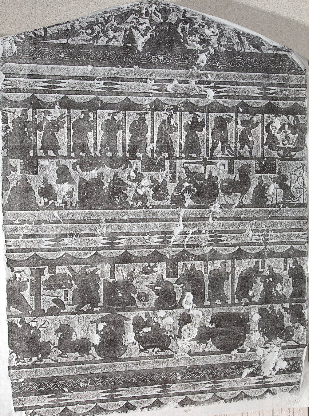 武梁祠西壁汉画像石高184厘米,平面浅浮雕,分五层刻神话、帝王、孝道、刺客、车骑,堪称汉代社会百科全书。