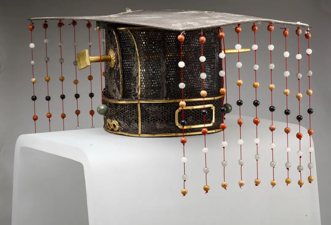 九旒冕出土于鲁荒王朱檀墓,藤篾编制镶金饰,前后垂9道旒缀162颗五色玉珠,玄紞垂黄玉充耳,形制庄重,是明代珍贵冠饰。