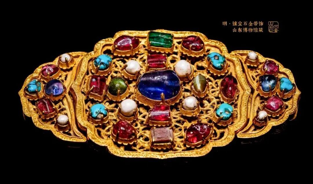 镶宝石金带饰为鲁王朱檀之物,金质如意云头形,镶嵌33颗各类珍贵宝石,色彩斑斓,彰显出古代贵族的尊贵身份与地位。