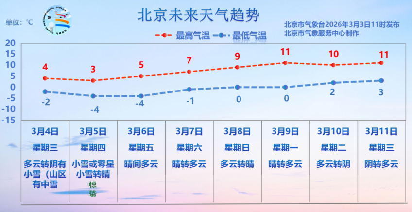 4日白天:多云转阴,有小雪;北转东风2、3级;平原地区最高气温4℃,山区最高气温1~4℃;最小相对湿度40%。